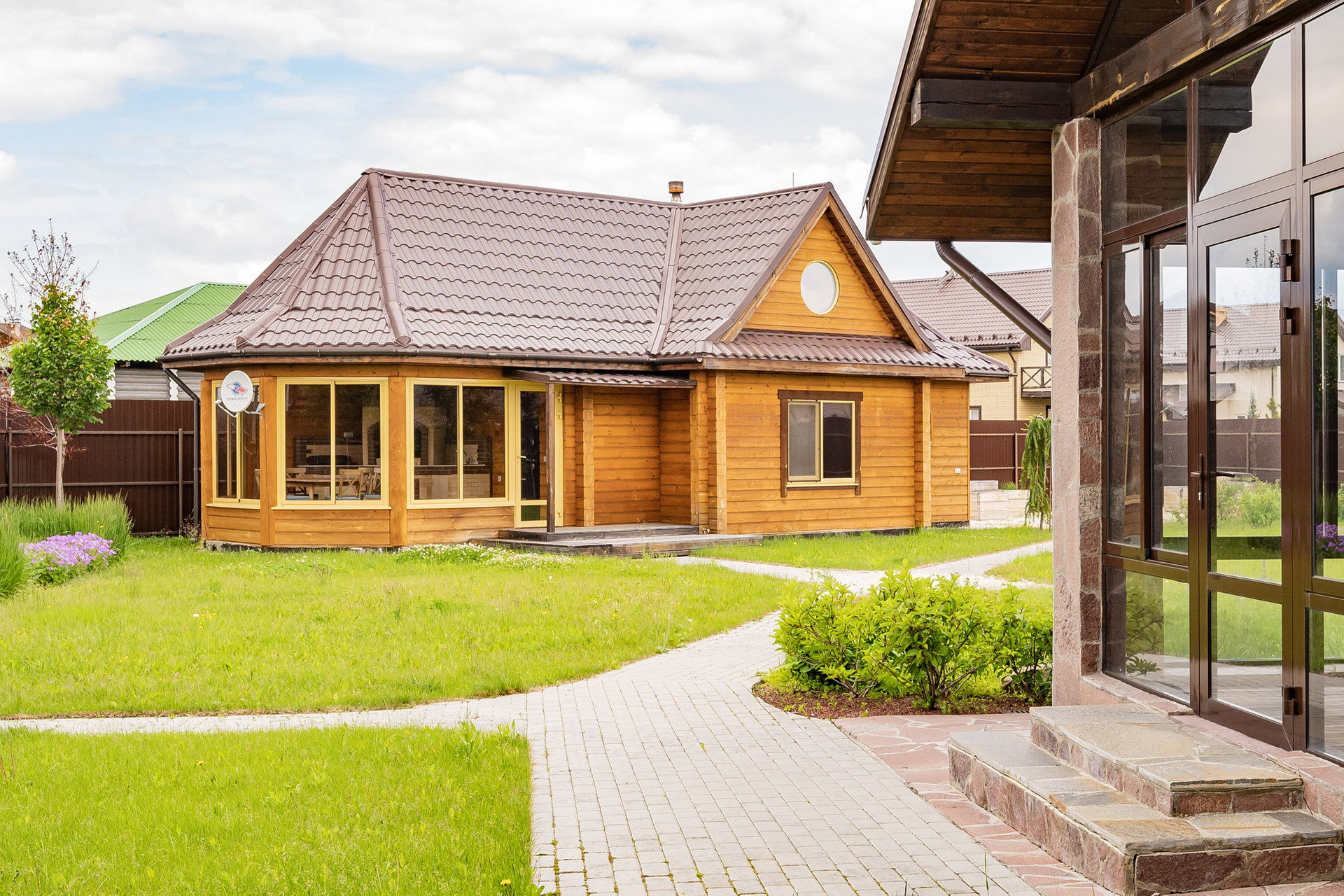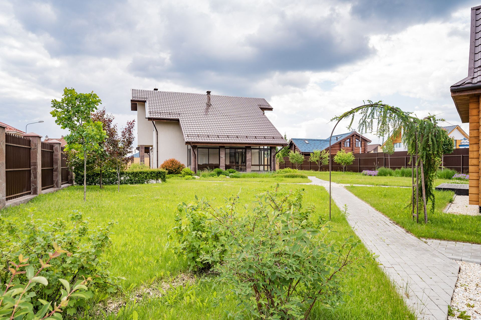 На участке (13 соток) сделан ландшафтный дизайн, растут плодовые деревья и декоративные кустарники, мини огород в японском стиле, газон, вымощены дорожки декоративным камнем.