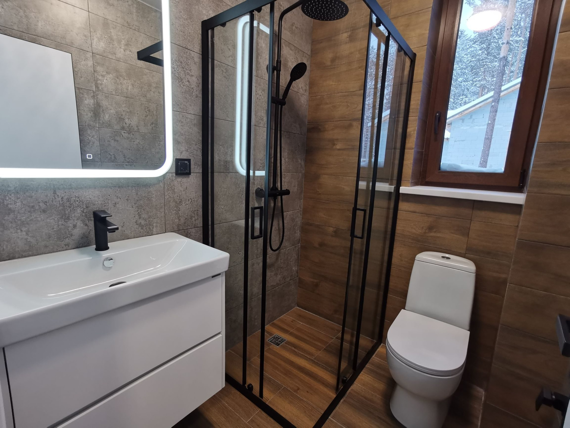 - 3 санузла, один из которых находится в мастер-спальне, и по одному на каждом этаже. 2 санузла оборудованы душевой ширмой, а 1 санузел - ванной. Установлены термостатичные смесители с поддержкой заданной температуры.