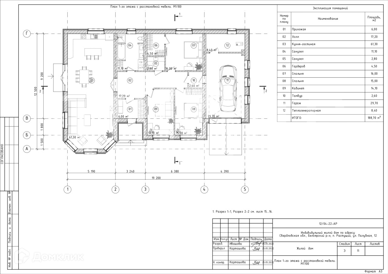 Дом из качественных материалов, с планировкой: три жилые комнаты по 16 кв.м, 15 кв.м. и 14 кв.м., кухня-гостиная 61,3 кв.м. санузлы 11 кв.м. и 2,8 кв.м., котельная - 8,4 кв.м., холл-17,2 кв.м., гардероб 4,5 кв.м., гараж 30 кв.м.
