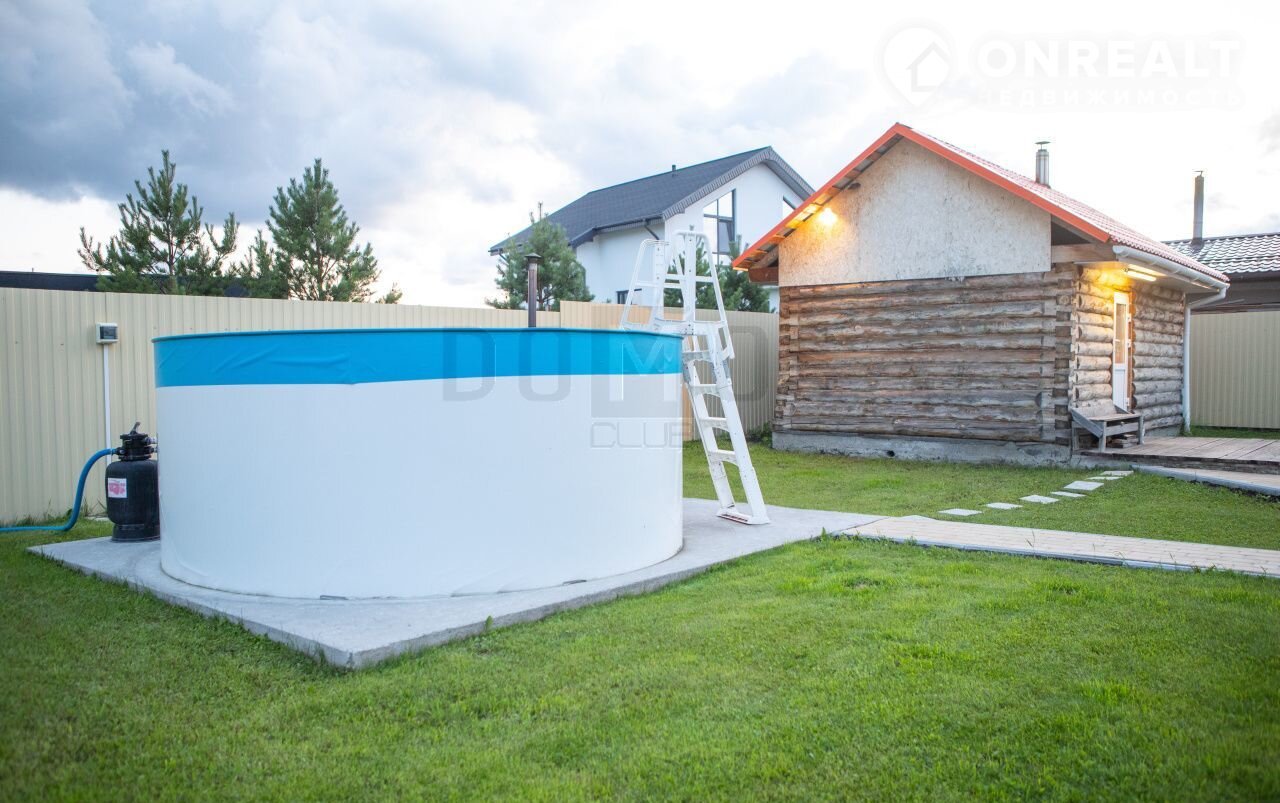 Установлен бассейн на 14 куб. с фильтрацией, подогревается дровяной печью, установлен на бетонной плите.