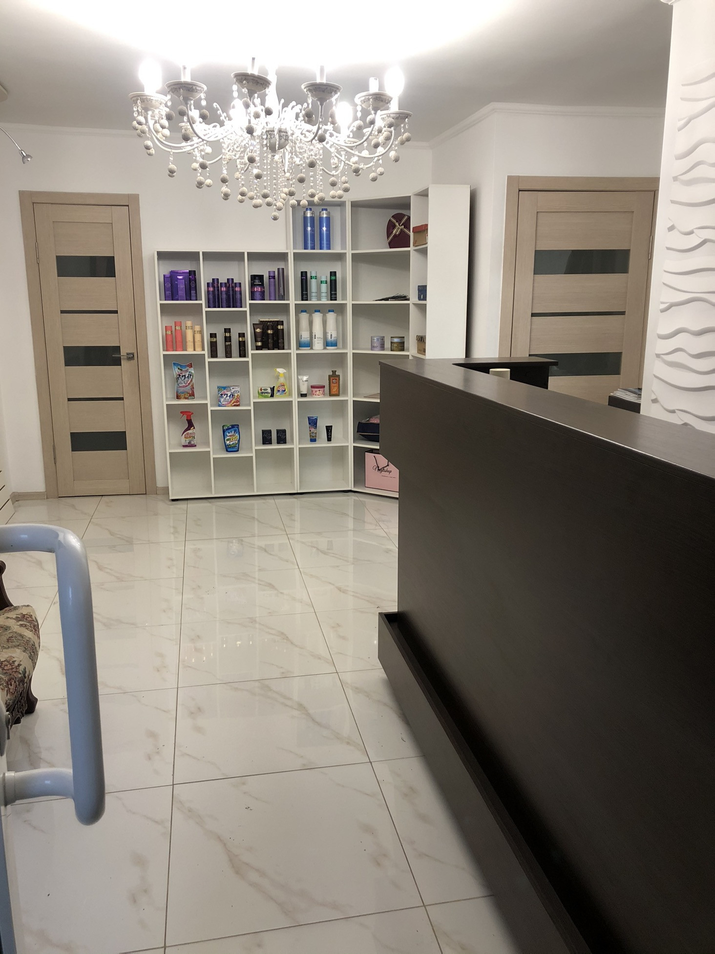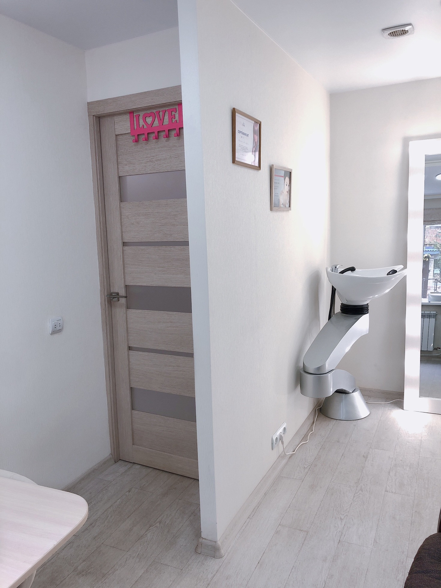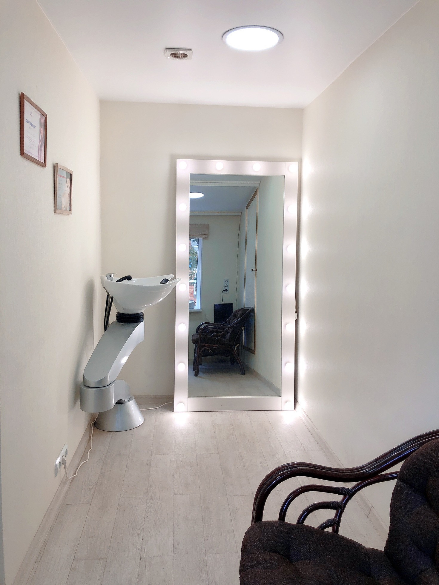 Планировка: ресепшн с зоной ожидания, кабинет ногтевого сервиса, зона стилистов, мойка, отдельно кабинет солярий, санузел.