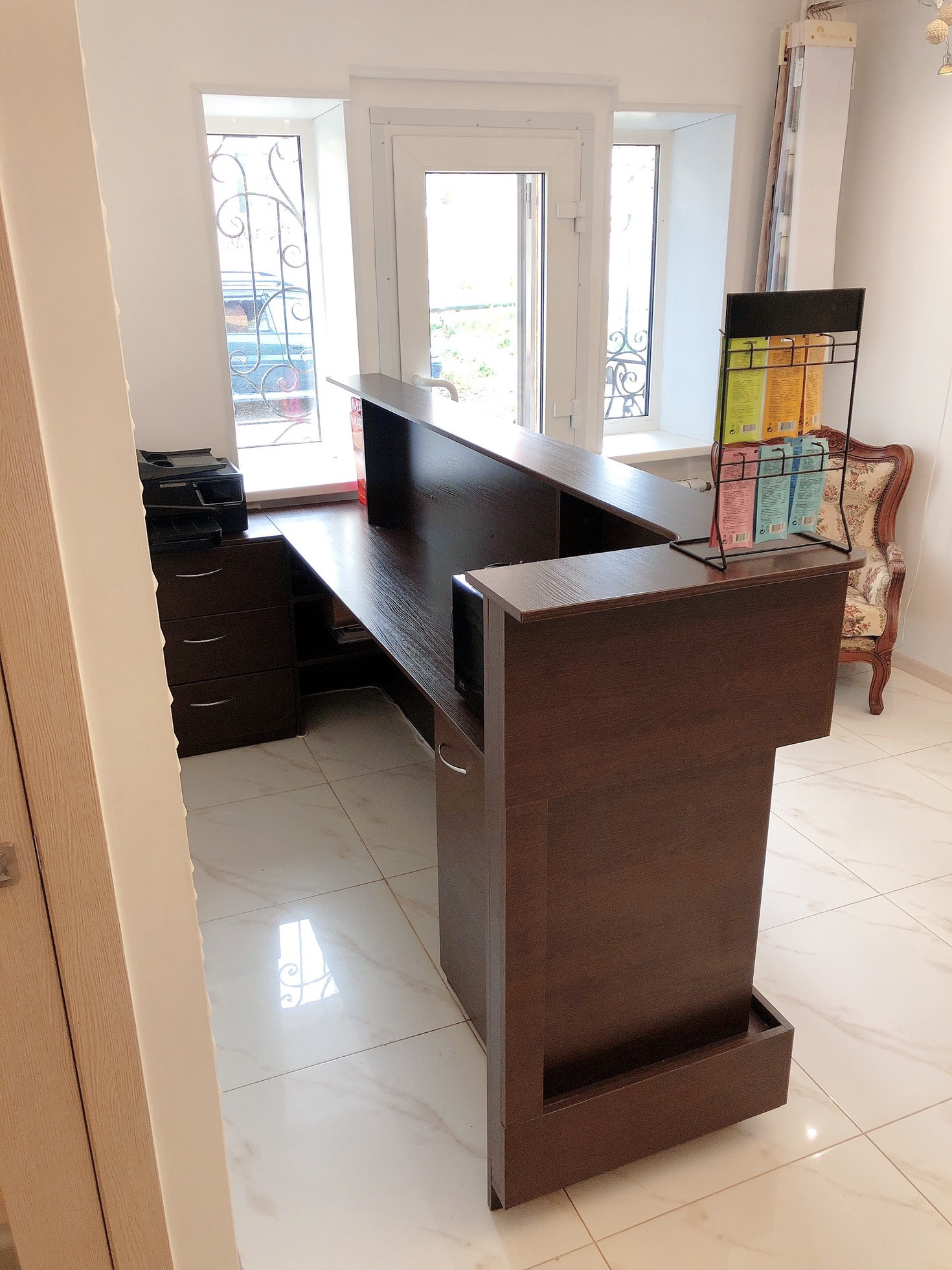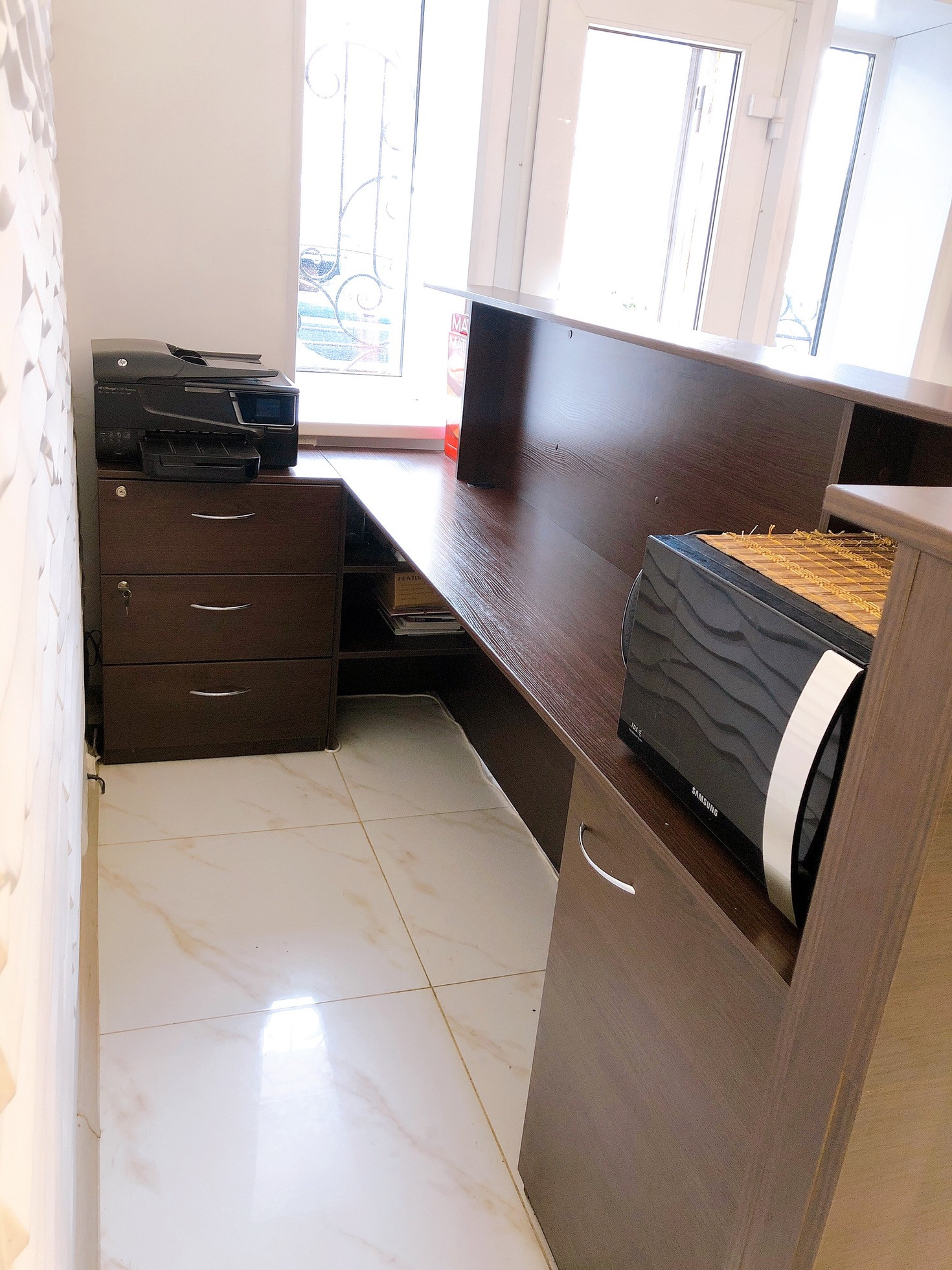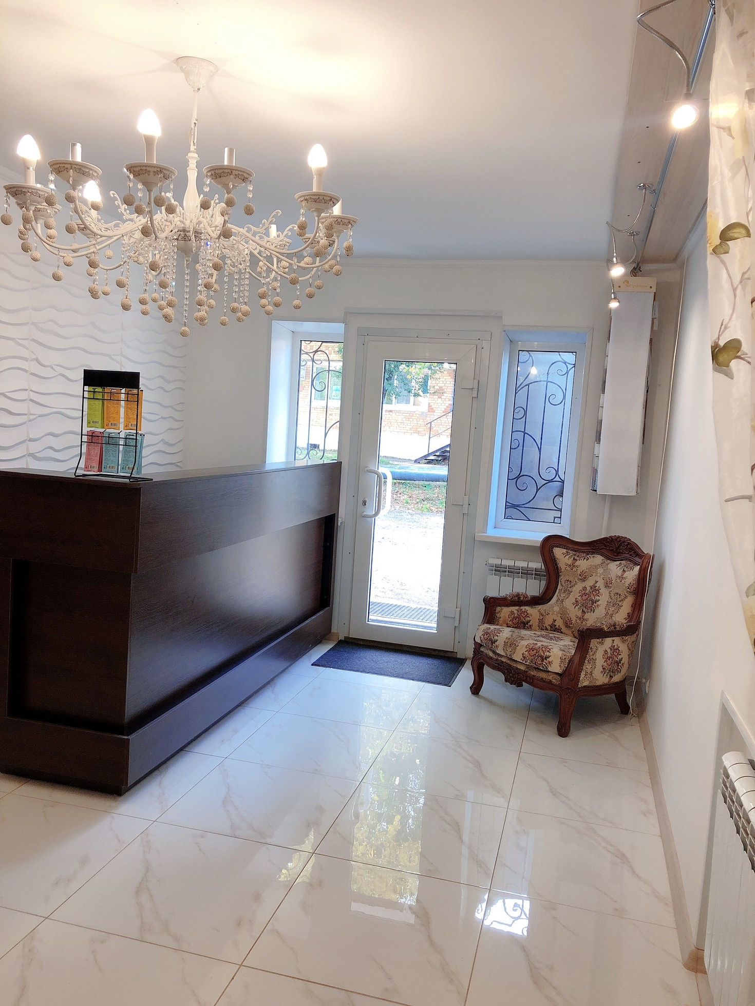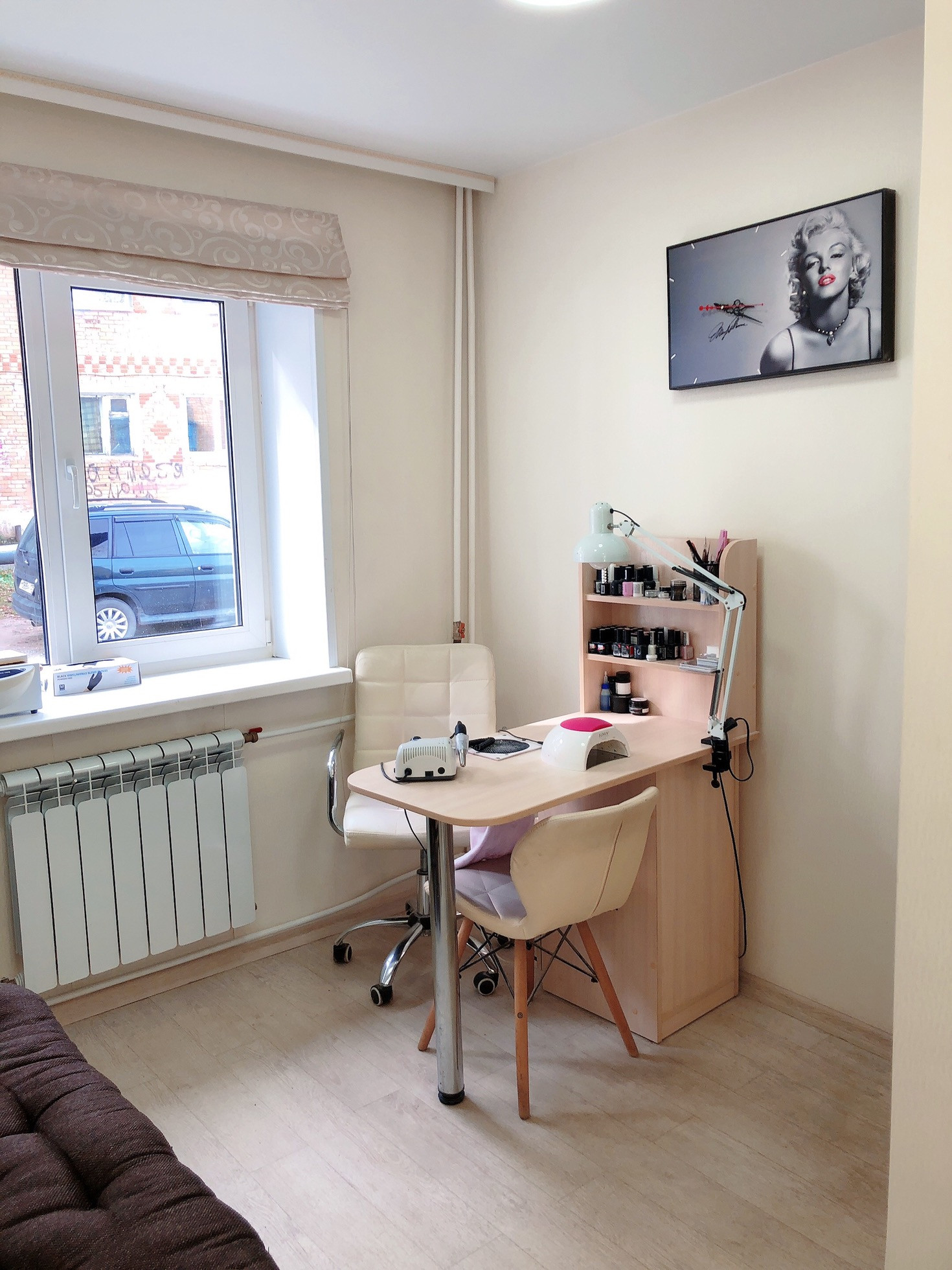 Планировка: ресепшн с зоной ожидания, кабинет ногтевого сервиса, зона стилистов, мойка, отдельно кабинет солярий, санузел.