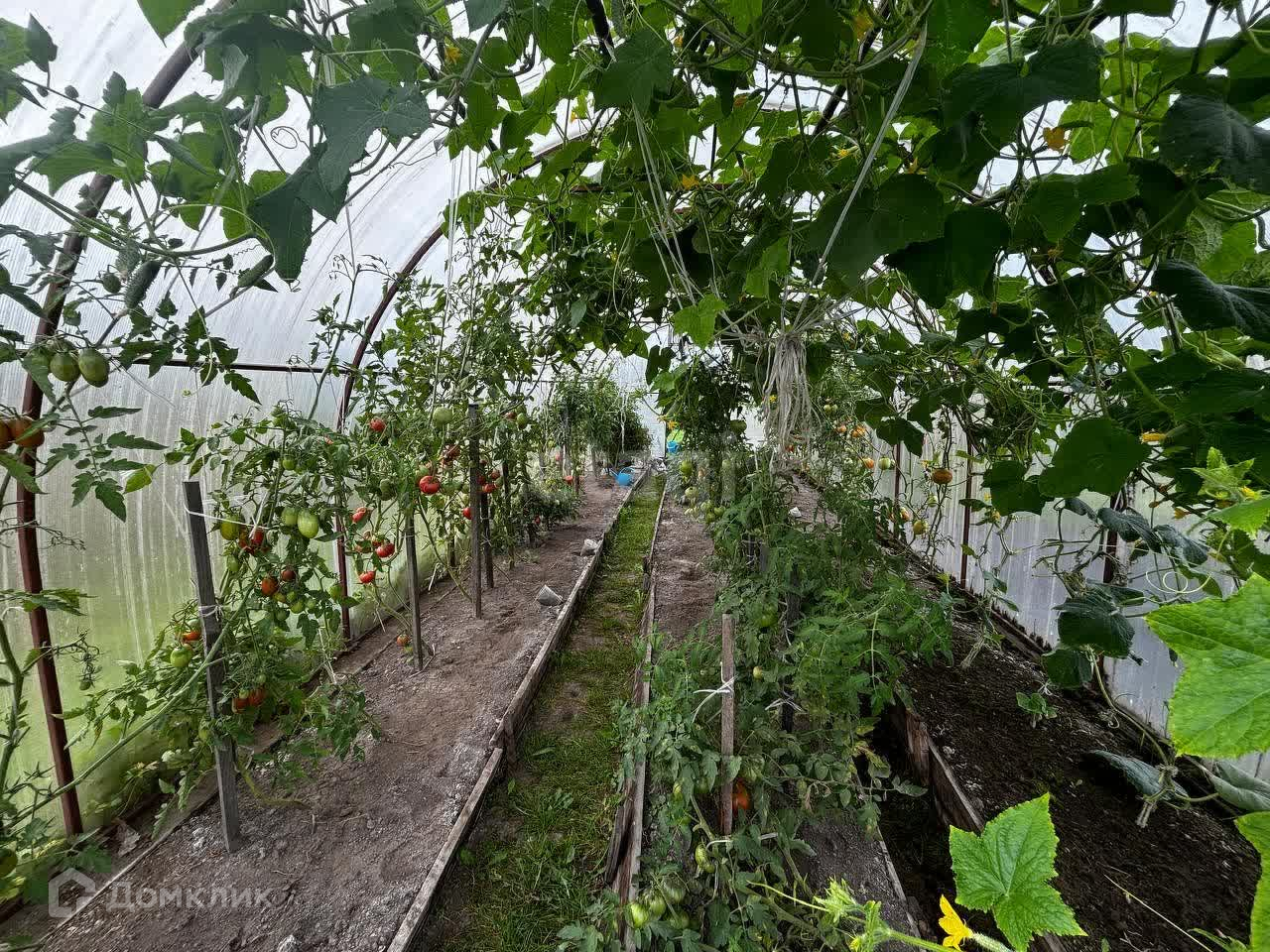 В огороде много кустов малины, виктории. Установлена большая теплица .