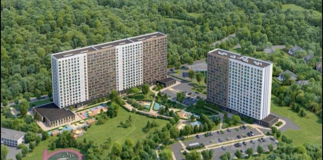 Жилой комплекс с объектами социальной и транспортной инфраструктуры. Рядом лес.