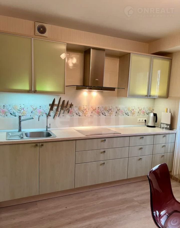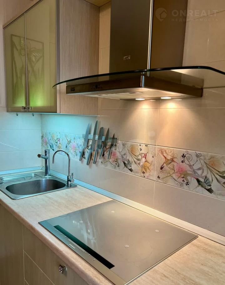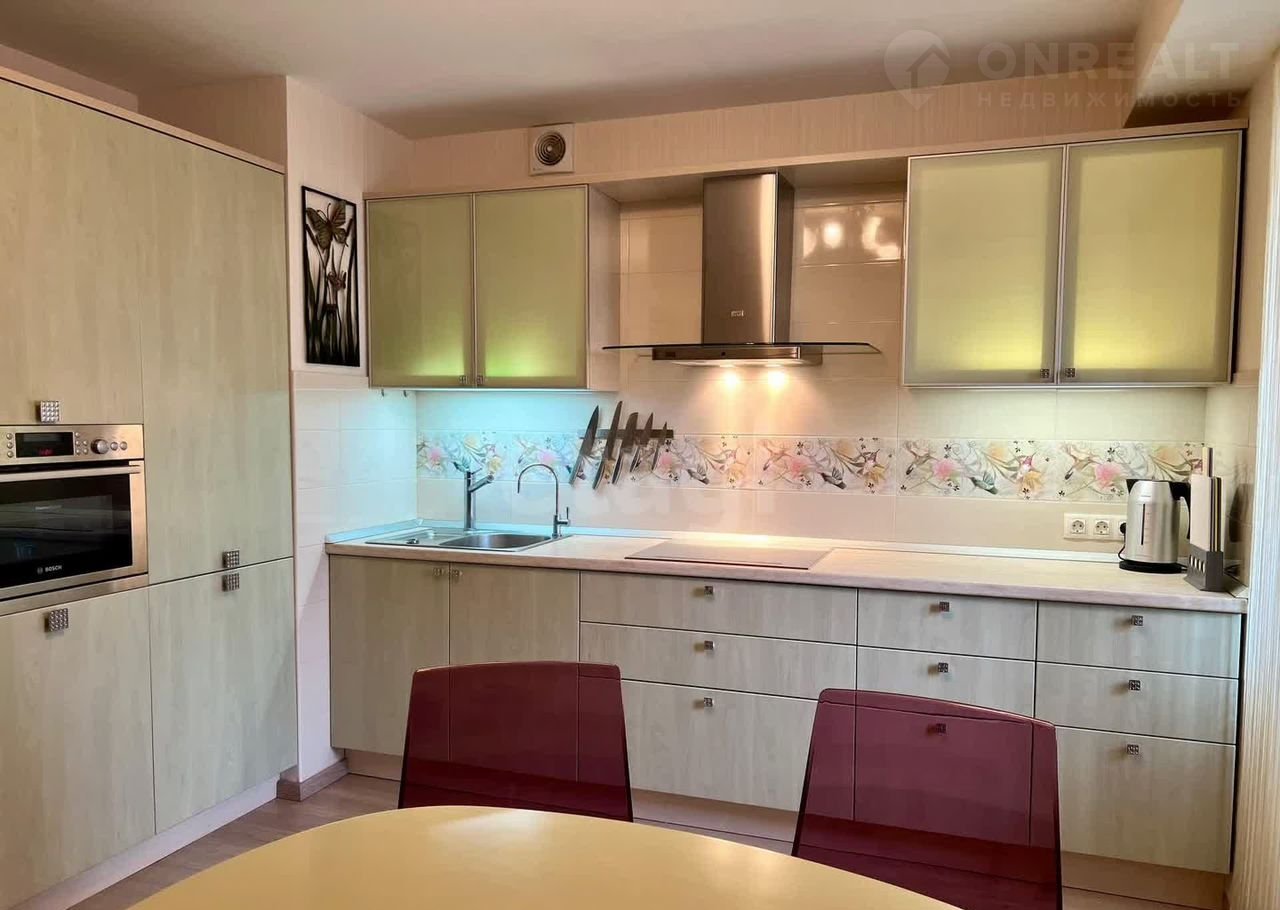 На кухне – полный набор техники: индукционная плита, дизайнерская вытяжка с подсветкой, встроенные холодильник, духовой шкаф/микроволновка, посудомоечная машина, фильтр для питьевой воды.