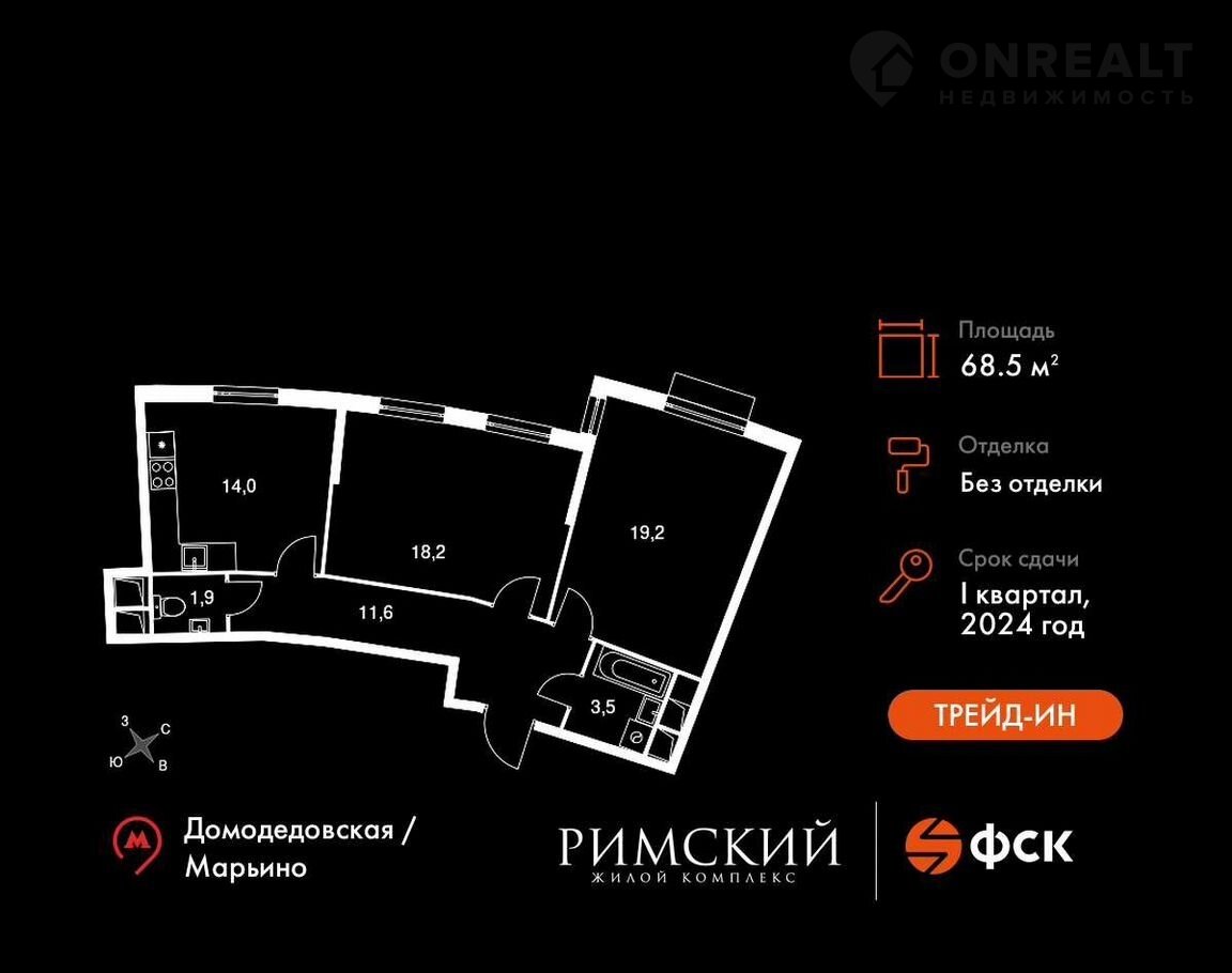 2-комнатная квартира, 68.5 м2, этаж 12 / 12, на продажу в посёлке Развилка, Римский проезд, 5