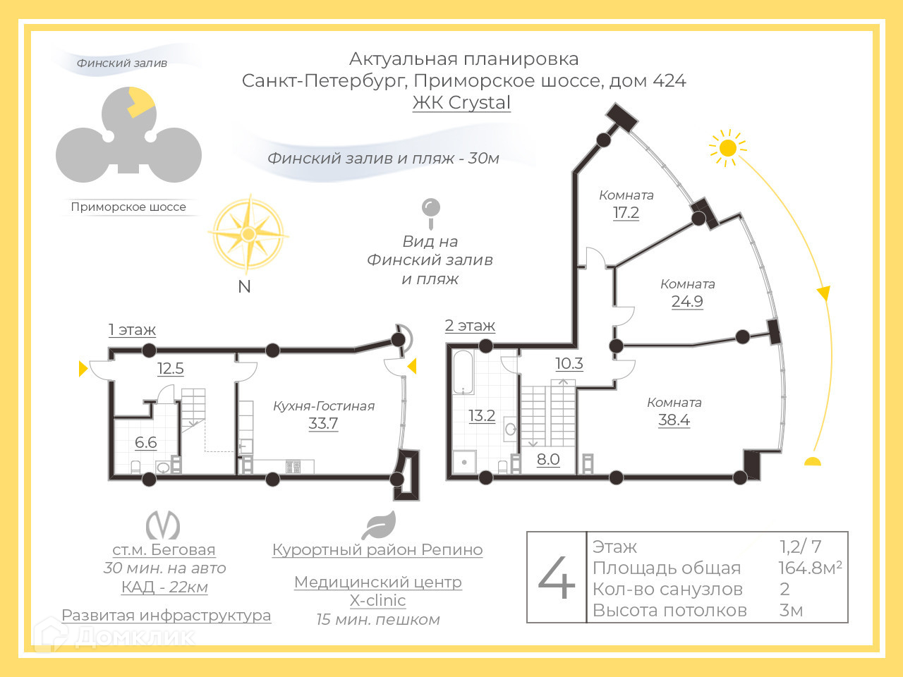 Объект представляет собой двухуровневые 4 еврокомнатные апартаменты с площадью 164,8 кв.м. в элитном ЖК “Кристалл”. На первом этаже располагается с/у, кухня-гостиная с выходом на общую террасу. Второй этаж включает в себя 3 изолированных комнаты, отдельный с/у с сауной. Все без исключения окна являются панорамными (от пола до потолка). Высота потолков 3 метра, что в совокупности с южным расположением окон наполняет каждое жилое помещение большим количеством солнечного света.