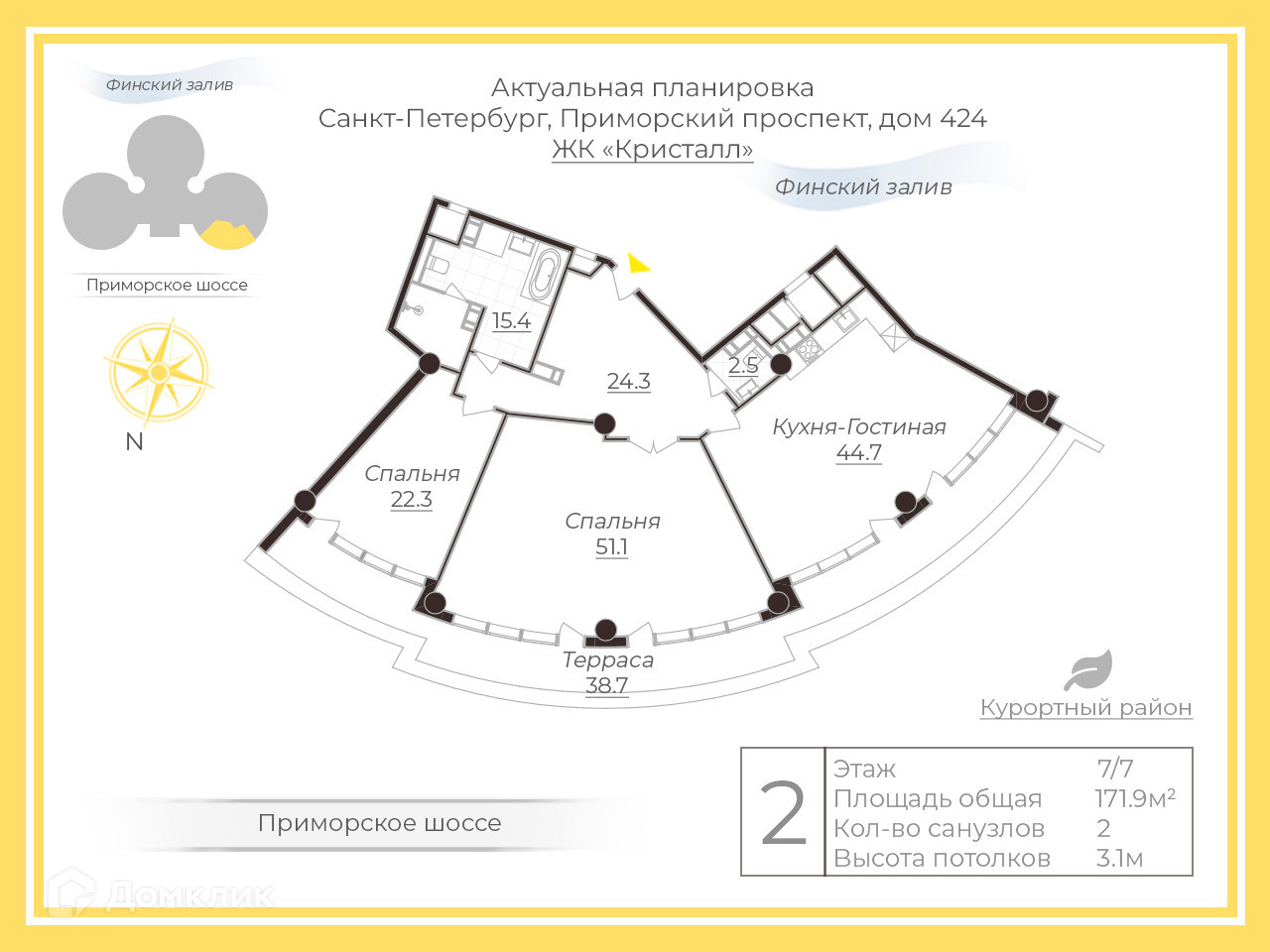 3-комнатная квартира, 161 м2, этаж 7 / 7, на продажу в посёлке Репино, Приморское шоссе, 424