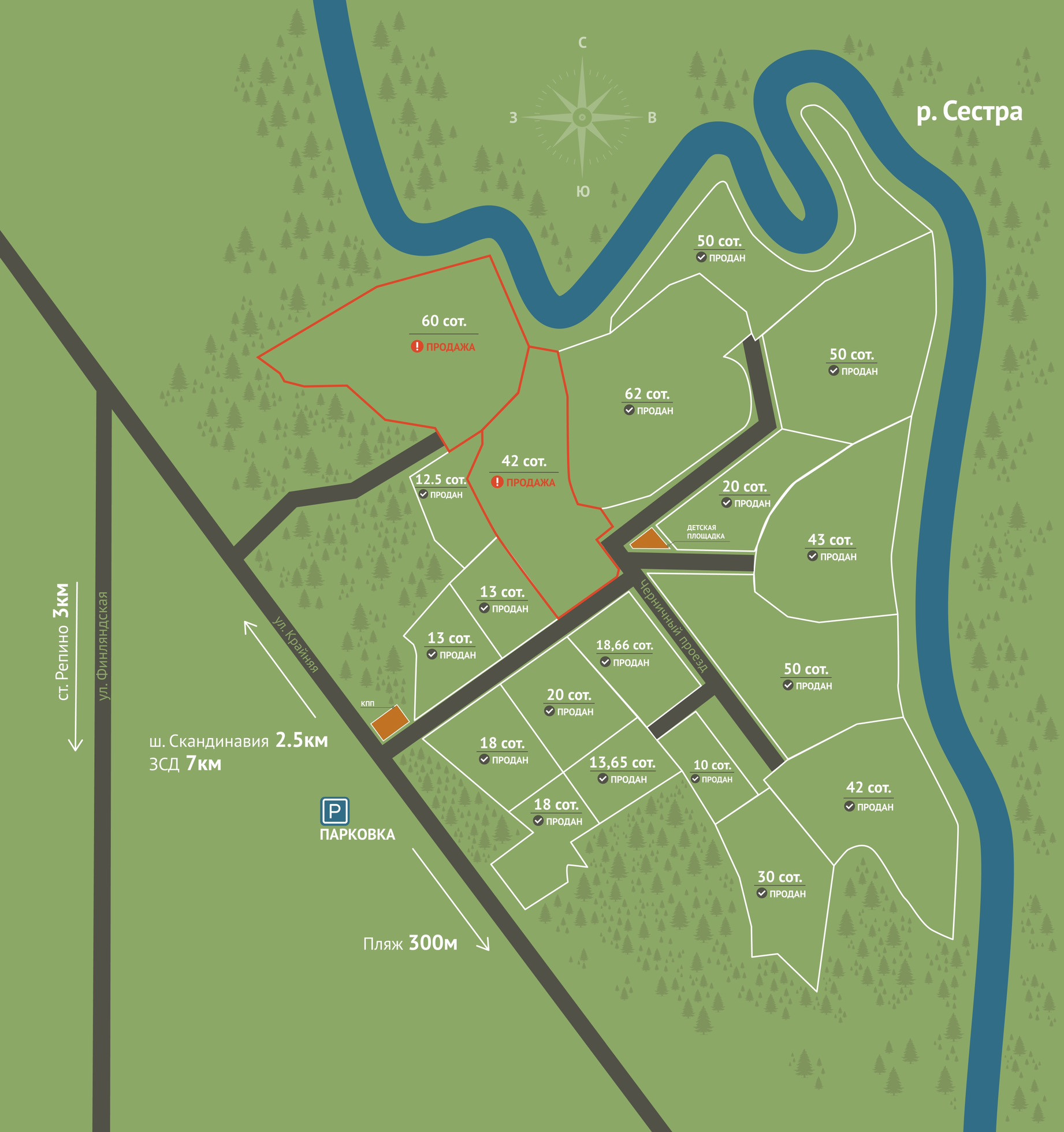 Поселок расположен в красивейшем и престижном месте Курортного района (Репино-Ленинкое), в 3-х км от ж/д станции Репино, в 2-х км от трассы "Скандинавия" и в 18 км от КАД. До Ушаковской развязки по ЗСД на а/м ехать 30 минут. К участку построена асфальтированная дорога, выделено 75 квт.(возможно увеличение), освещение внутри посёлка, интернет и магистральный газ (25 кубов).
