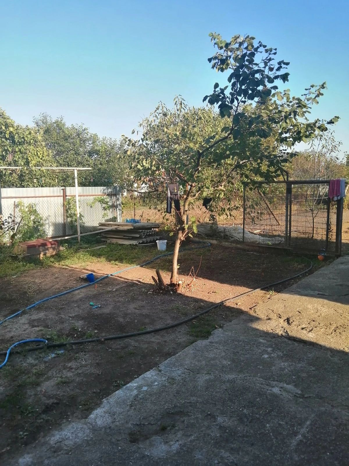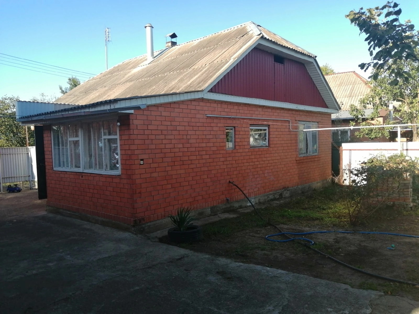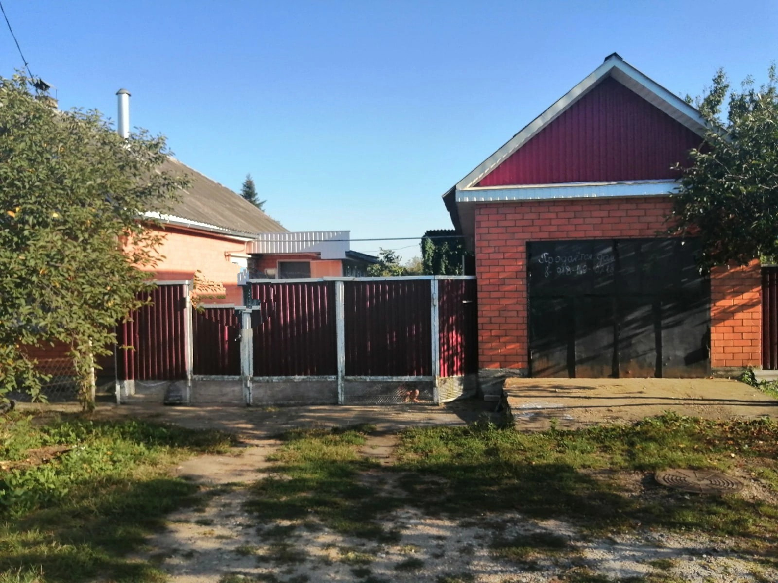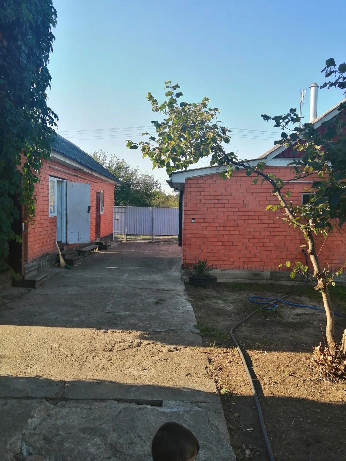 Двор забетонирован, забор из профнастила. Широкий фасад, большая придомовая территория.
