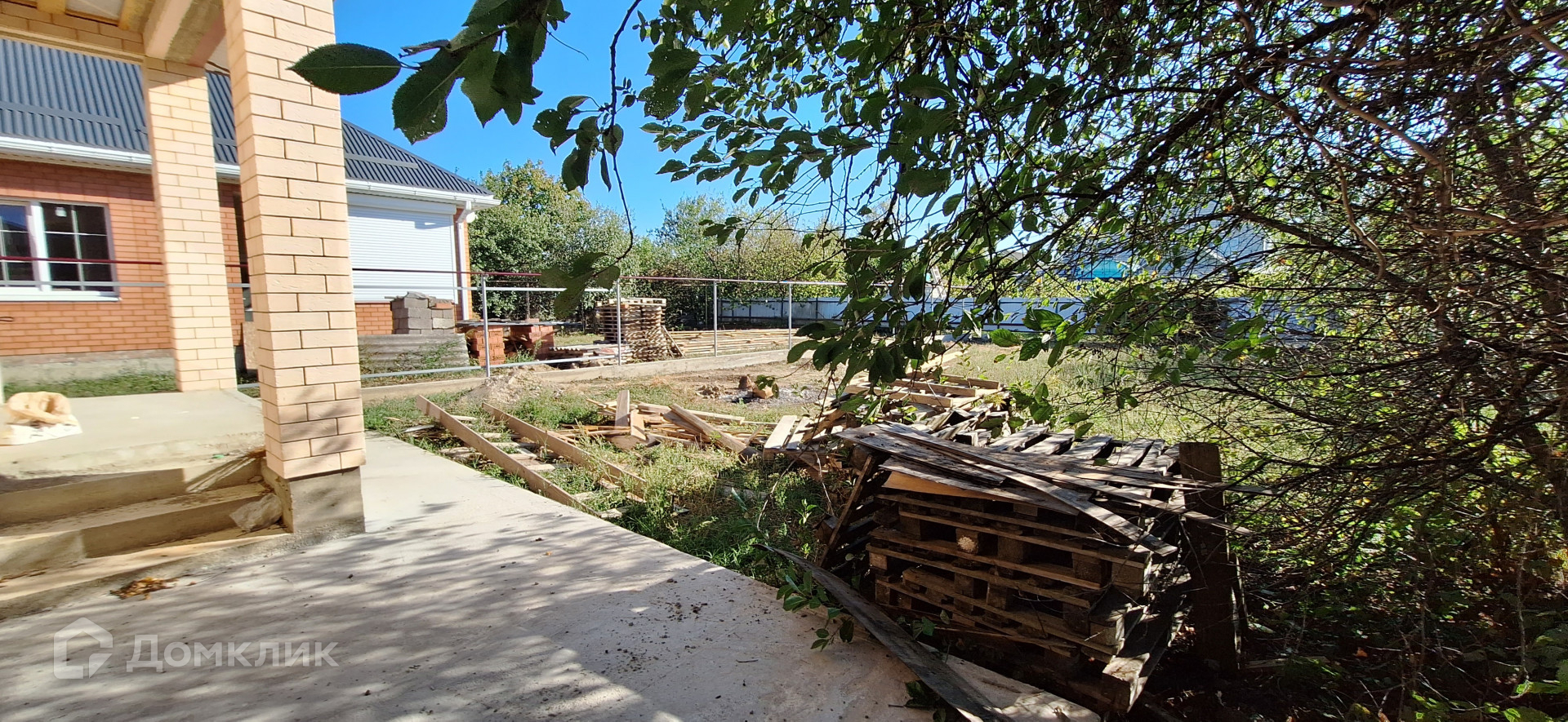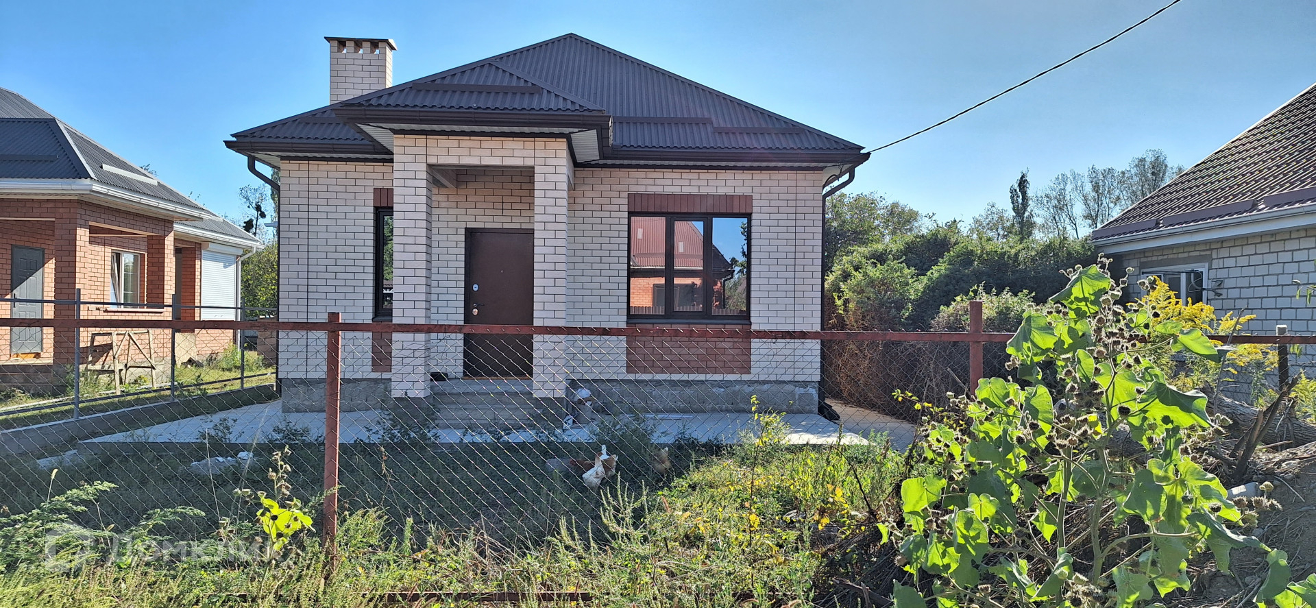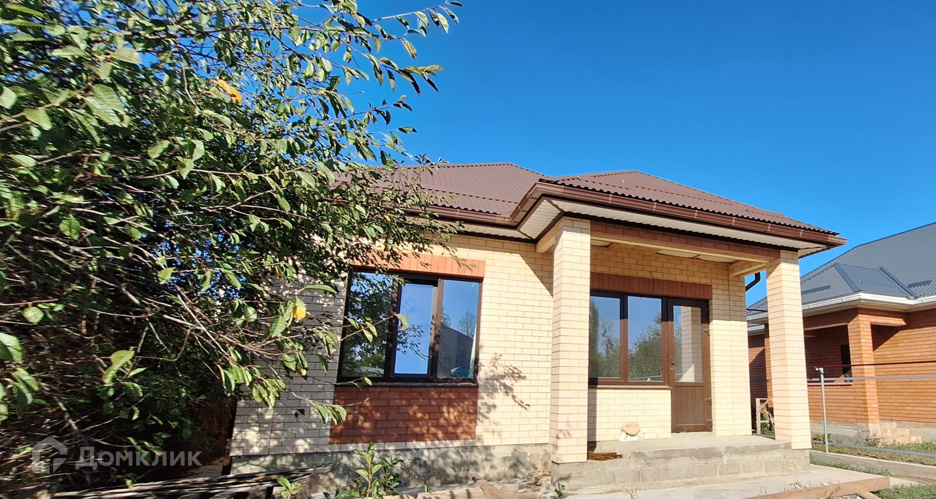 Дом построен из блока, облицован кирпичом.