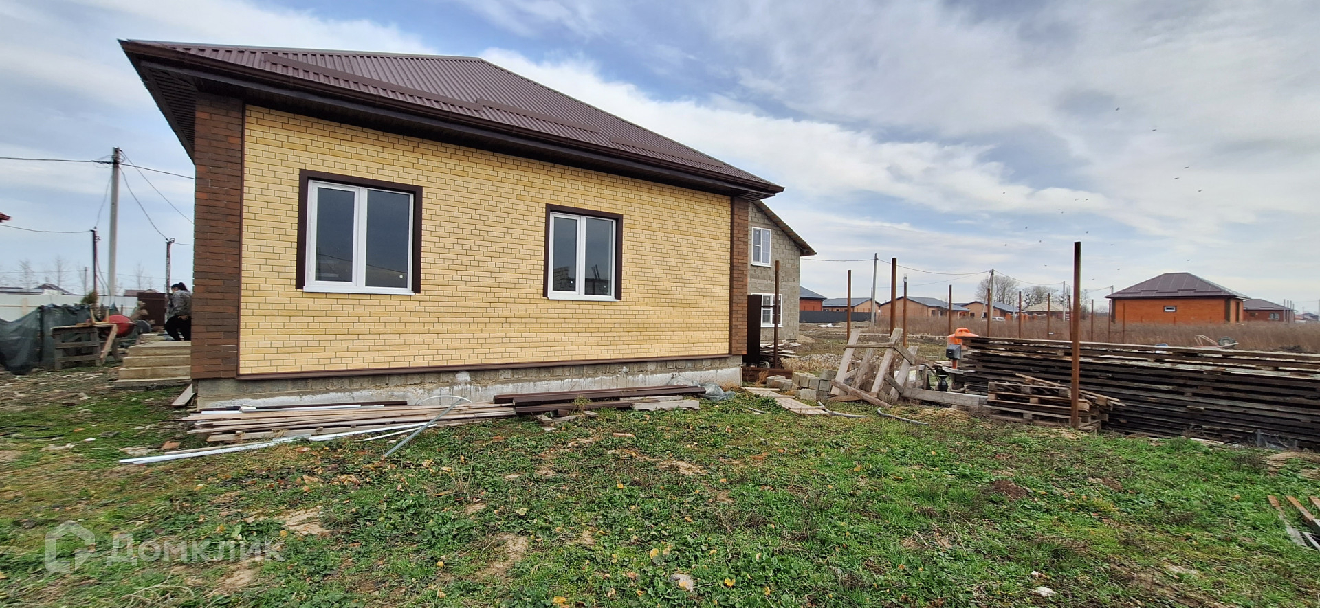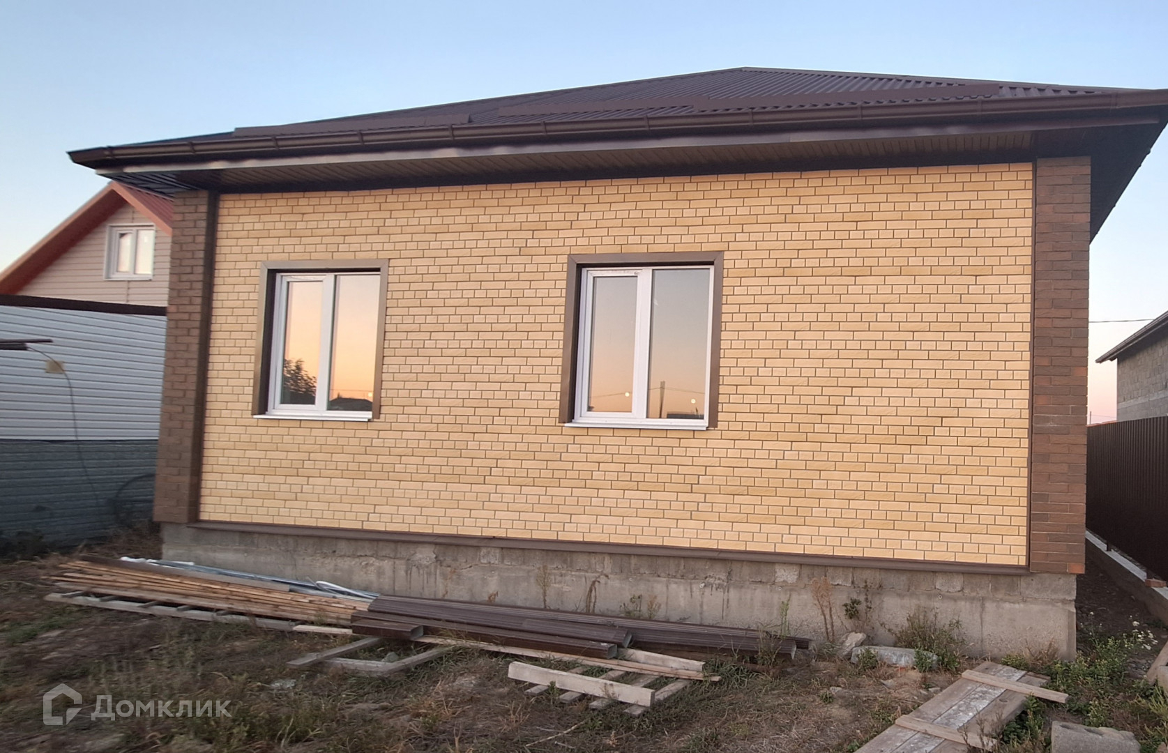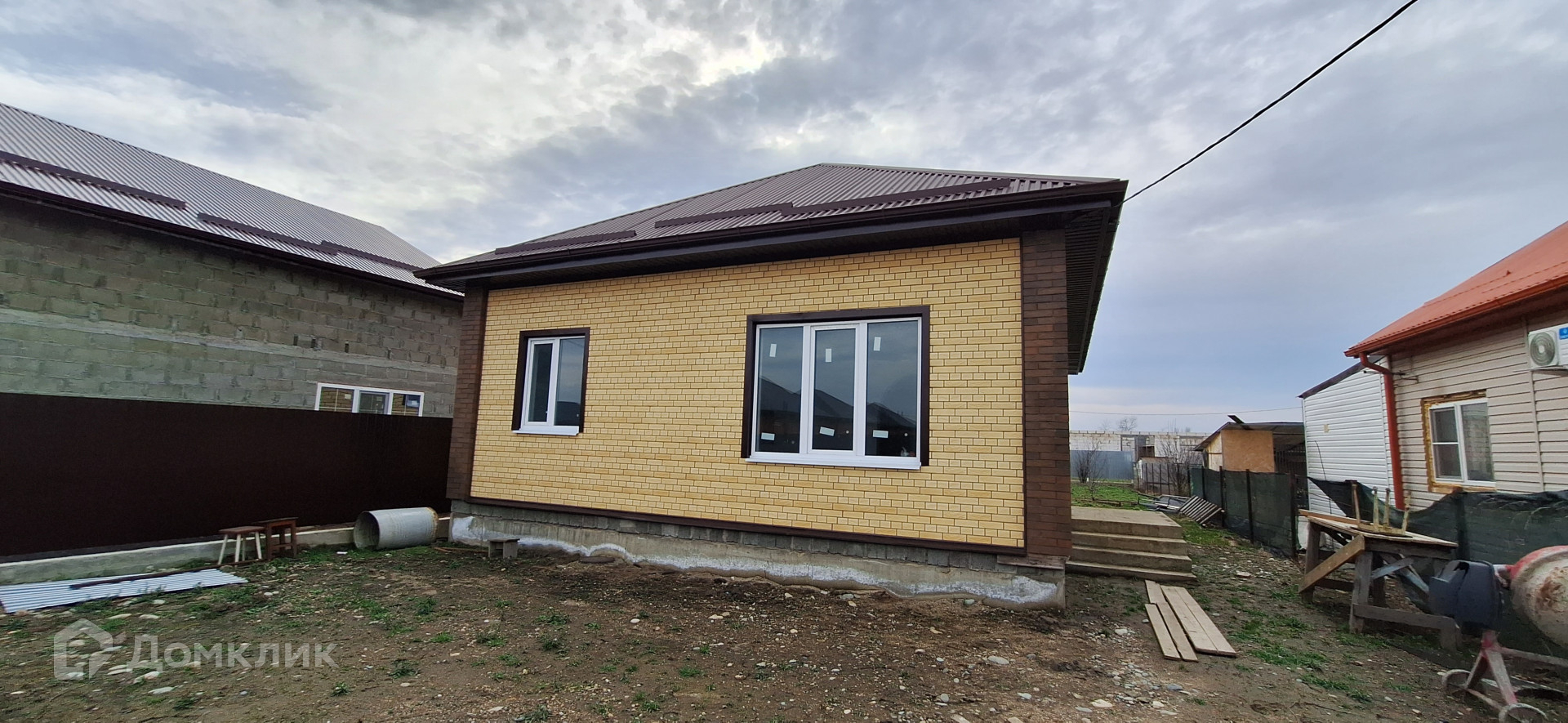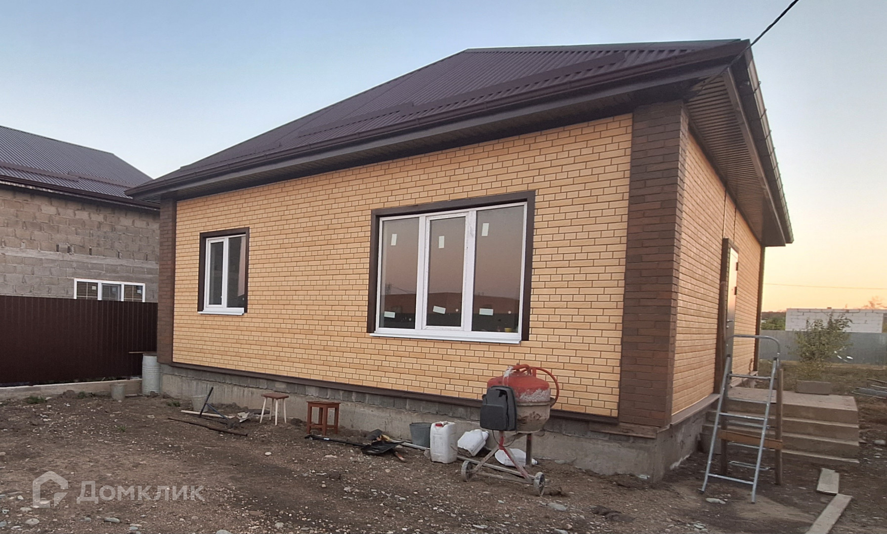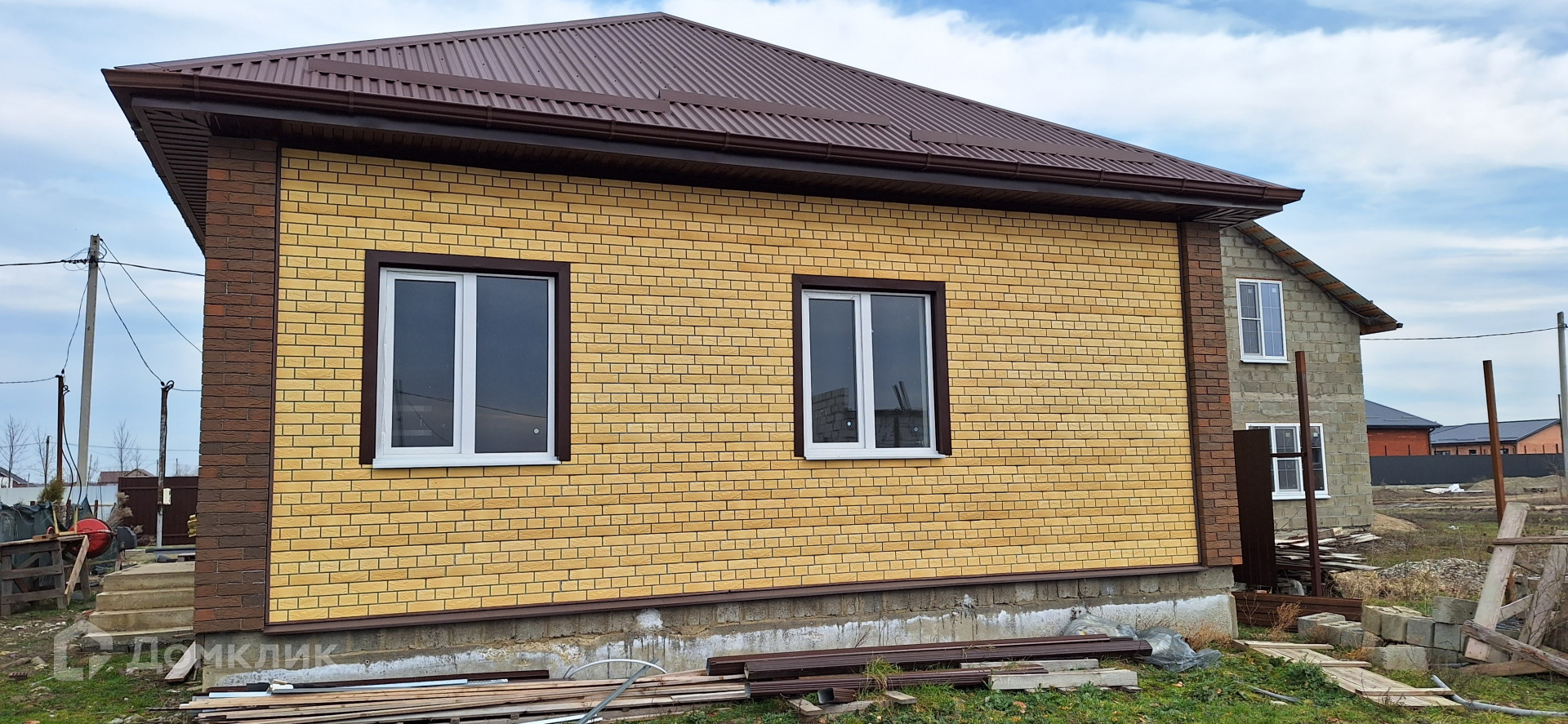 Дом построен из блока, облицован кирпичом.