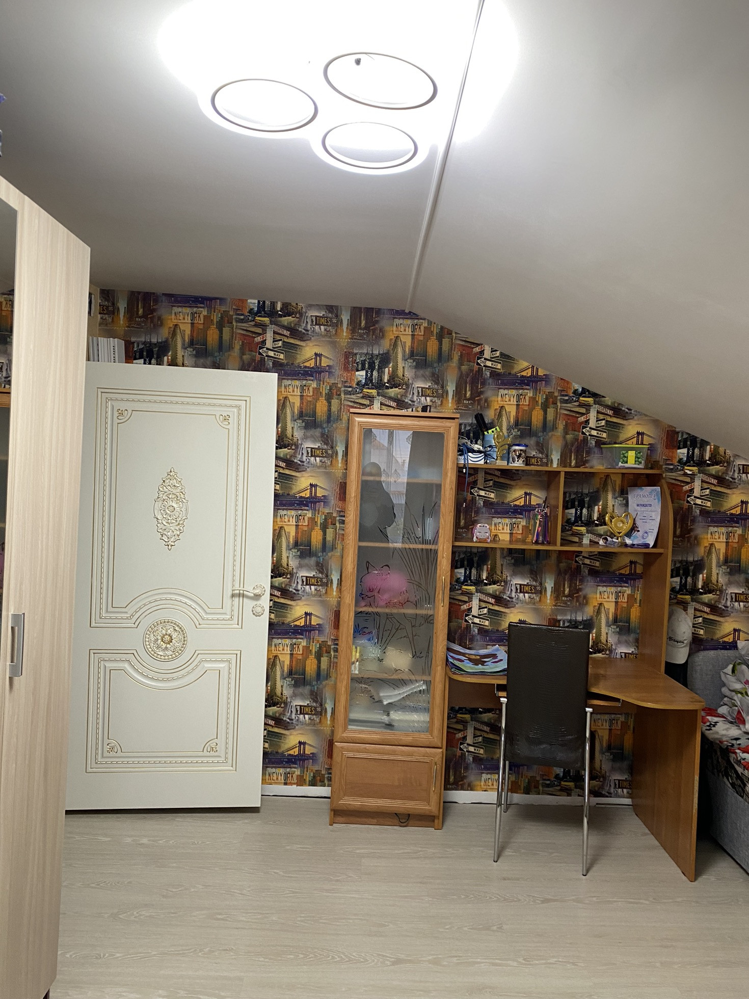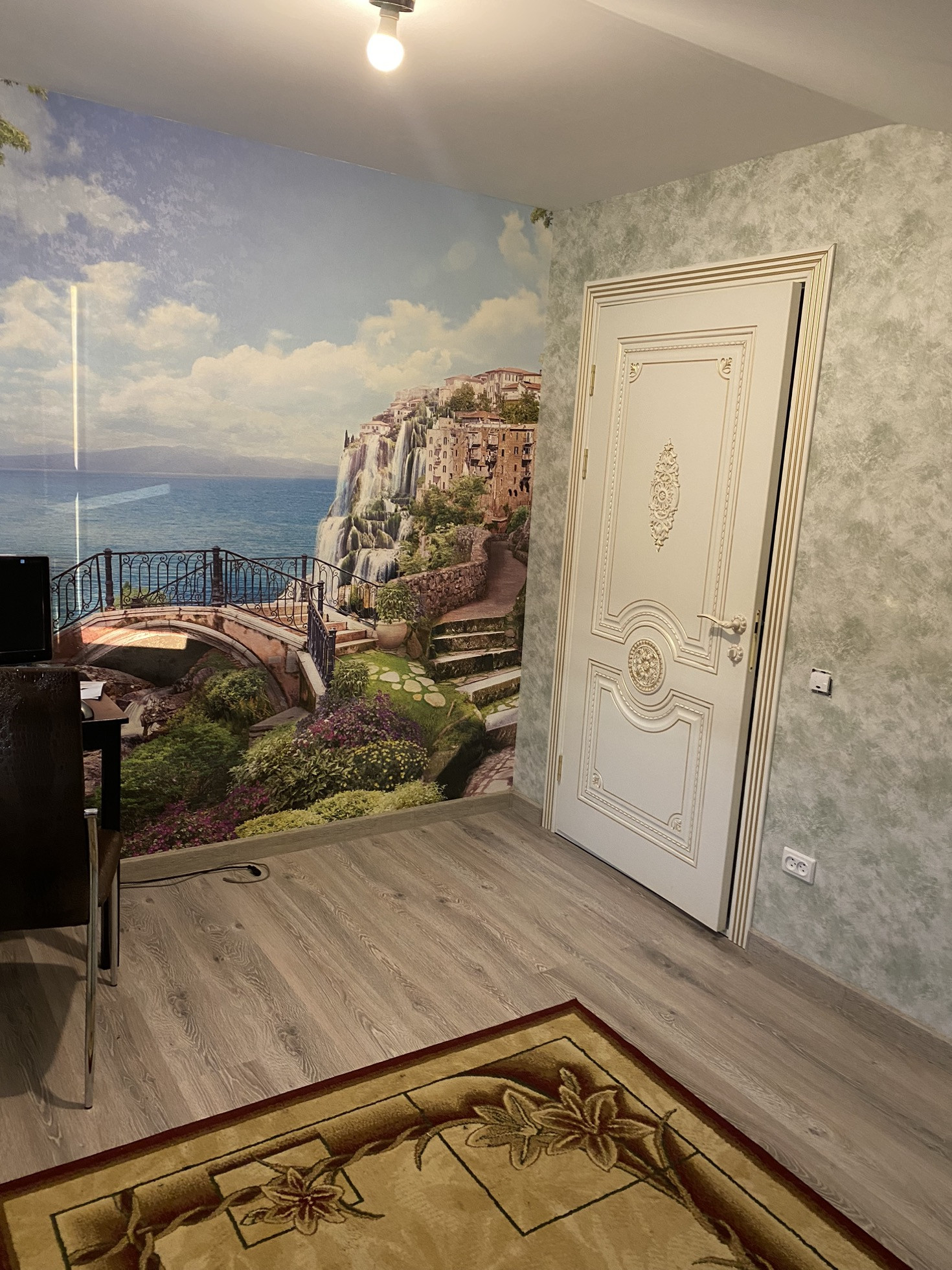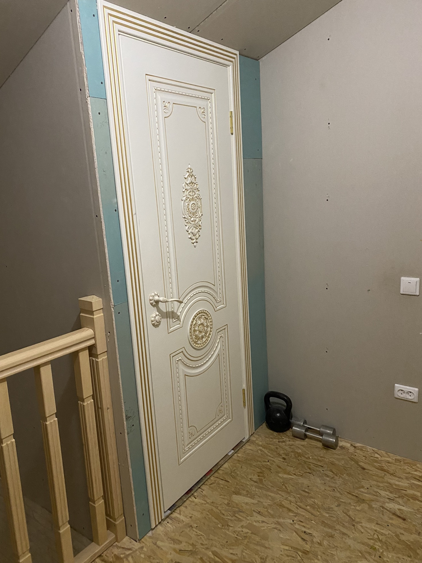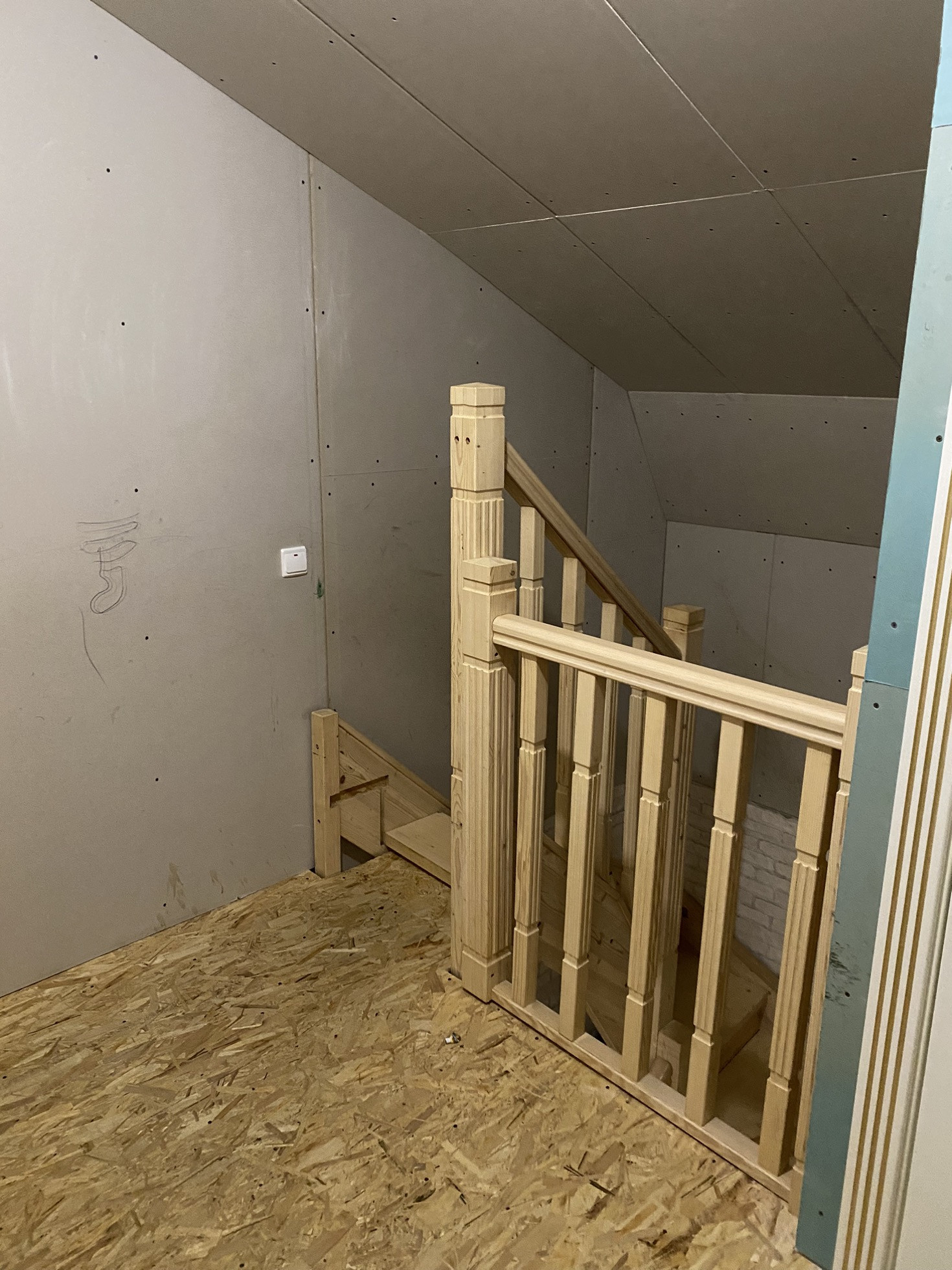 На второй этаж установили новую лестницу, в холле надо сделать косметический ремонт, постелить ламинат и поклеить обои.