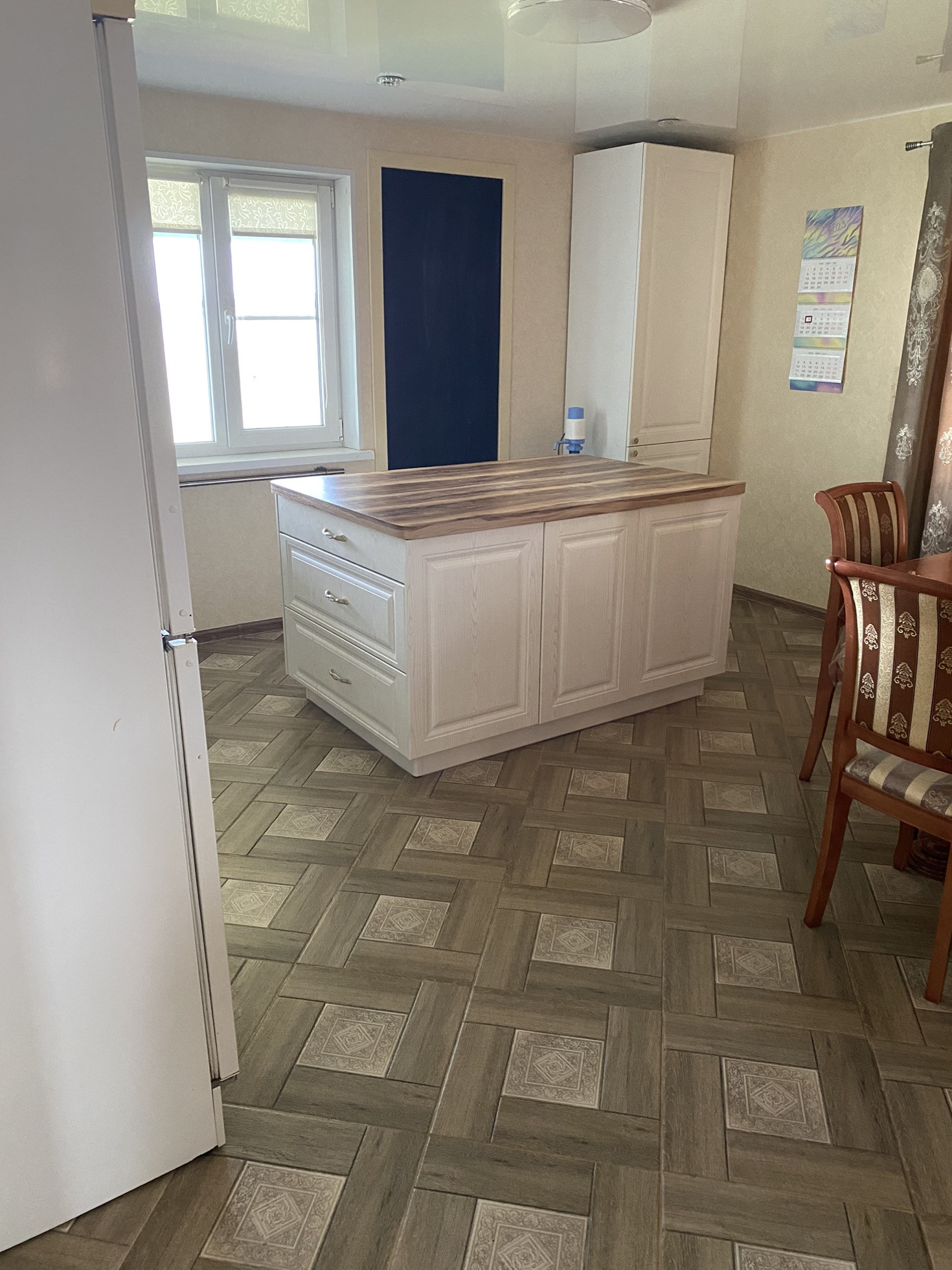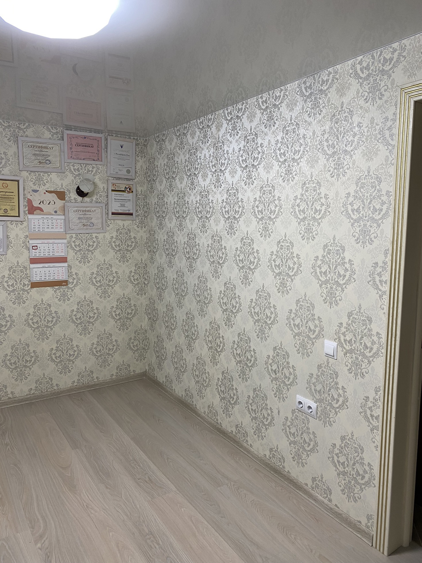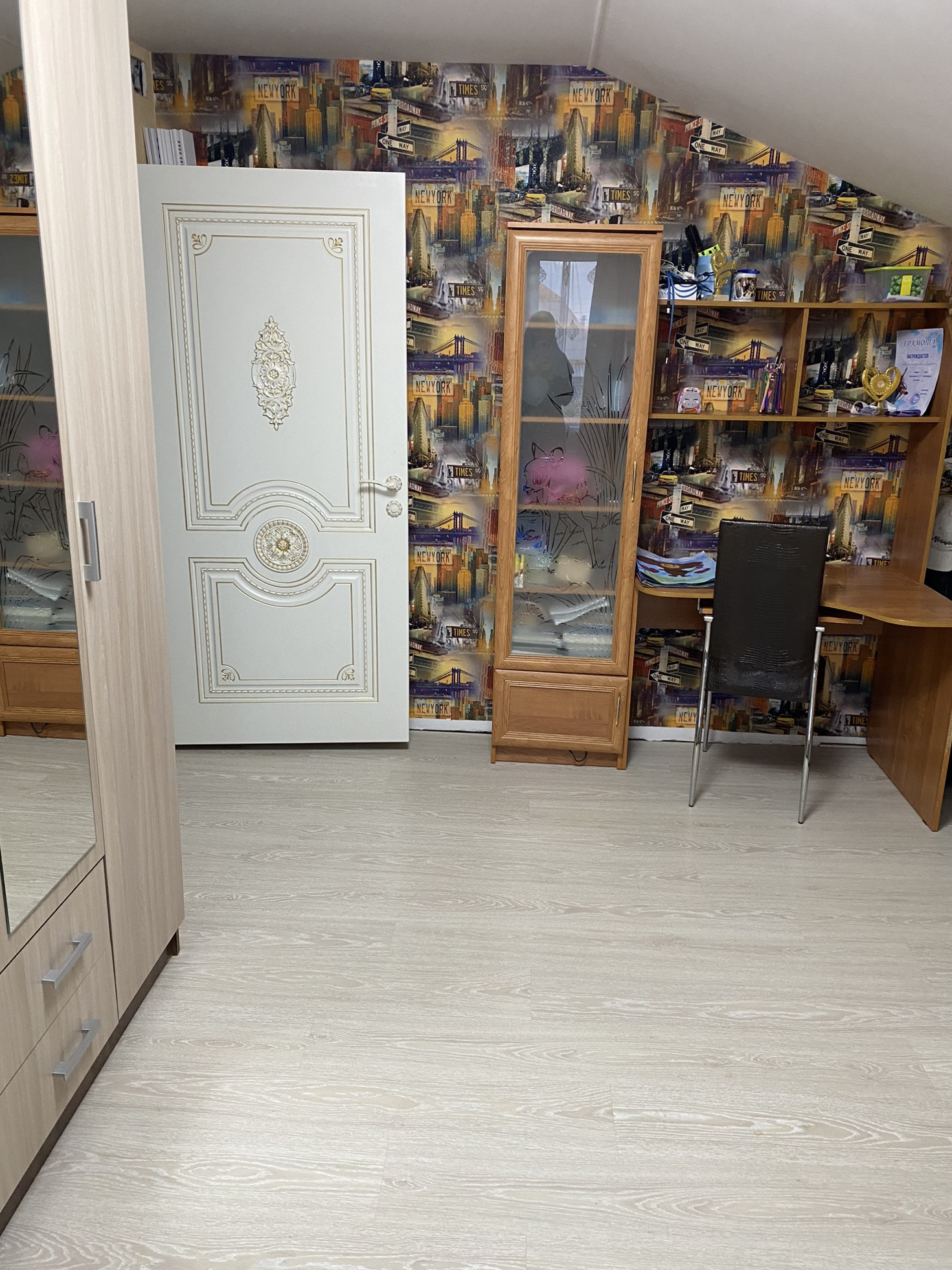 На второй этаж установили новую лестницу, в холле надо сделать косметический ремонт, постелить ламинат и поклеить обои.