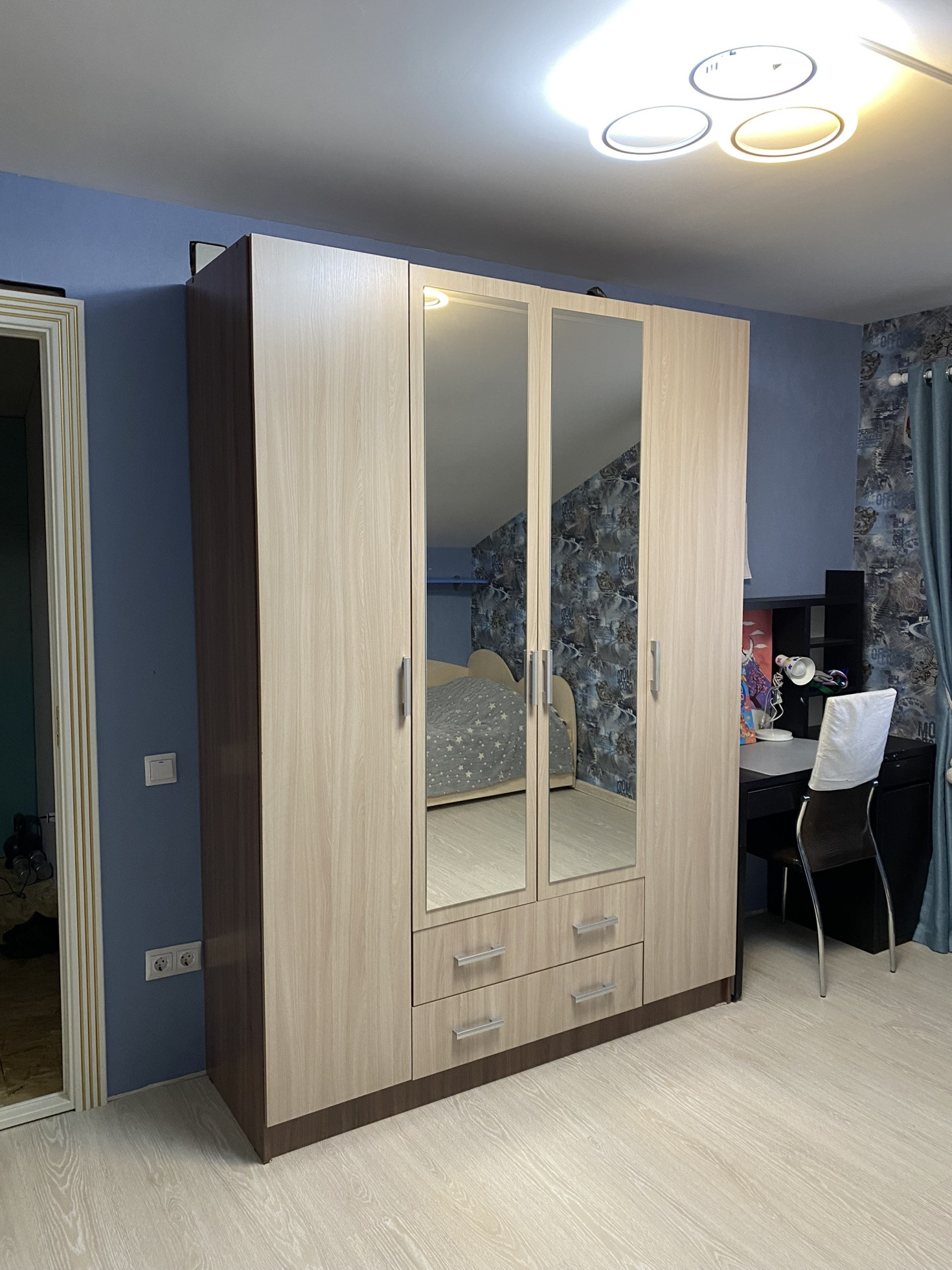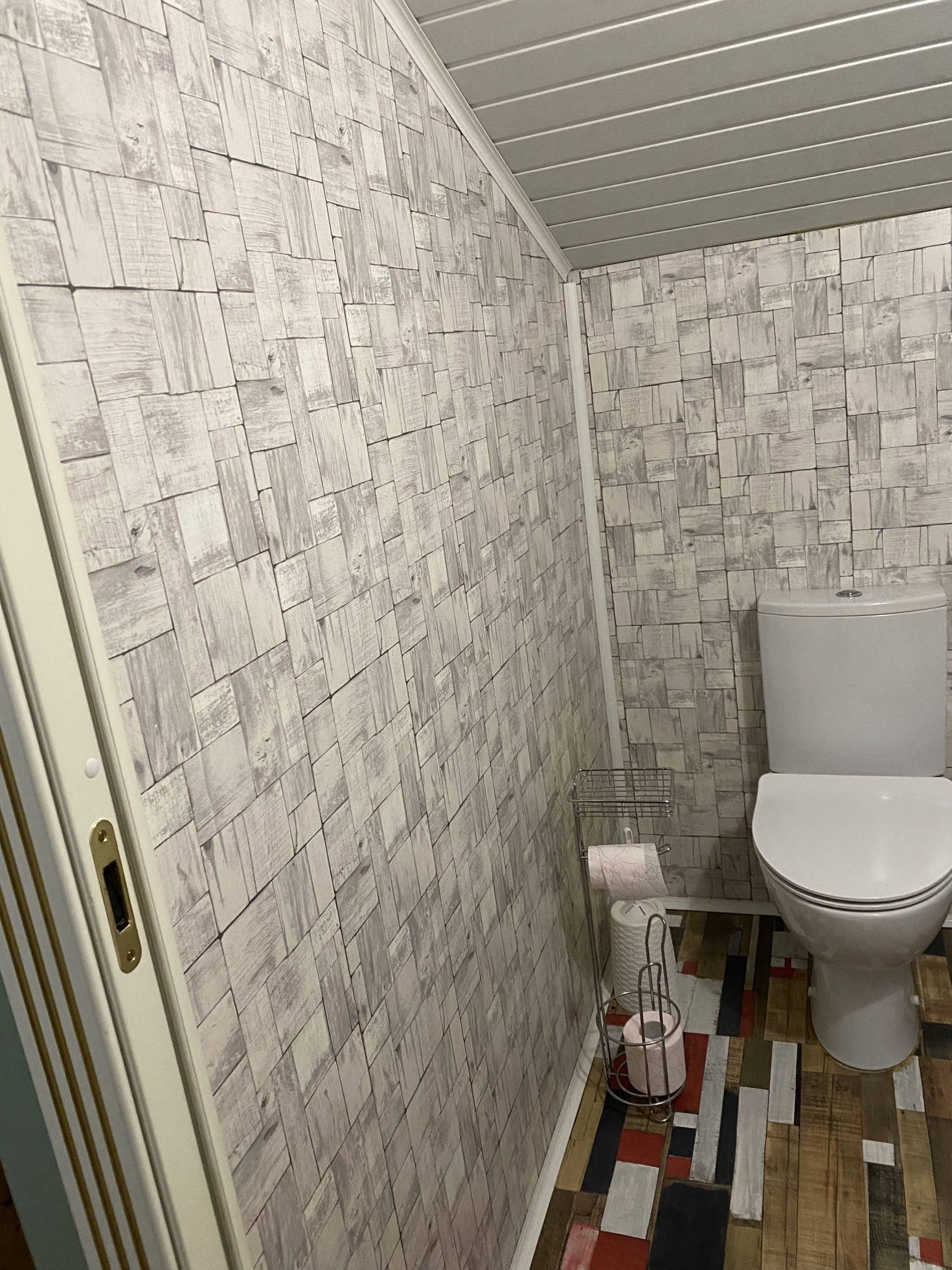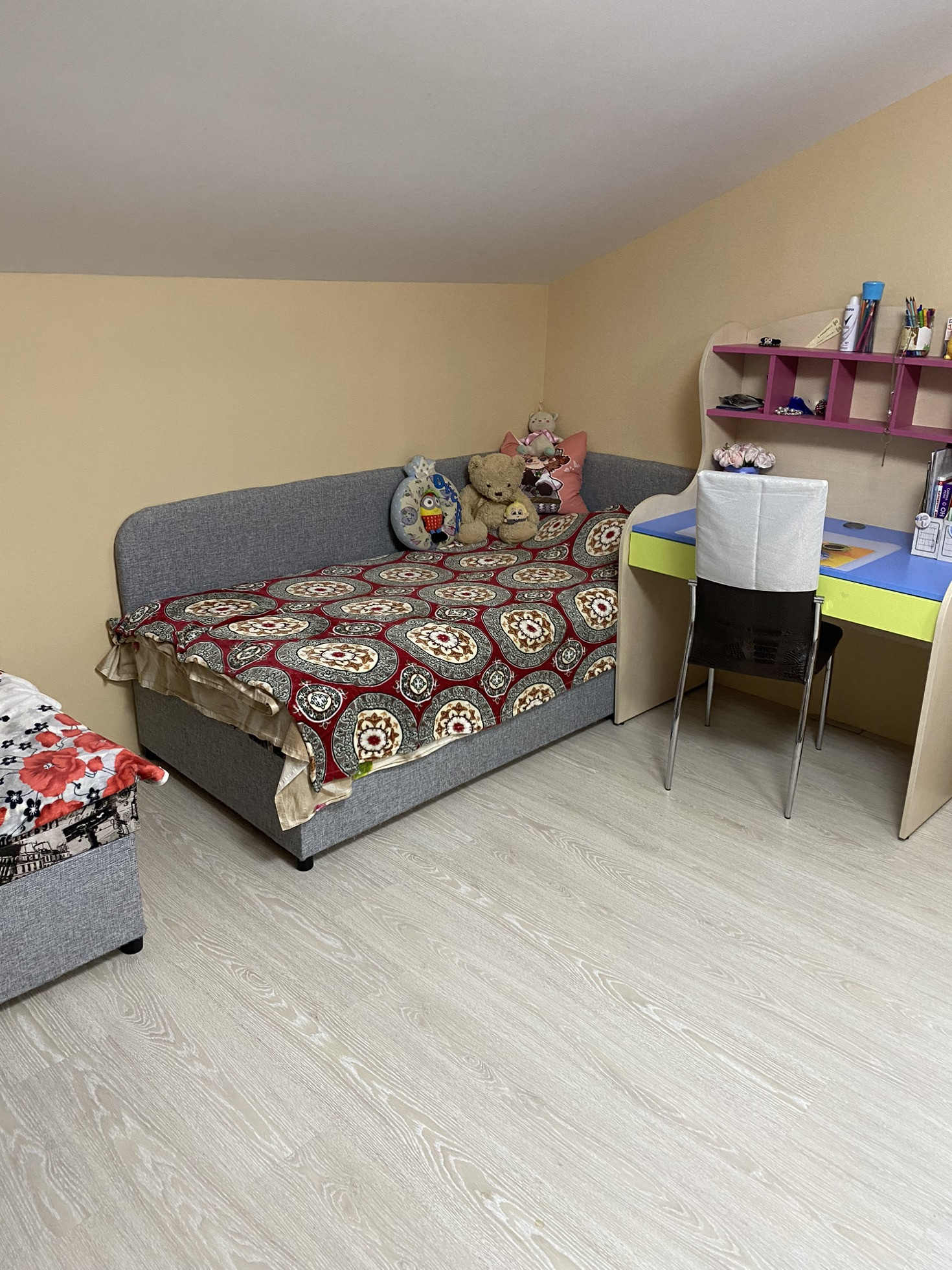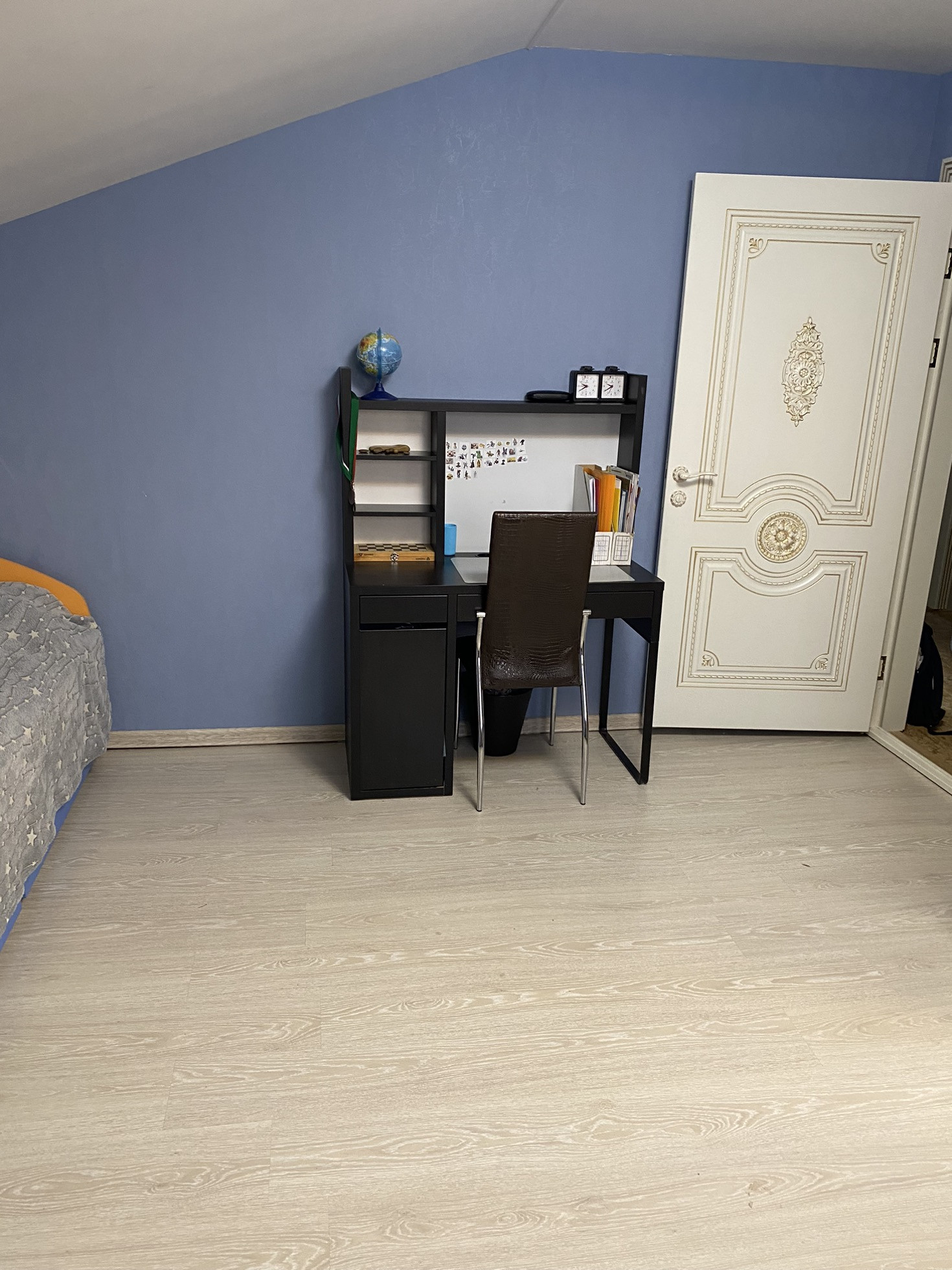 На второй этаж установили новую лестницу, в холле надо сделать косметический ремонт, постелить ламинат и поклеить обои.