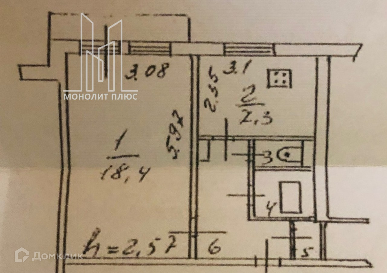 Кухня с площадью 7.3 кв. метров. комната 18.4 м.кв, с/у раздельный. Высота потолка 2.57