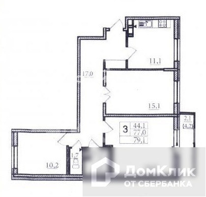 Жилая площадь 44.1 м2