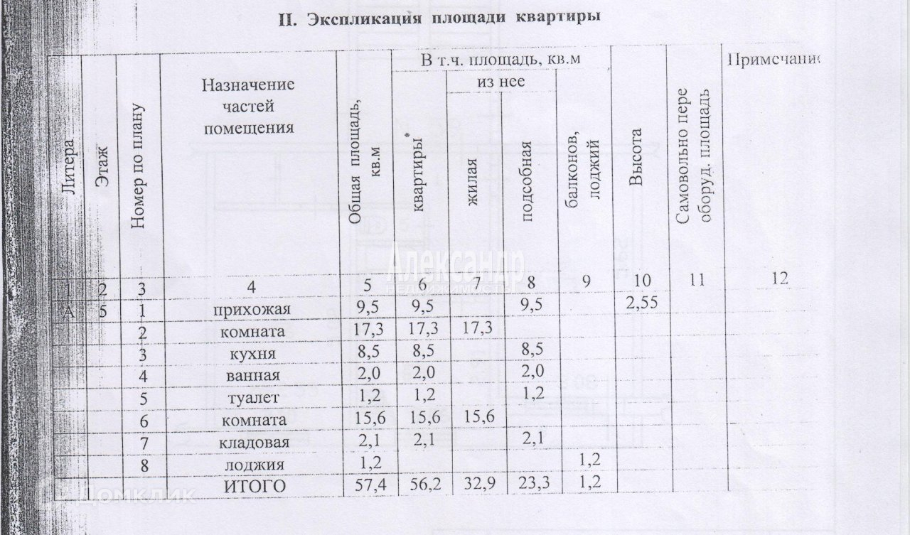 Высота потолков 2,55 м. Комнаты: 17,3 кв м и 15,6 кв м. Кухня 8,5 кв м (мойка, встроенная мебель, возможно подключение газовой плиты). Лоджия 1,2 кв м (остеклена, отделана пластиковыми панелями, тумба для зимнего хранения). Ванная 2,0 кв м (раковина, душевая, подводка для стиральной машины, полная замена керамики стен и пола). С\у 1,2 кв м (унитаз, подводка для бойлера, полная замена керамики стен и пола). Прихожая 9,5 кв м. Гардеробная 2,1 кв м (оборудована навесными полками). Всего: общая площадь 57,4 кв м, площадь квартиры 56,2 кв м, жилая площадь 32,9 кв м.