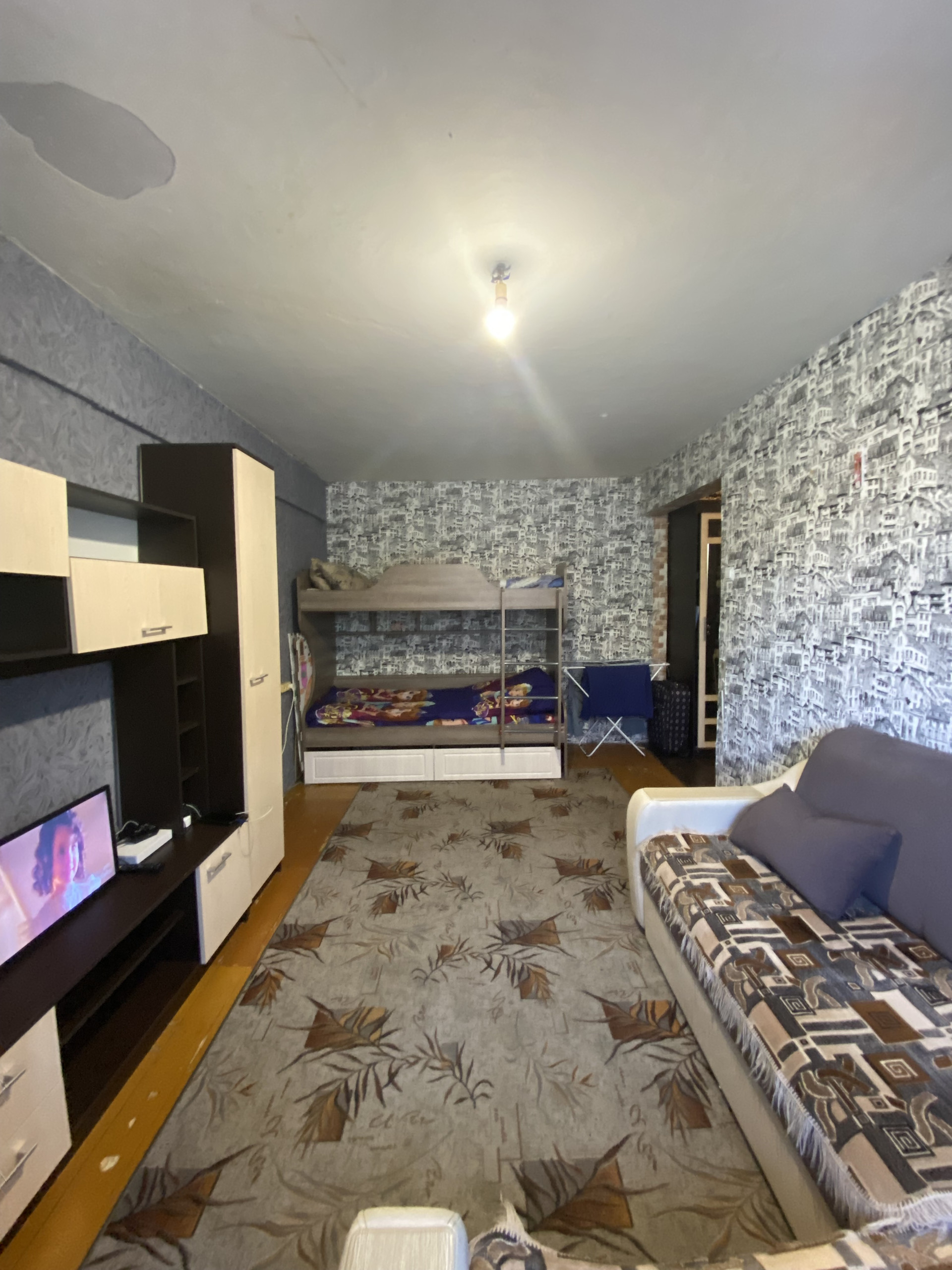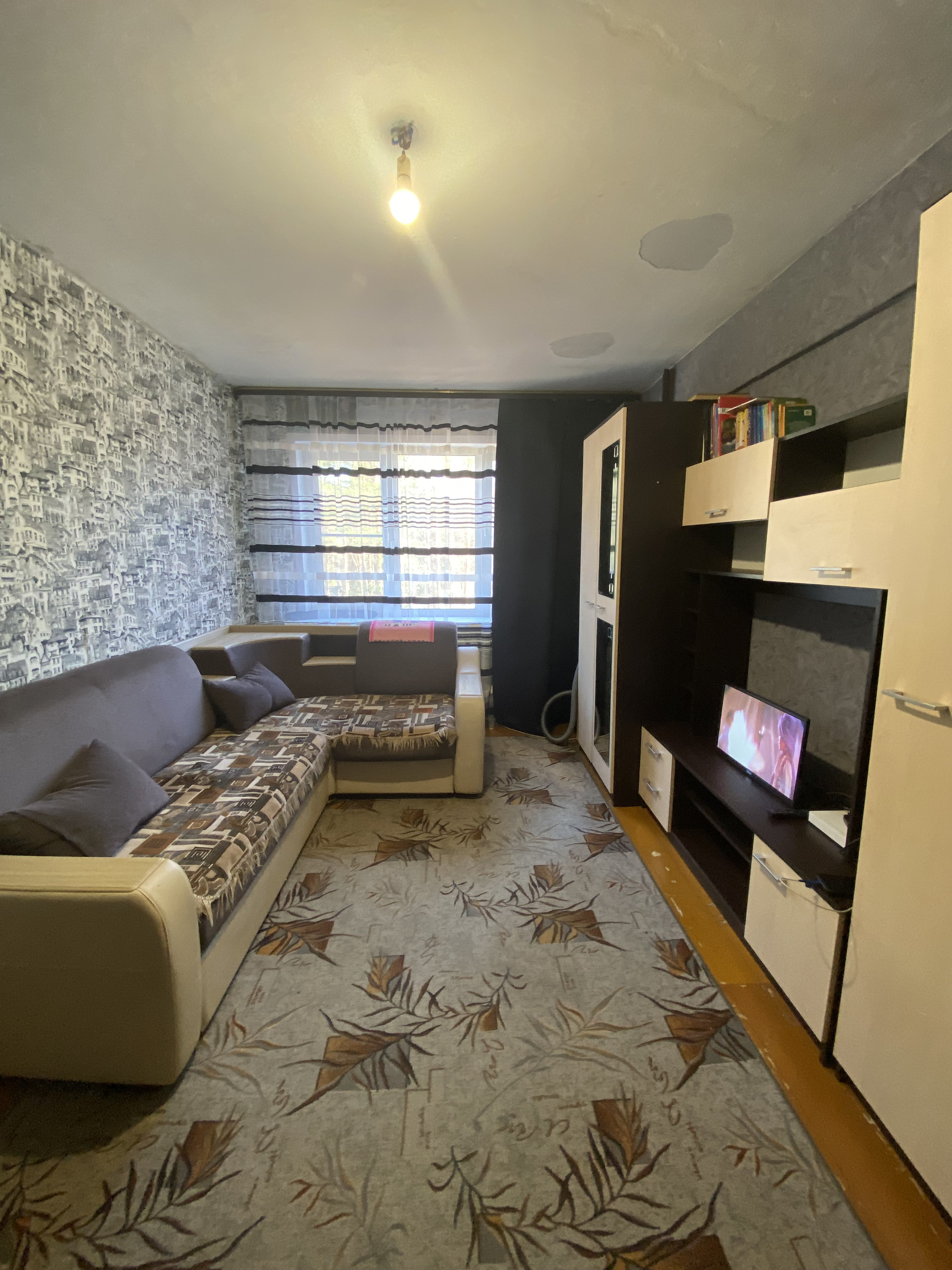 Квартира в жилом состоянии, остается кухонный гарнитур, натяжной потолок на кухне, установлены стеклопакеты, заменены все трубы, установлены счётчики, косметический ремонт в квартире сделан частично, в квартире центральная горячие вода (без газовой колонки), отопление отличного качества, стены в санузле - кафельная плитка, балкона в квартире нет, вид из окон - на сосны, чистейший воздух гарантирован!