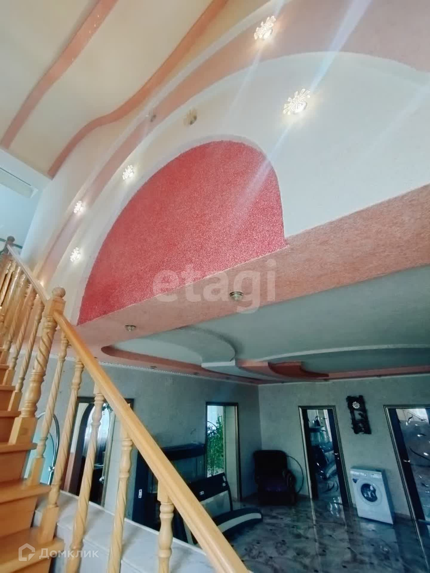 На стенах жидкие обои(флоки).Двухуровневые потолки.