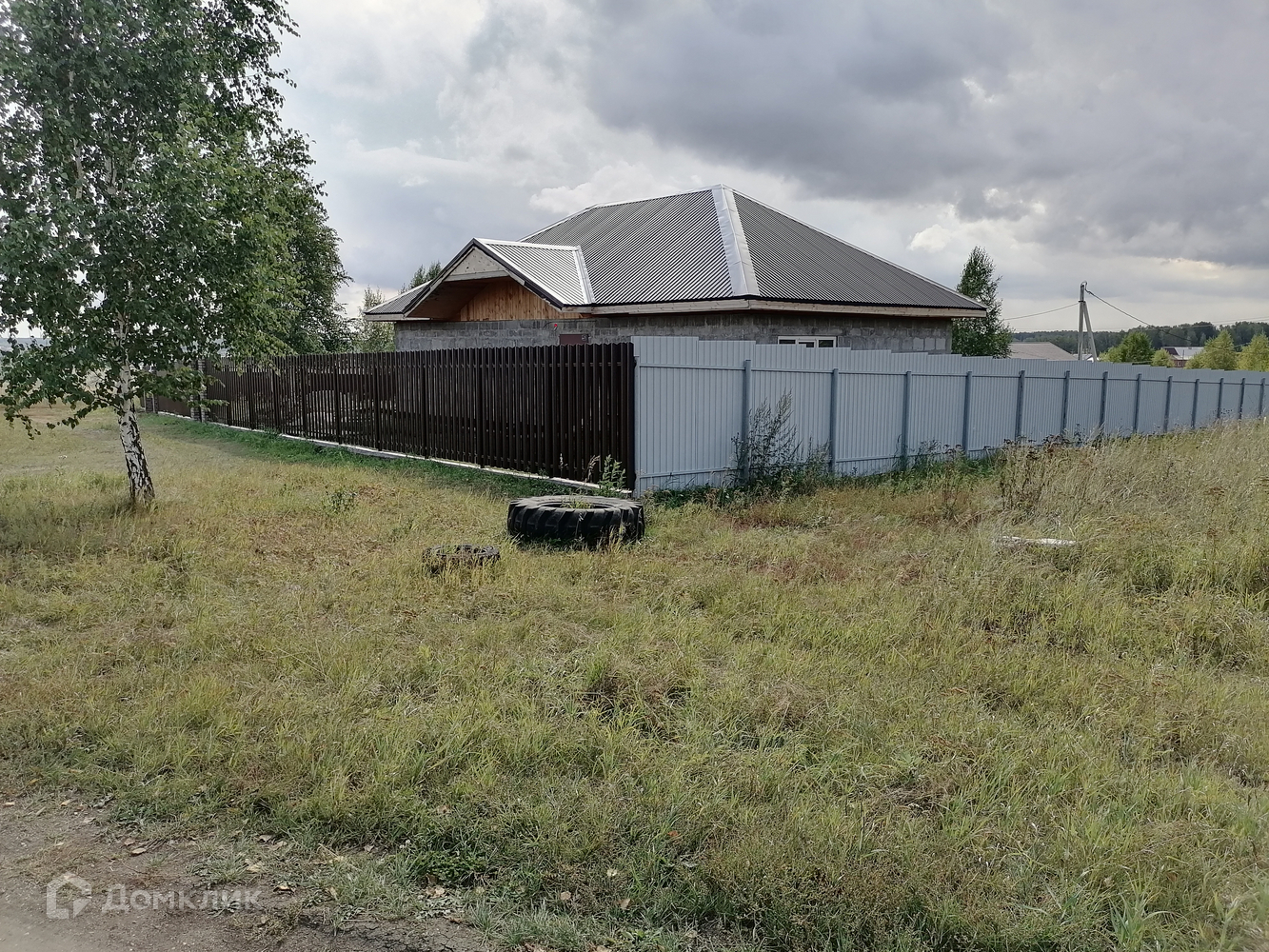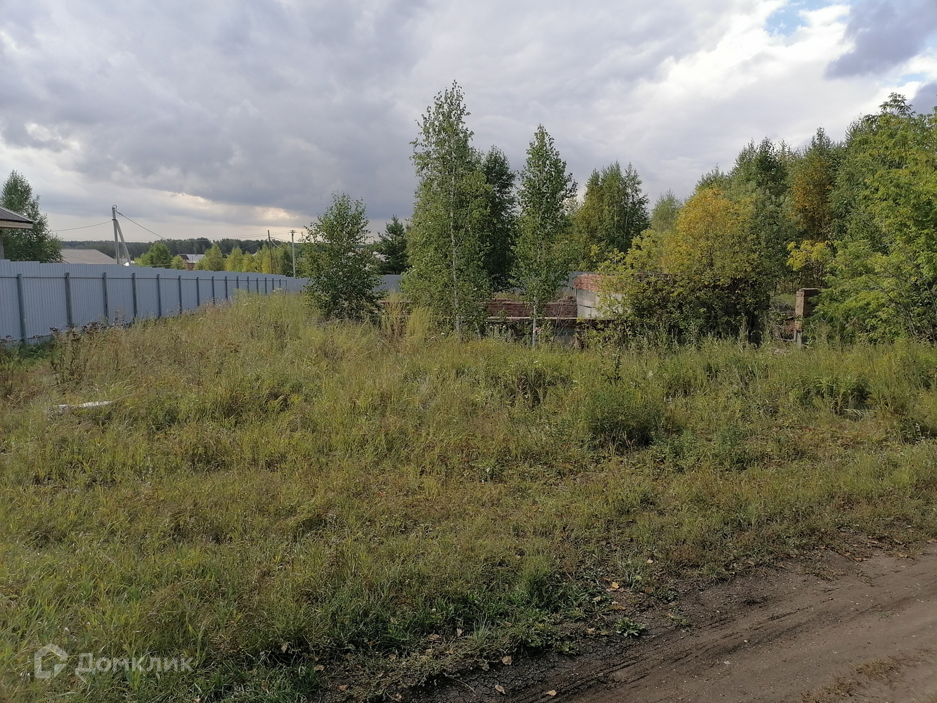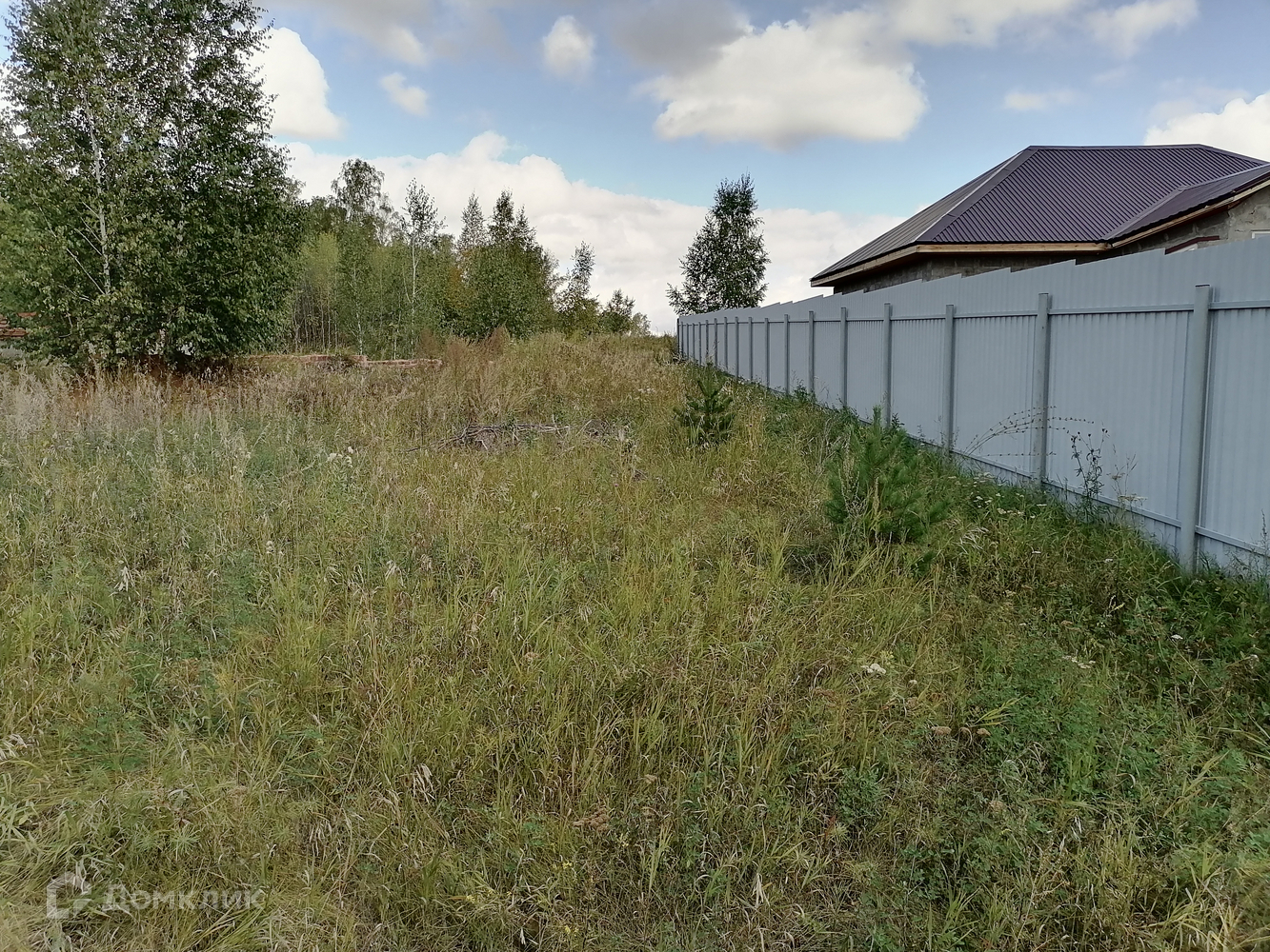 Участок квадратный 43х43м. С левой стороны участка одноэтажный дом, забор из профнастила; с правой стороны незавершенное строительство.
