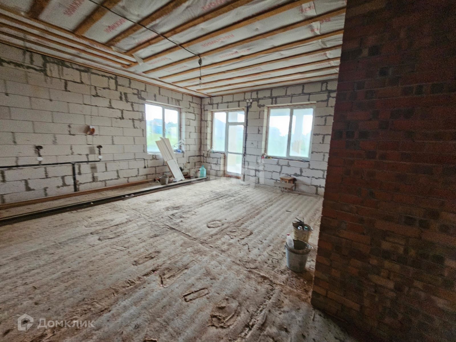 Внутри дома выполнена черновая отделка, а электрические проводки и газовые коммуникации уже разведены по всему дому.