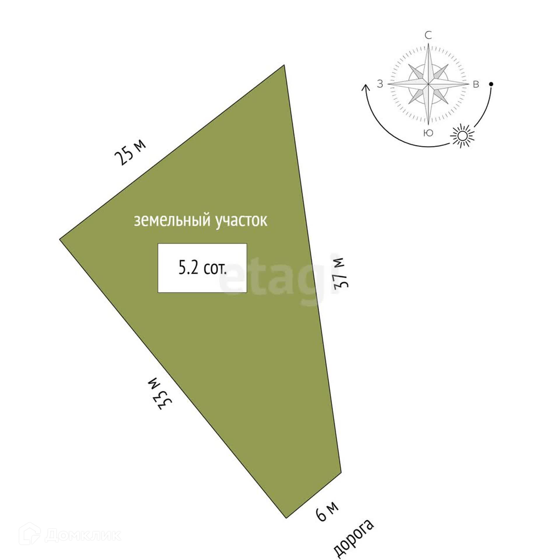 В продаже хороший участок 5,2 соток в поселке Российском. Недалеко от центра. Угловой.  Имеет форму прямоугольной трапеции с фасадом 6 метров и 37 метров .