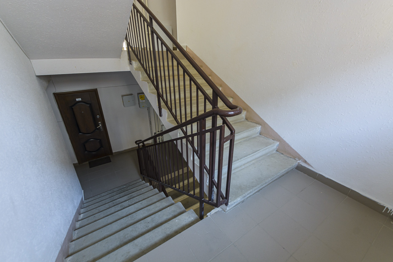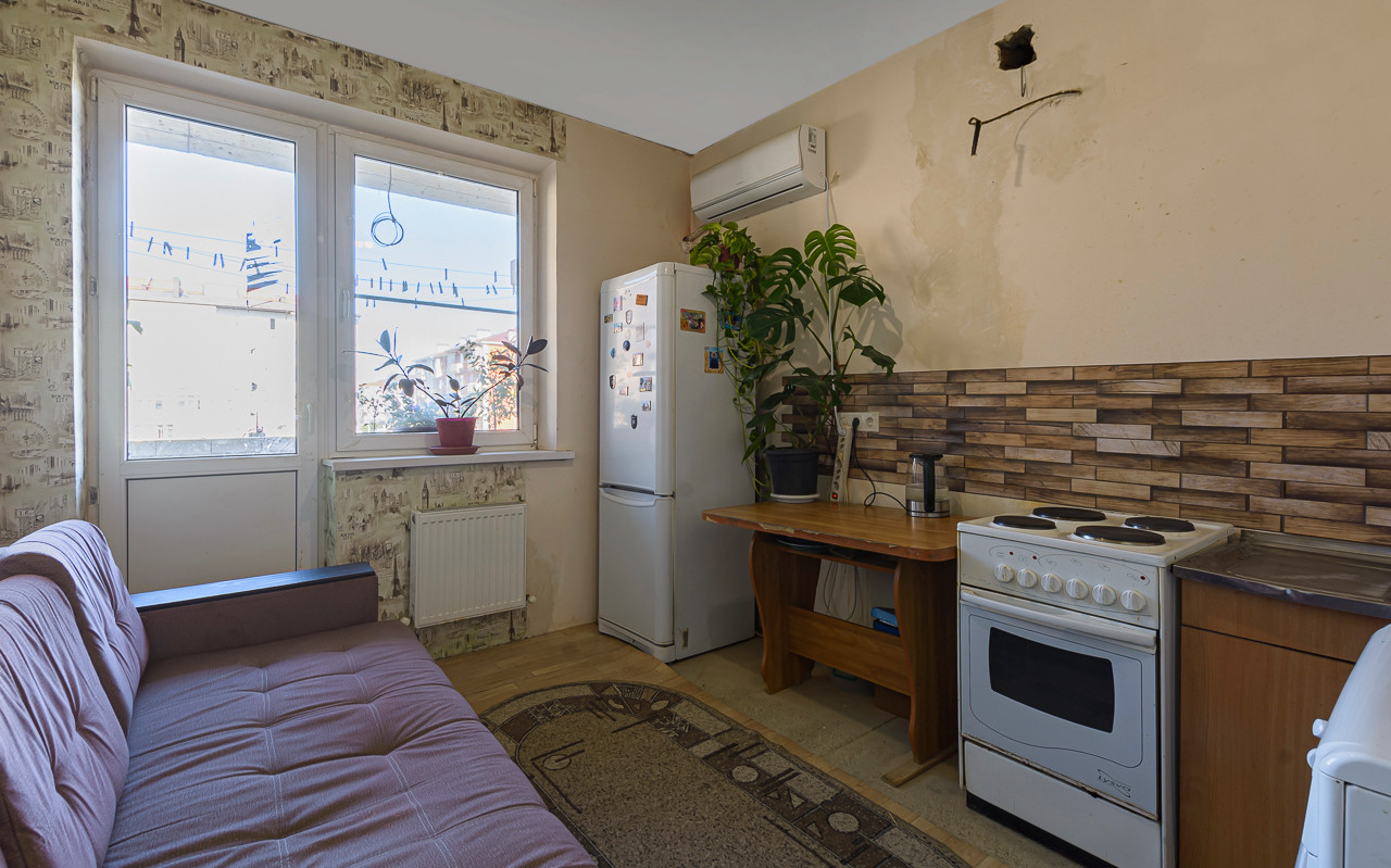 Большая кухня 10 кв.м с выходом на широкую лоджию. Большую комнату 18 кв.м разделили гипсокартоновой перегородкой - получилась двухкомнатная квартира. Но если проводить продажу через банк, перепланировка не помешает, потому что легкая конструкция.