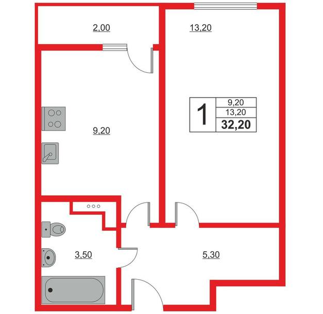 Общая площадь 32.2 м2