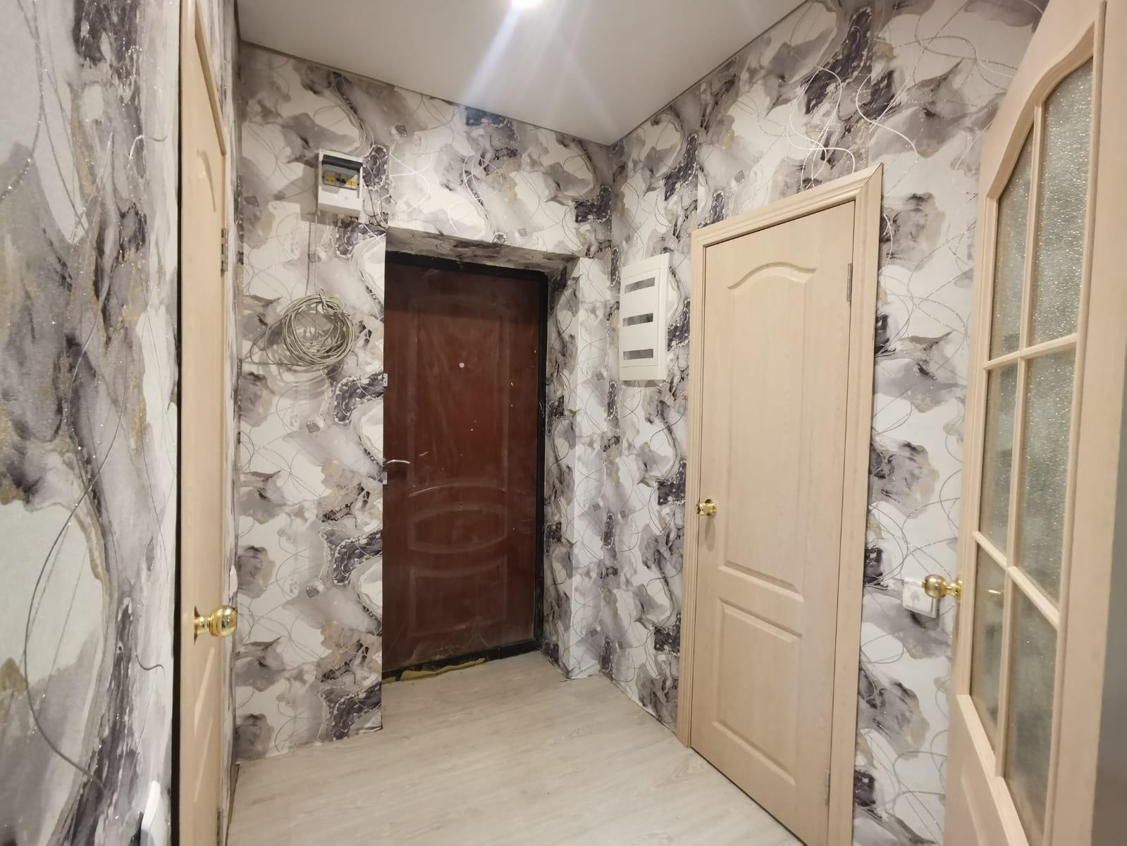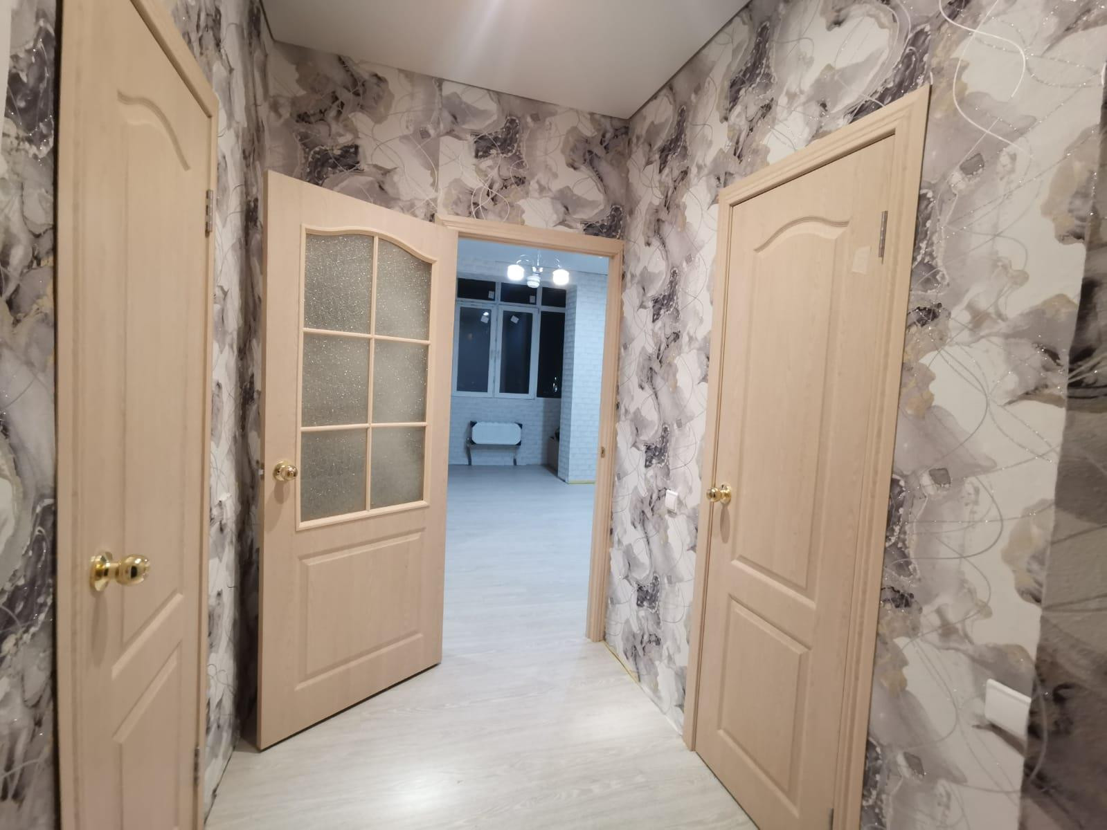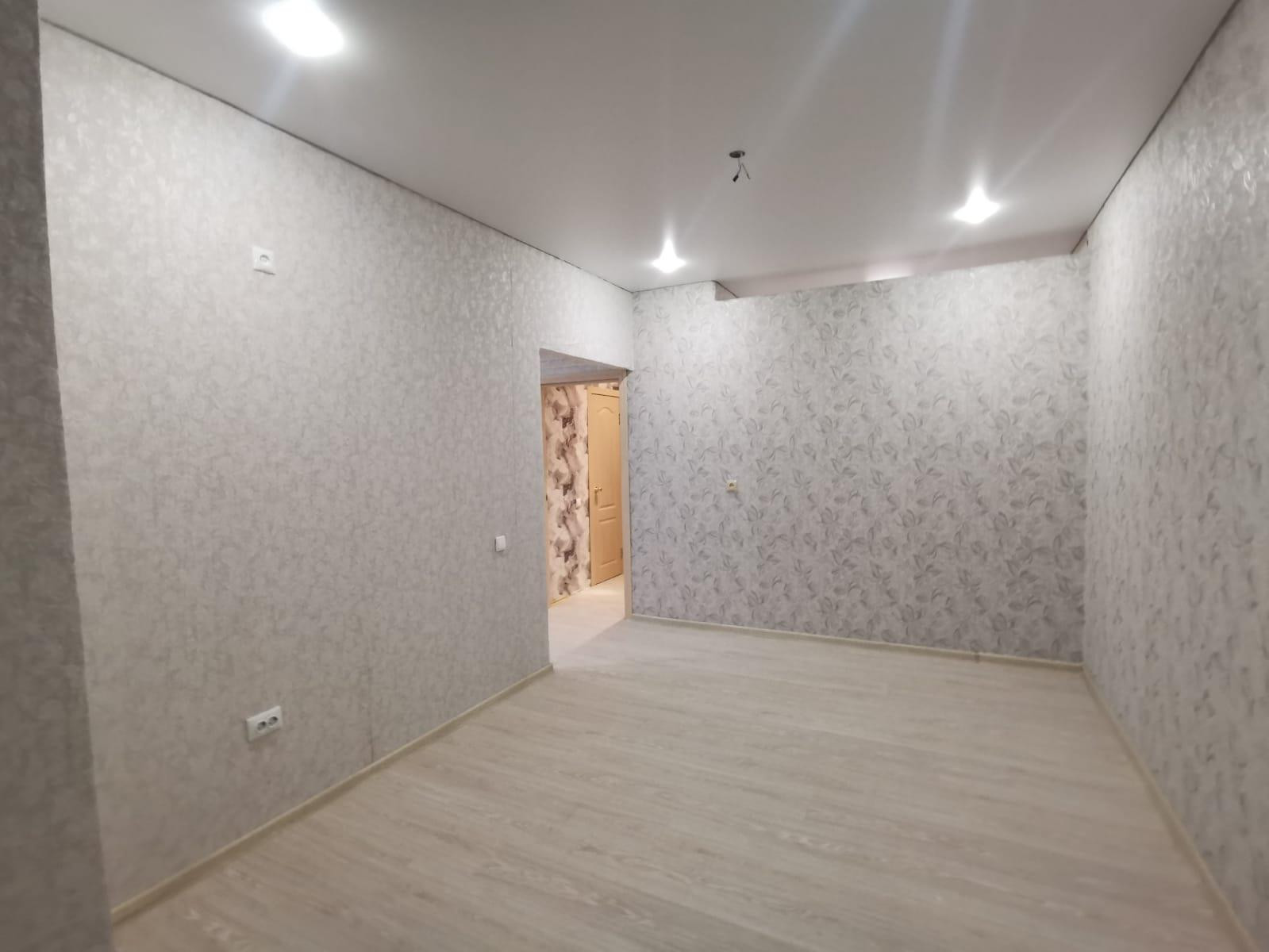 В квартире собственник сделал полностью новый ремонт. Переделал в 12км за счет разделения спальни и соединения ее с кухней