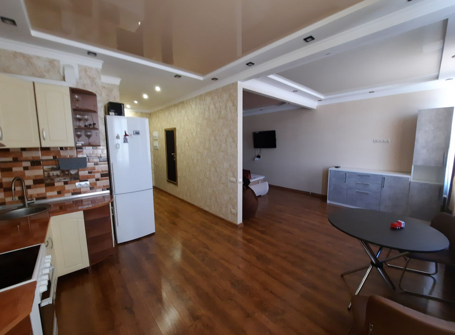 Просторная гостиная с большими окнами создает светлую и приветливую атмосферу. Здесь вы сможете создать уютную зону отдыха и развлечений. Кухня оборудована всем необходимым для приготовления вкусных блюд, а также имеет достаточно места для обеденного стола.