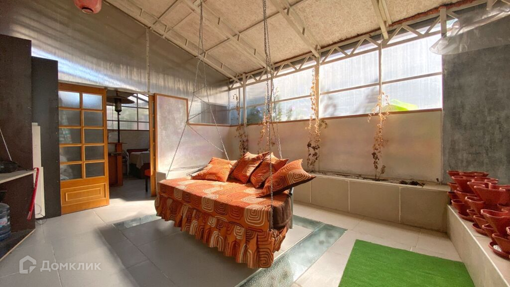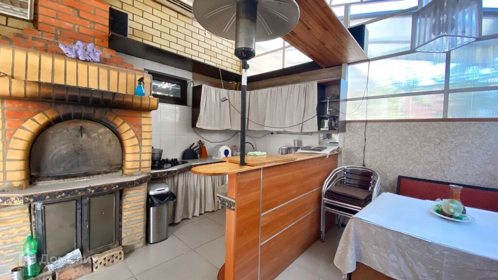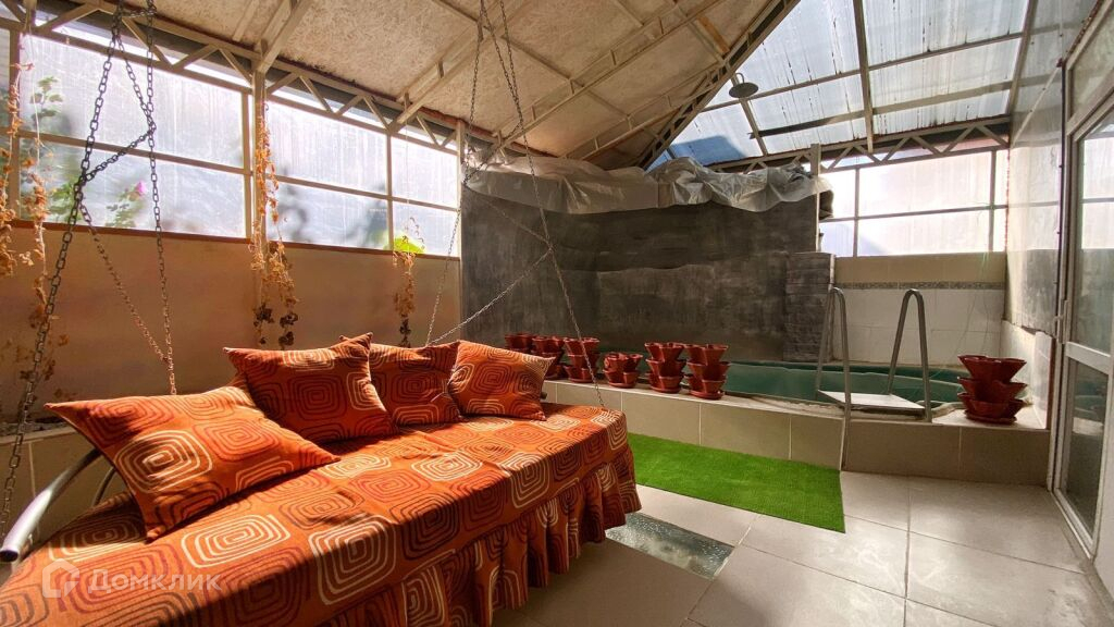Вторая часть пристройки включает в себя бассейн с водопадом, кровать-качель, оборудованную всем необходимым летнюю кухню с выложенным из кирпича мангалом, обеденной зоной.