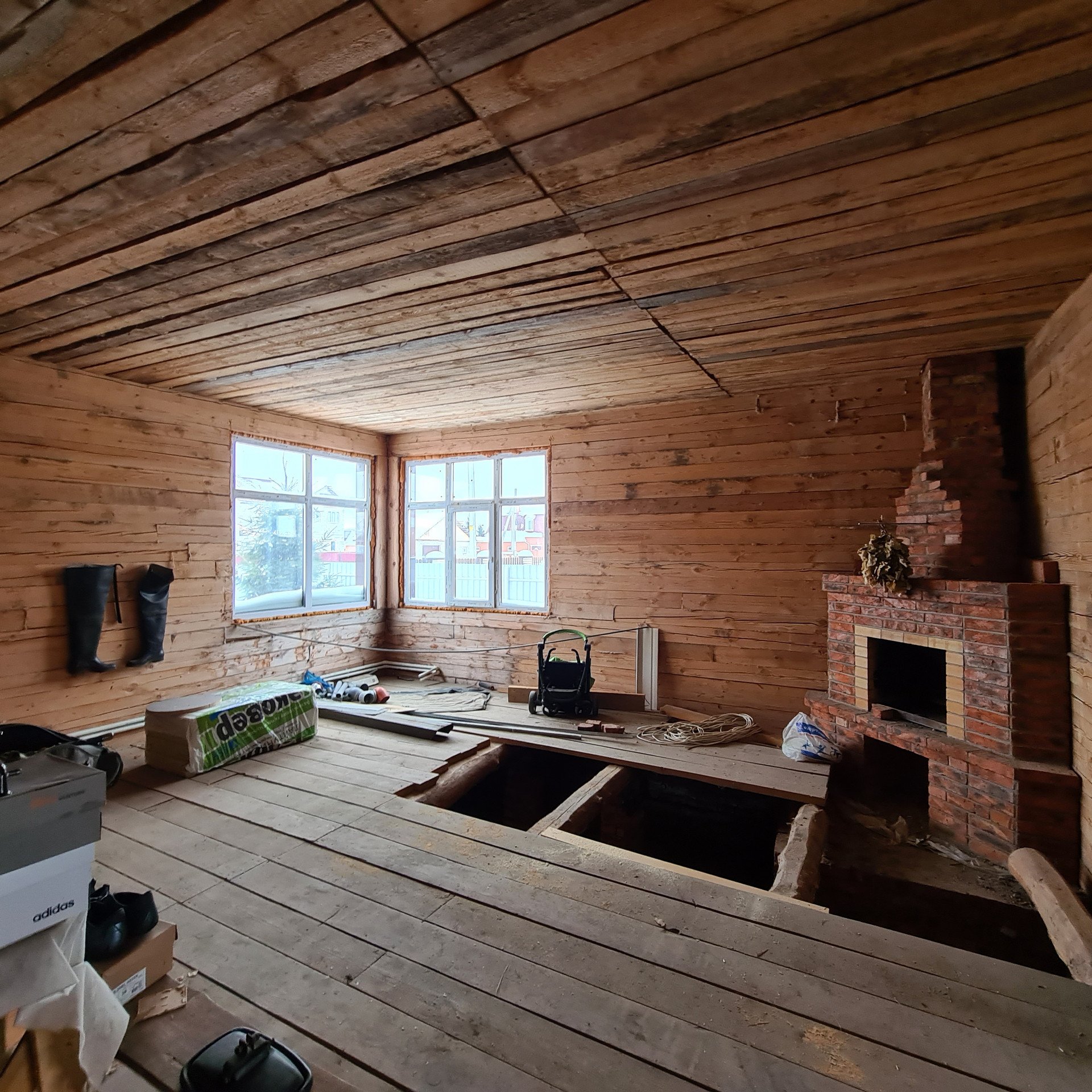 На участке два дома: один основной двухэтажный (осталось выполнить внутреннюю отделку), выложен камин,  газ заведён, котёл подключен, канализация и водопровод смонтированы.