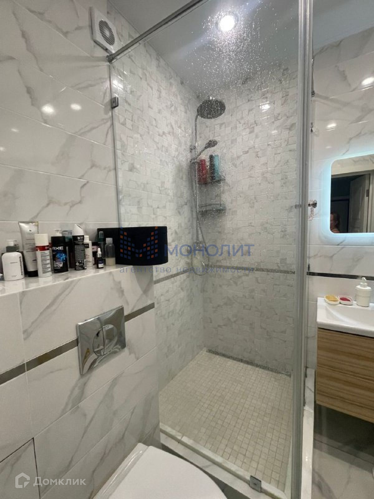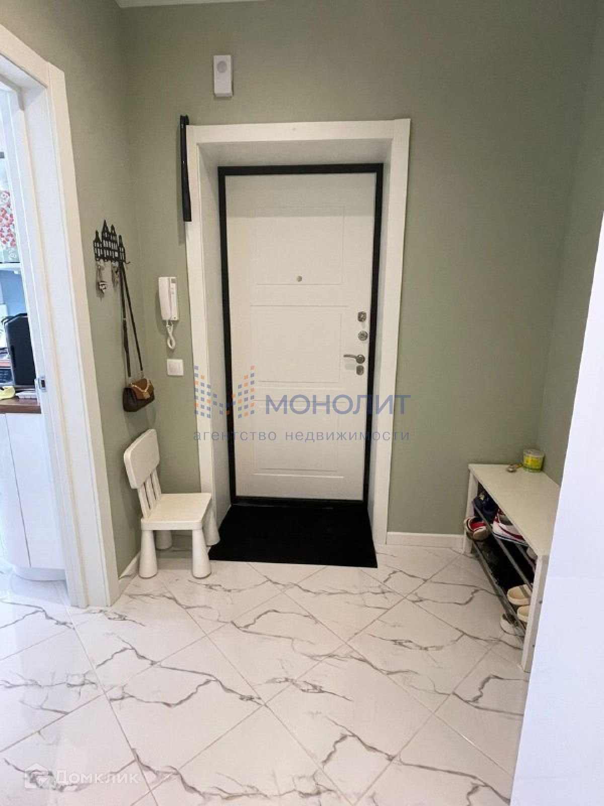 В комнате натяжной потолок, современные обои. Кухня 10 квм., так же натянут потолок, стены покрашены в светло оливковый цвет. Современный вместительный кухонный гарнитур. Остаётся духовой шкаф, варочная панель, холодильник, вытяжка. Совмещенный санузел отделан современным кафелем. Просторная прихожая с встроенным вместительным шкафом.