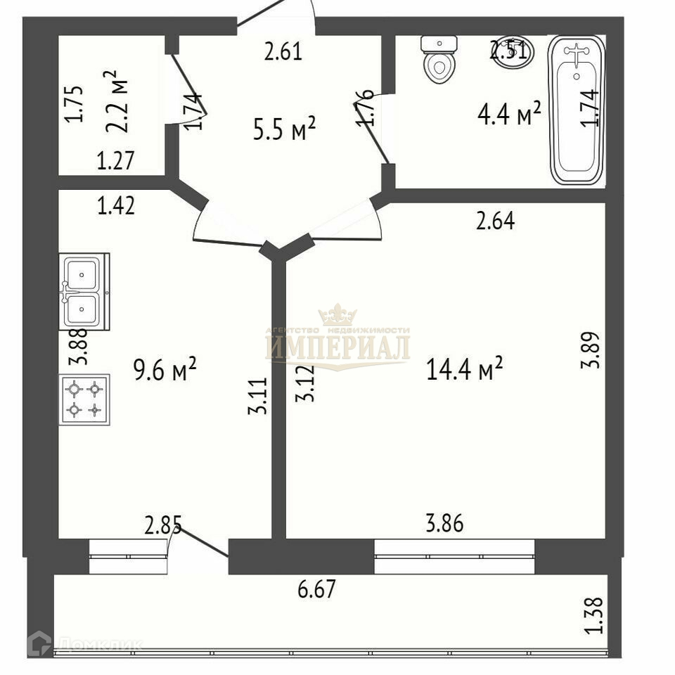Общая площадь 40.6 м2