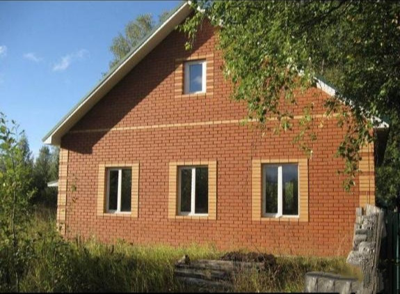 Дом из бревна, облицован кирпичом, крыша покрыта металлочерепицей, сделана подшивка.