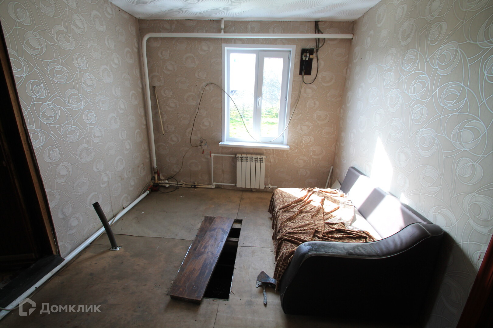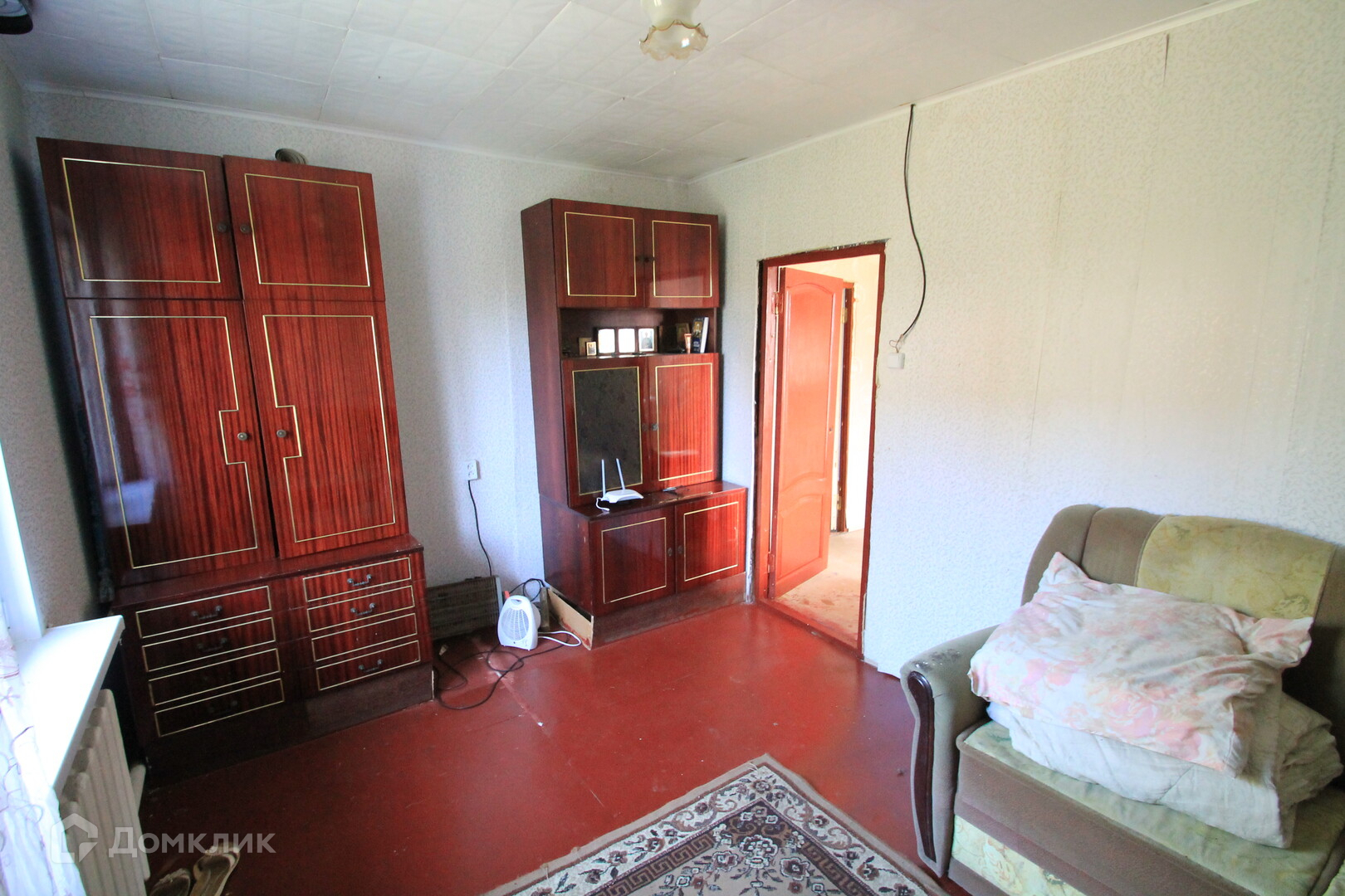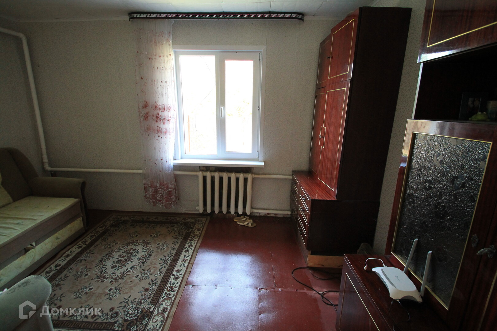 Общая площадь дома 54.кв.м из кирпича. Стоит на ленточном фундаменте высота 400 мм. Полы деревянная доска, деревянные и пластиковые стеклопакеты. Стены аккуратные обои. Крыша покрыта шифером.