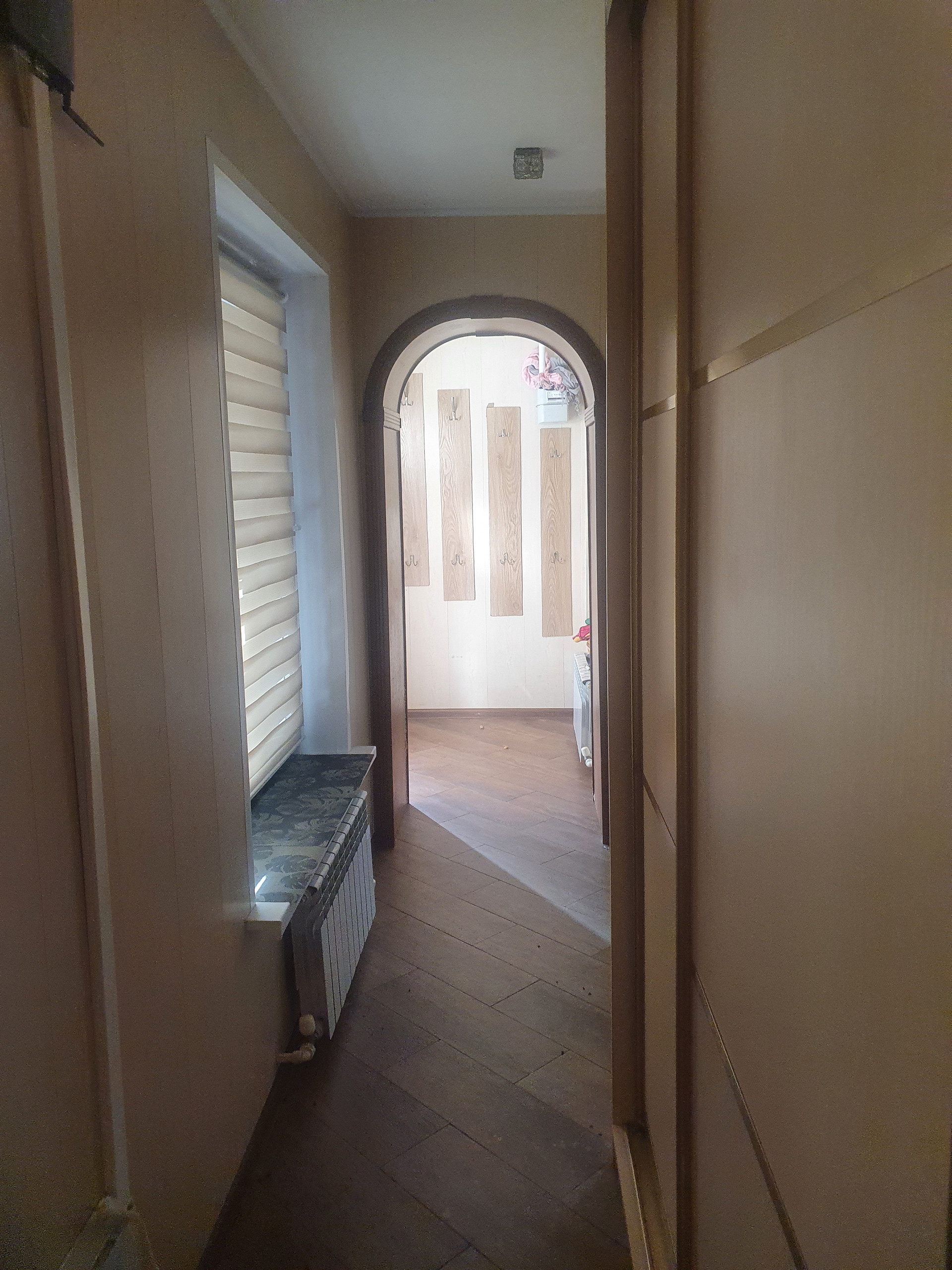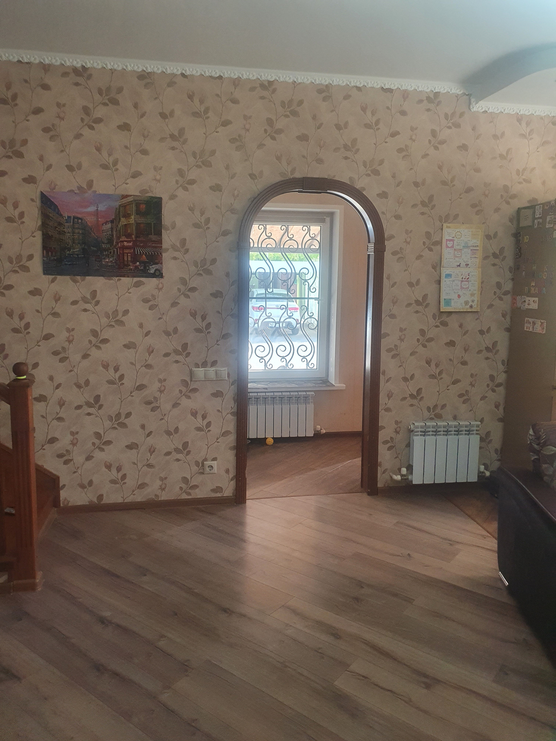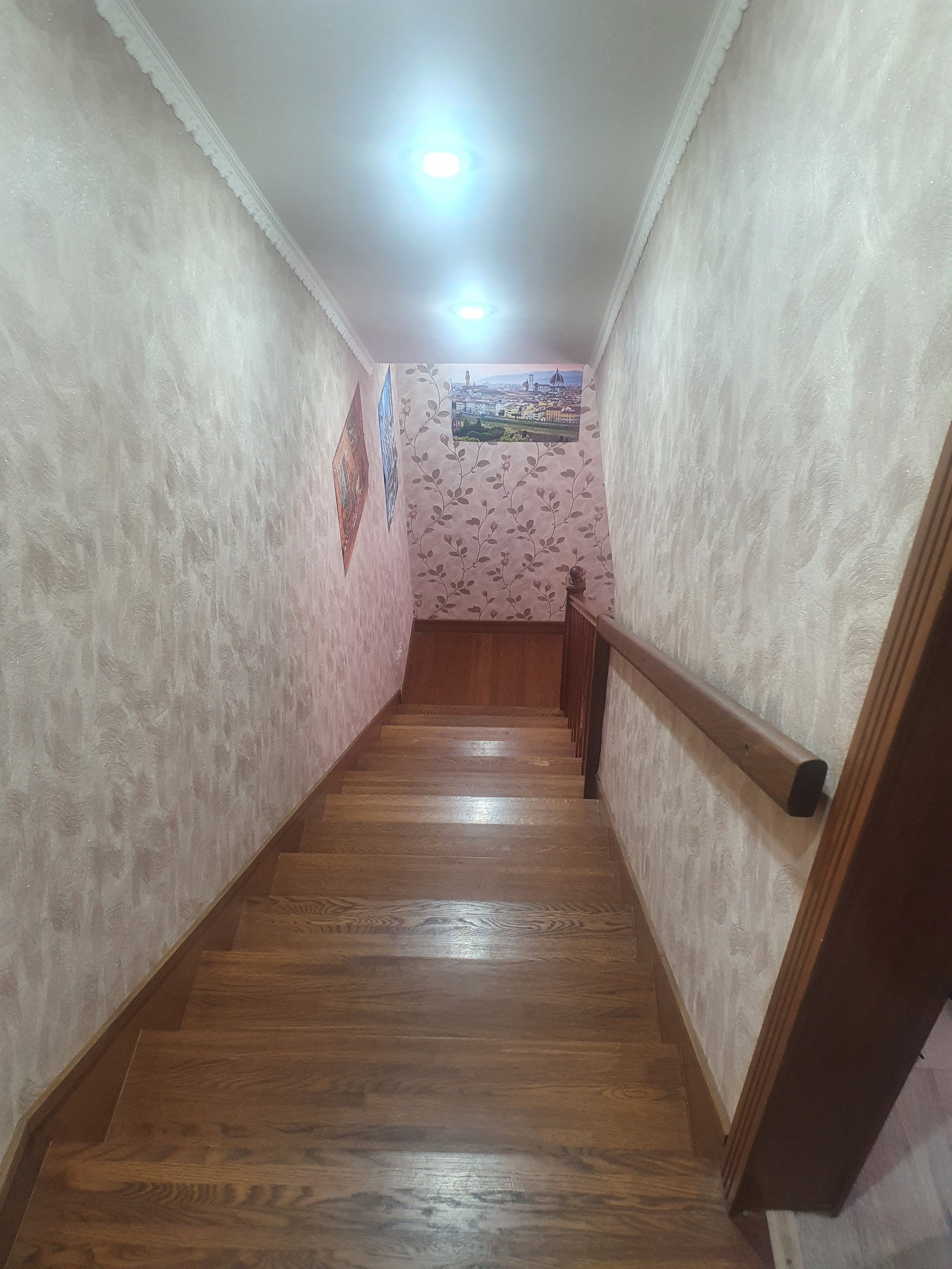 Первый этаж: студия 38 метров (кухня-гостиная с встроенной техникой: плита, духовой шкаф, посудомоечная машина), совмещенный с/у (душевая). Под лестницей место для хранения вещей. Длинная узкая прихожая с большим шкафом.