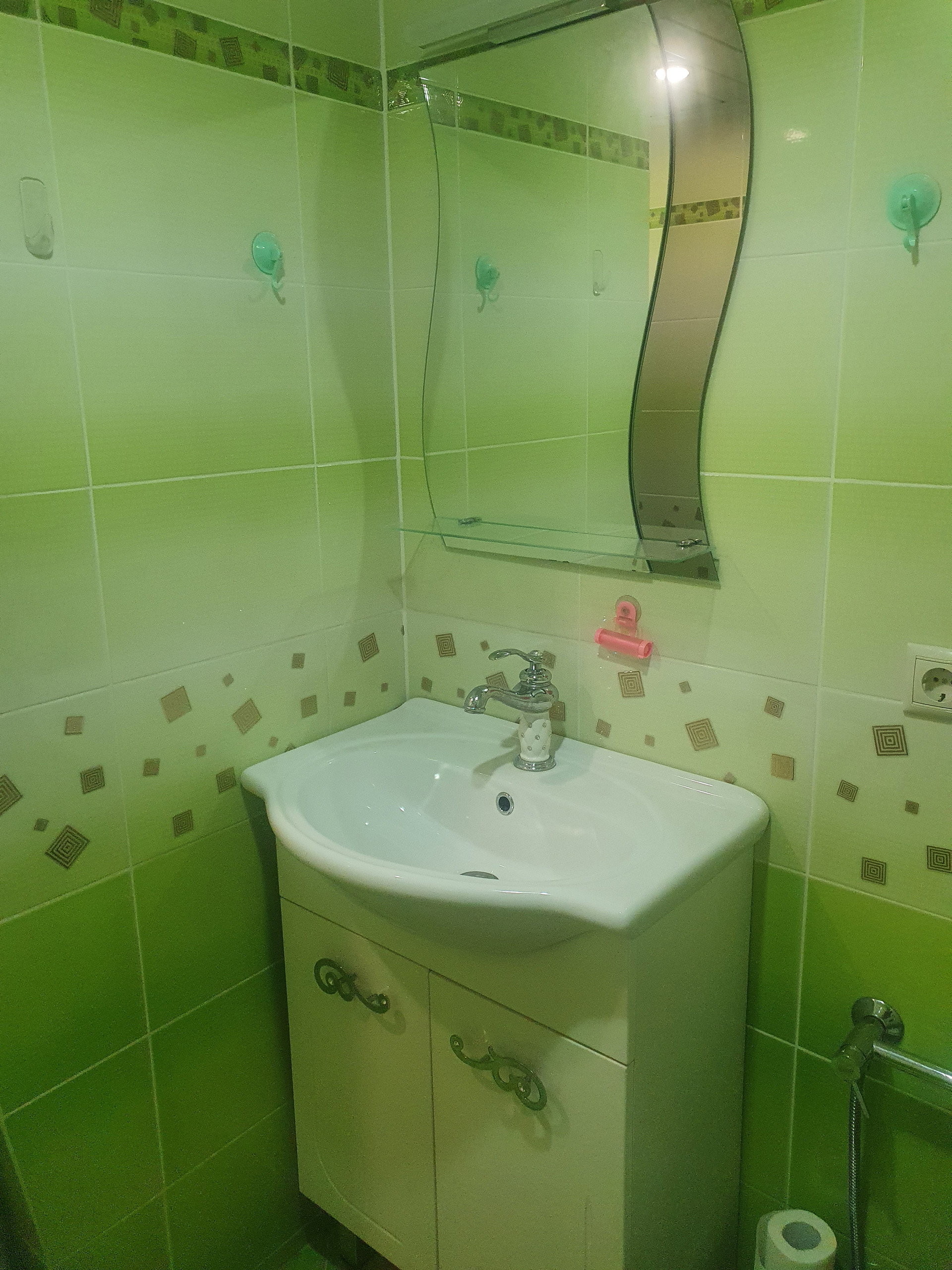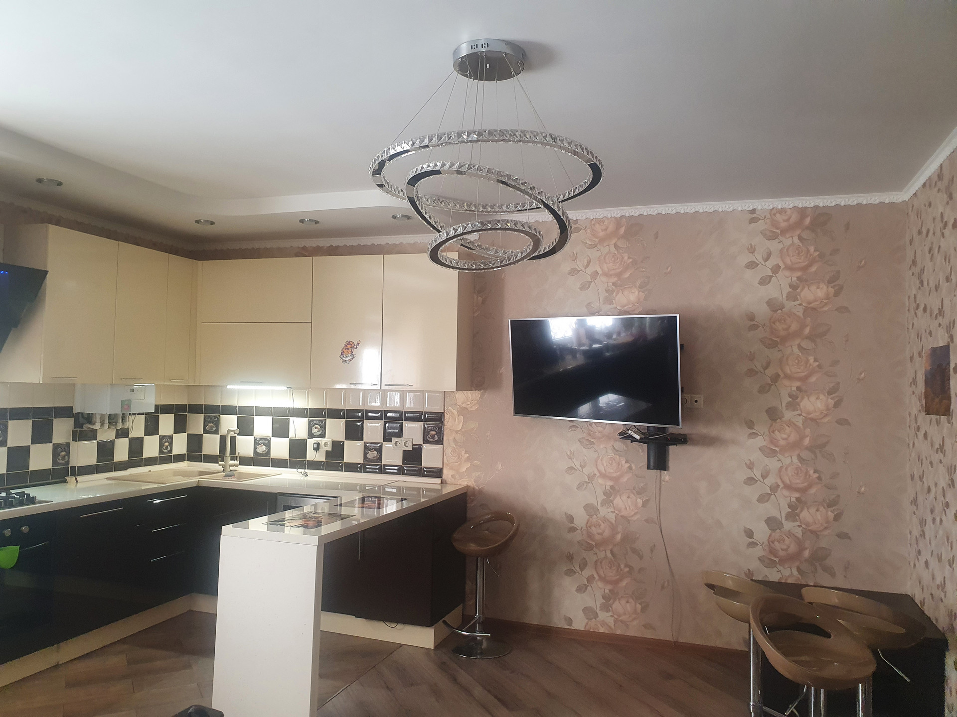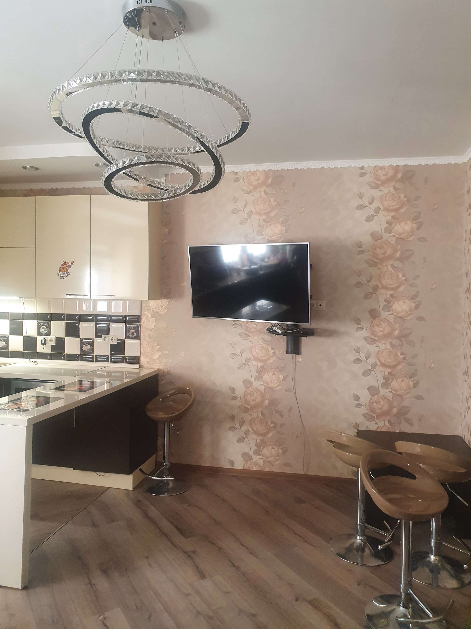Первый этаж: студия 38 метров (кухня-гостиная с встроенной техникой: плита, духовой шкаф, посудомоечная машина), совмещенный с/у (душевая). Под лестницей место для хранения вещей. Длинная узкая прихожая с большим шкафом.
