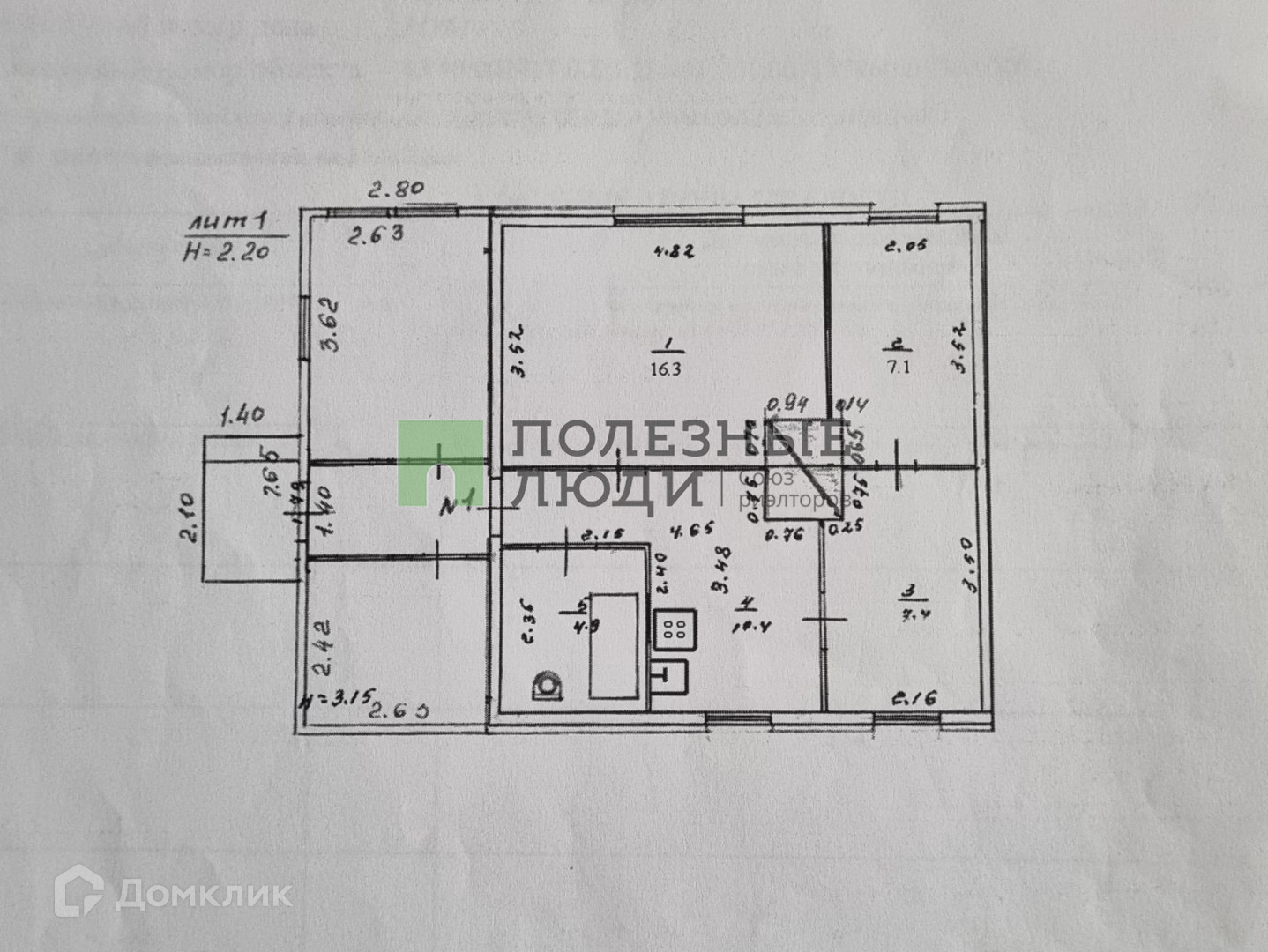 Дом: комнаты – 16,3 + 7,4 + 7,1 кв.м., кухня – 10,4 кв.м., санузел – 4,9 кв.м., 9,5 кв.м. – веранда (летняя комната), 6,4 кв.м. – хозкомната, высокие потолки – 2,8 кв.м.