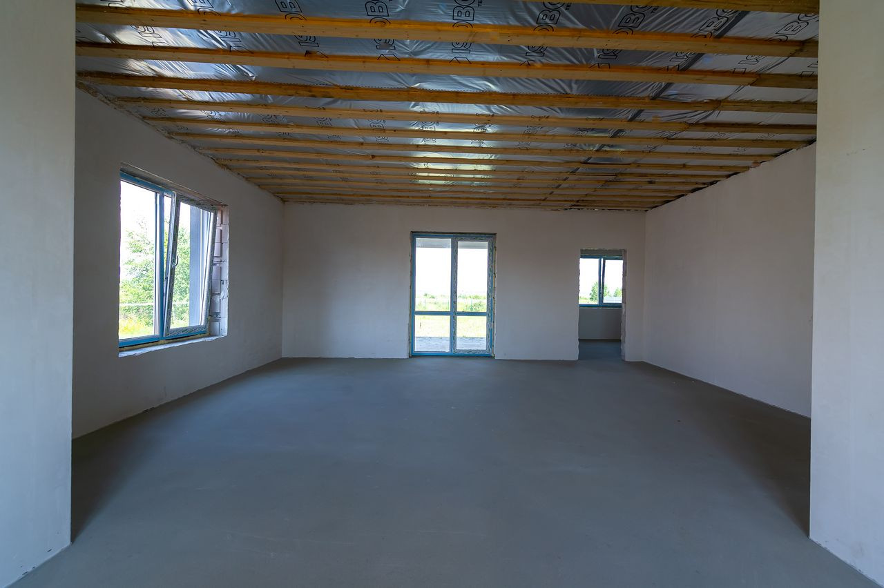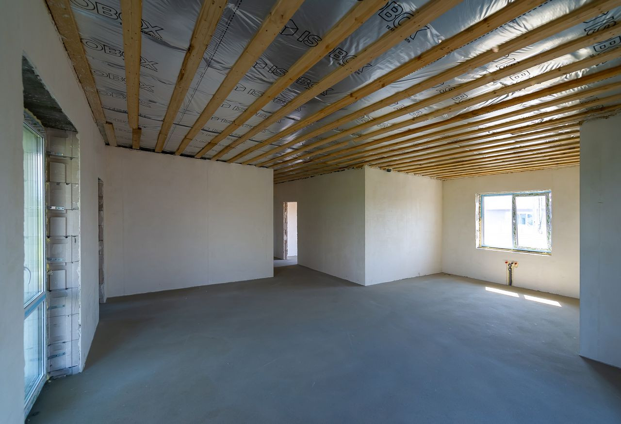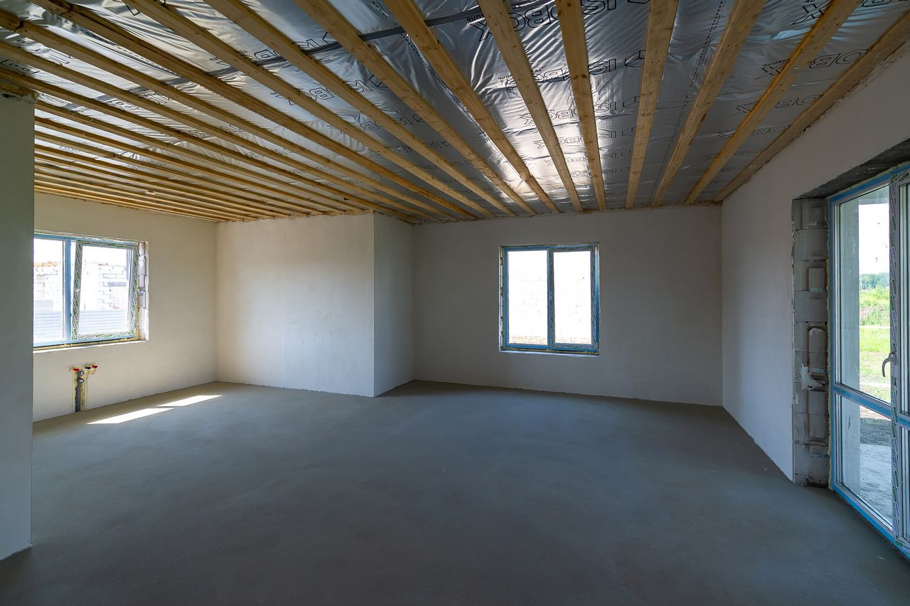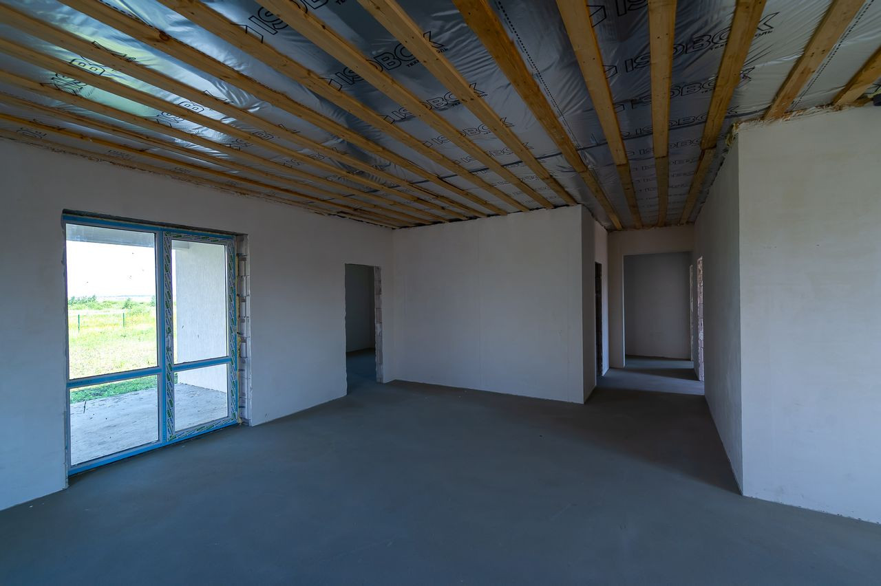 Дом в предчистовой отделке, что позволит сразу приступить к поклейке обоев, монтажу пола и т.д. (штукатурка «под обои», полусухая стяжка, водопровод, система отопления (водяной теплый пол от газового котла 24кВт), водоснабжения (скважина) и канализации (6,5 м3). Электричество введено в дом (3х5квт).