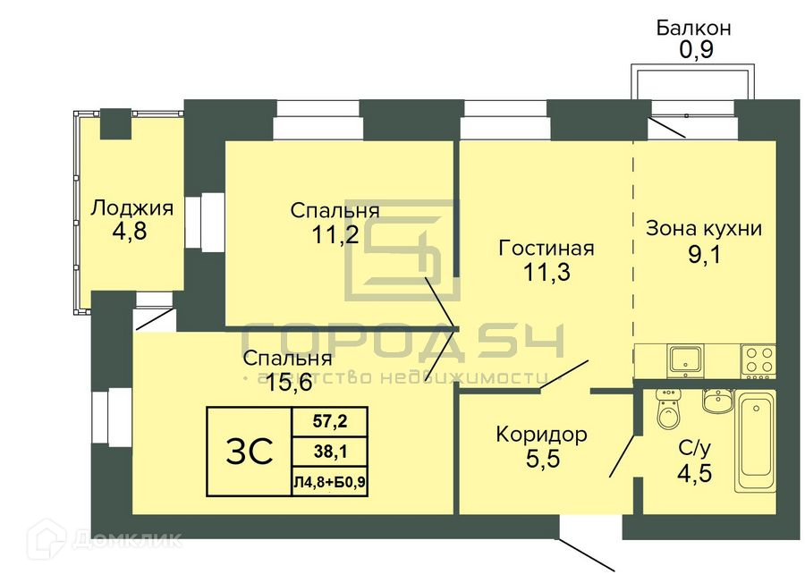 Общая площадь 57 м2