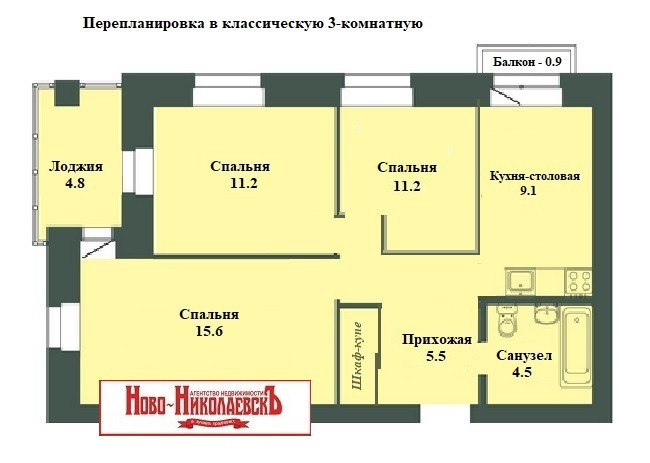 3-комнатная квартира, 60 м2, этаж 4 / 5, на продажу в поселке Садовом
