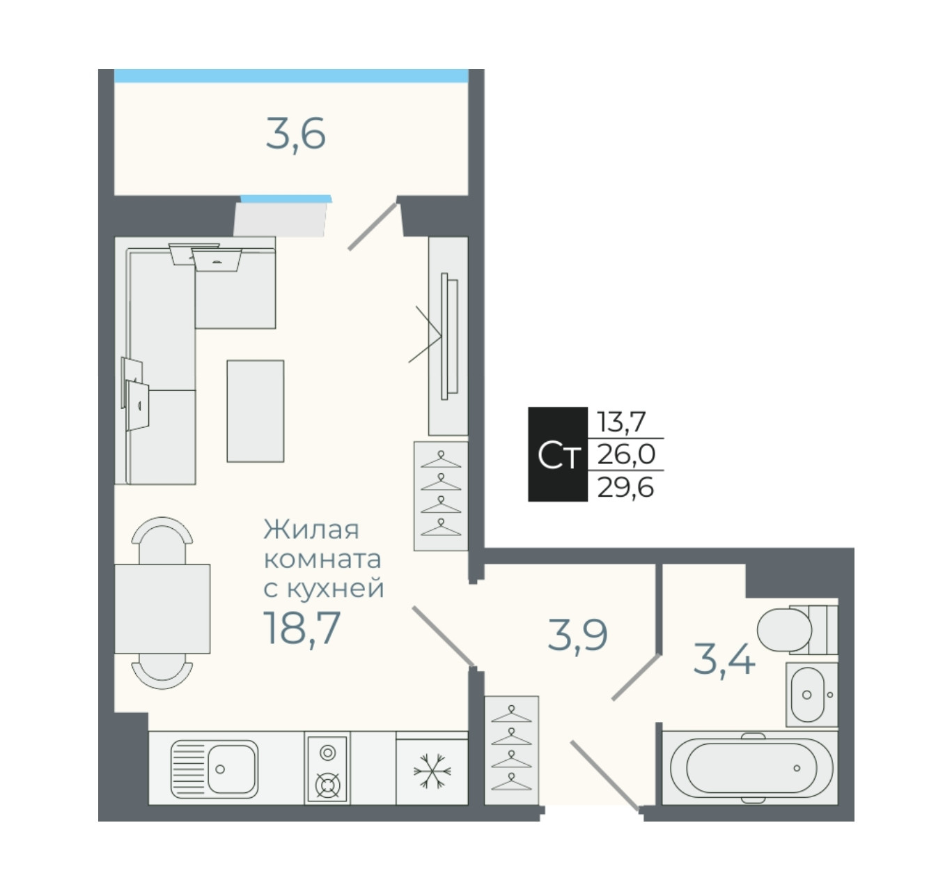 Общая площадь 29.6 м2