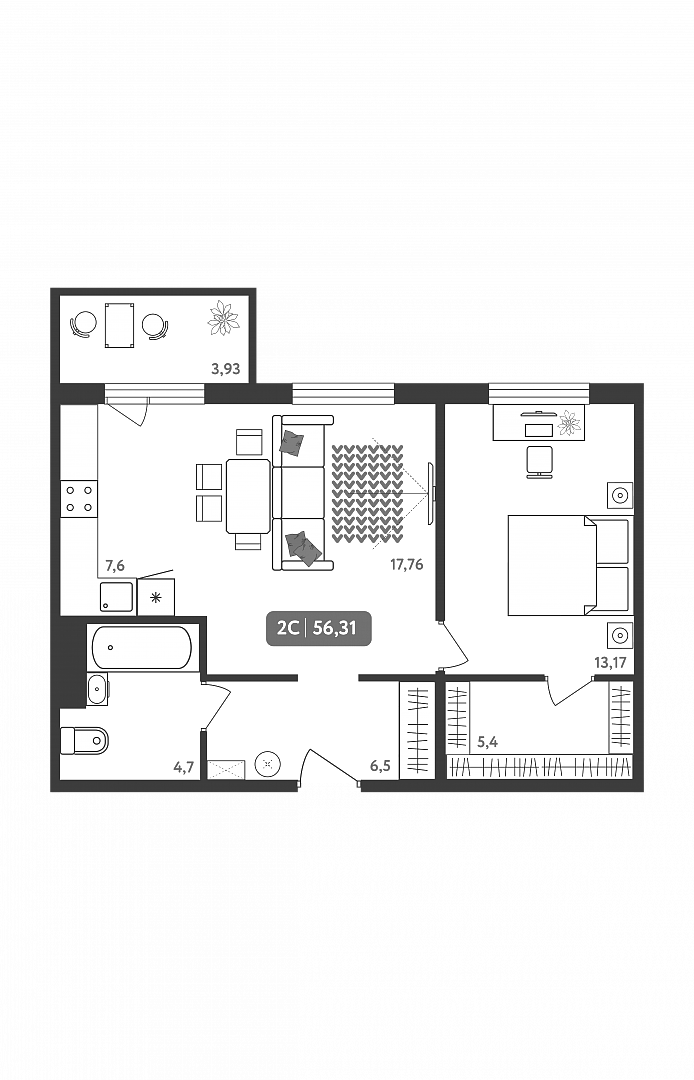 Общая площадь 56.3 м2