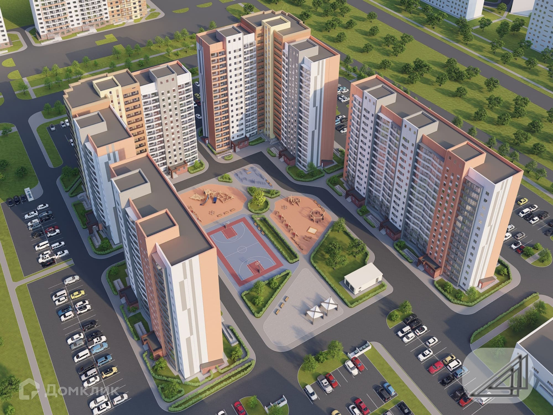 Хорошее благоустройство, большие дворы с детскими и спортивными площадками, стоянки для личного транспорта.