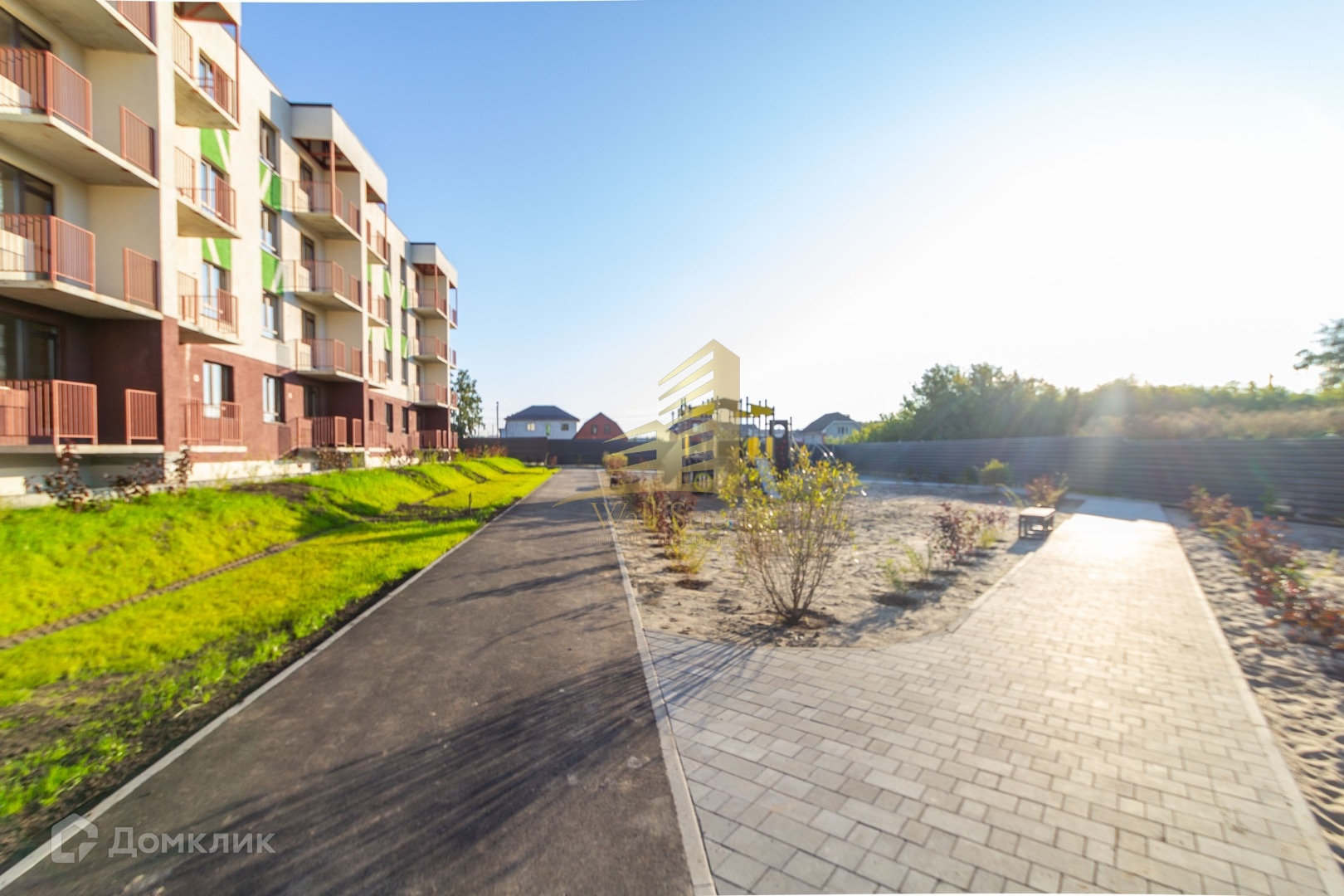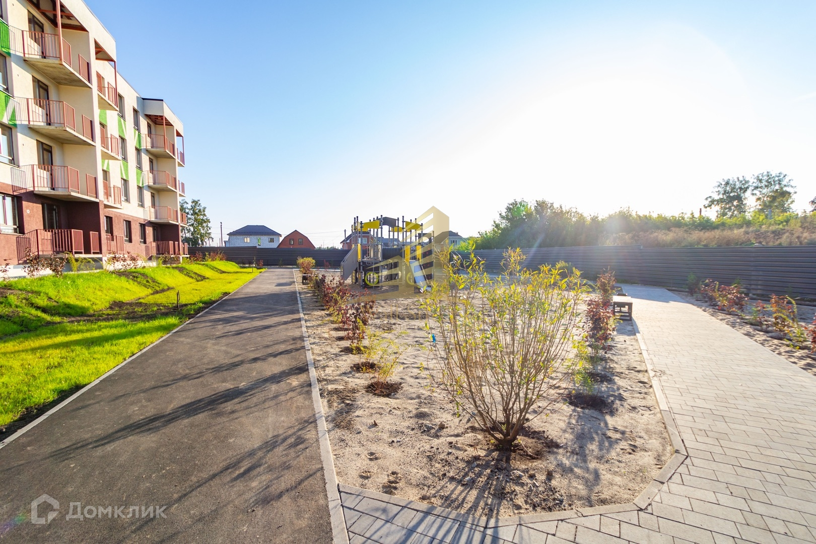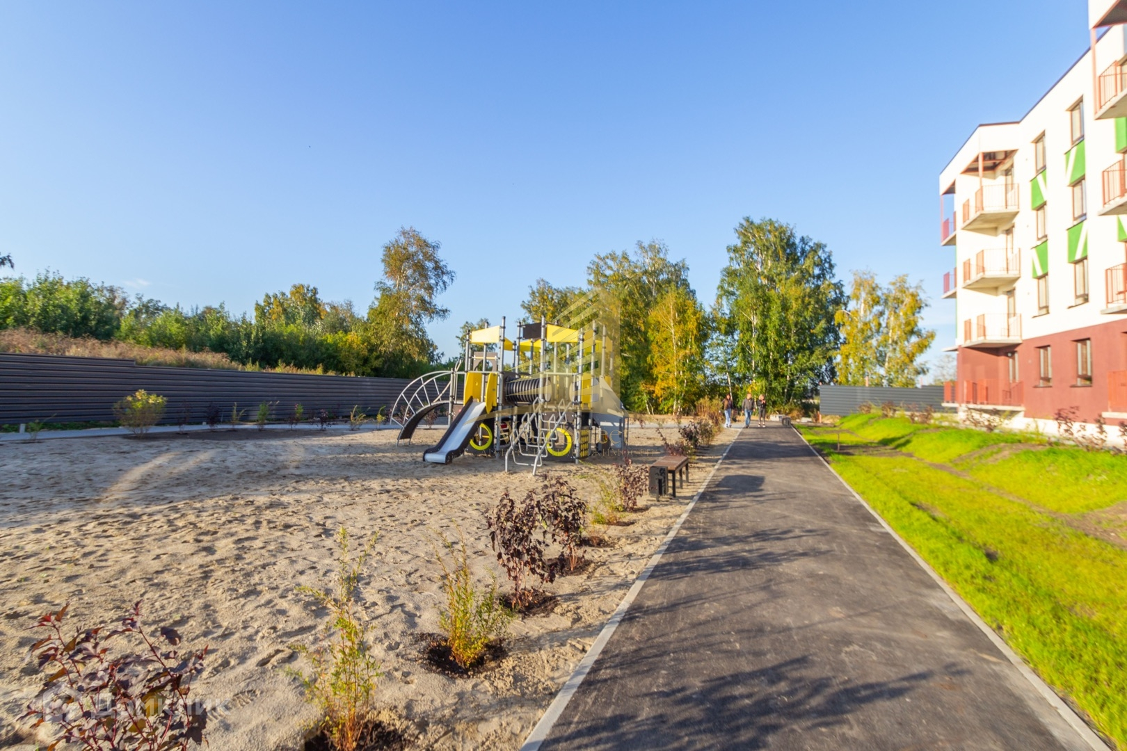 Красивая зеленая территория с пешеходными дорожками для прогулок. Есть детская и спортивная площадка.