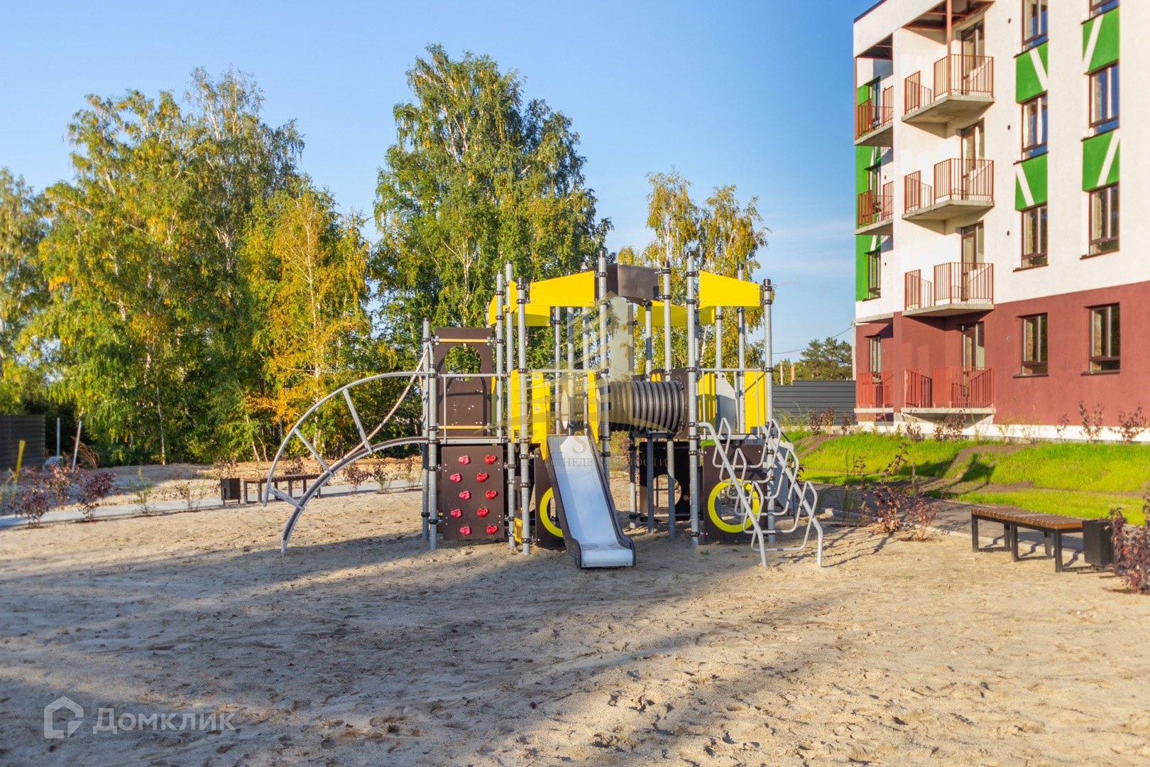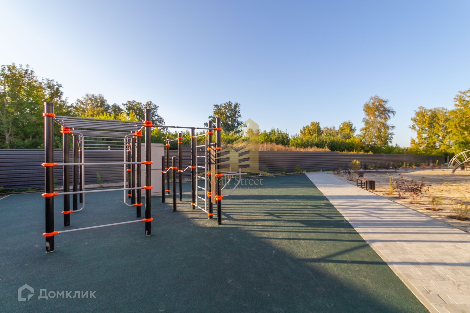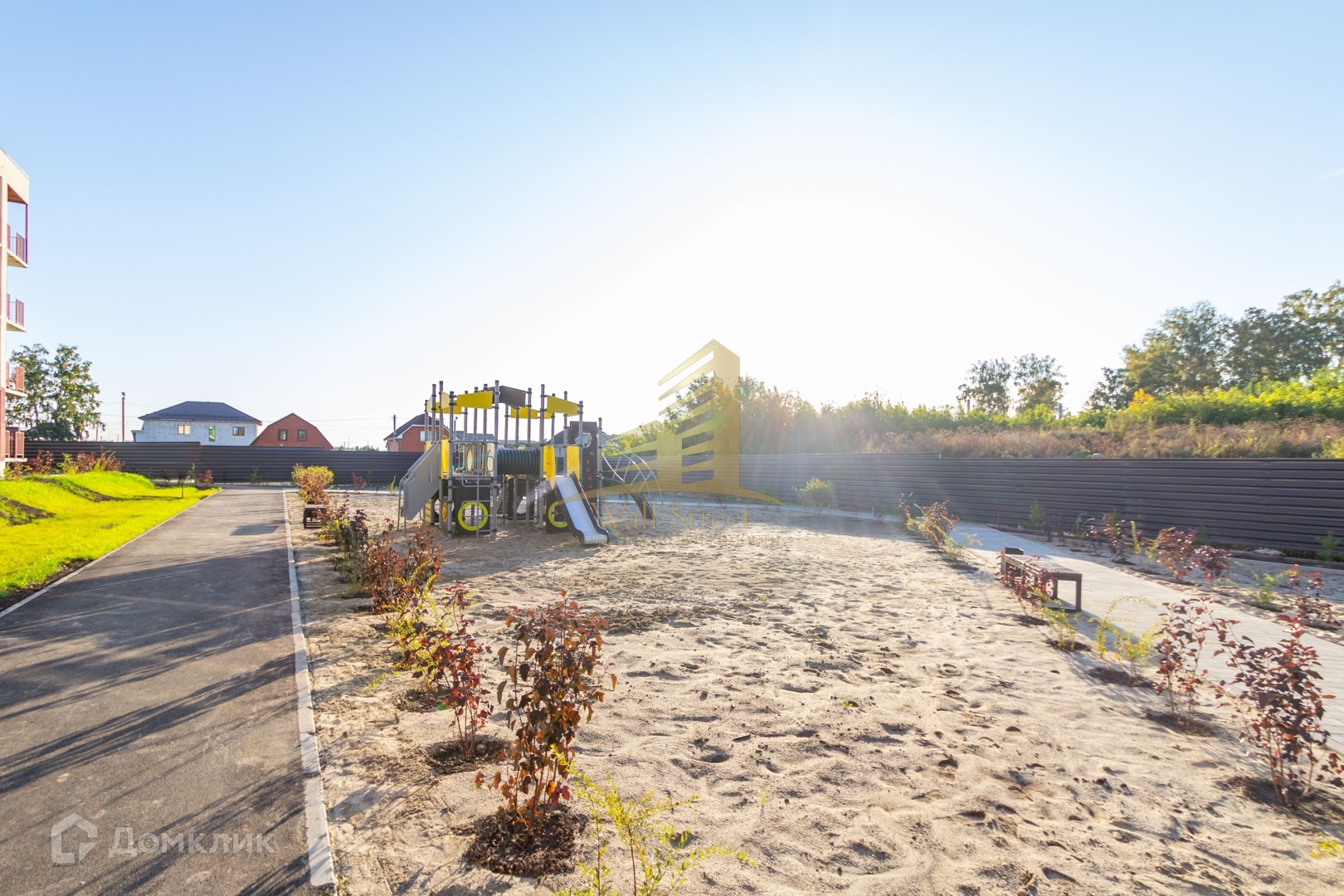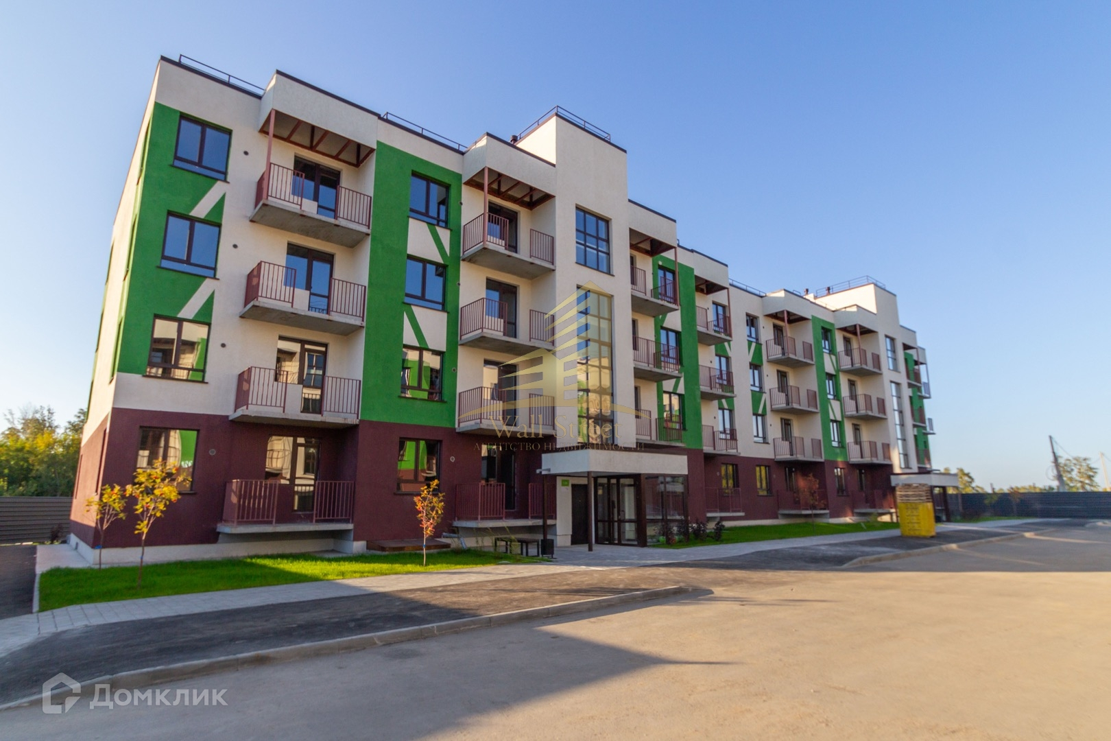 Красивая зеленая территория с пешеходными дорожками для прогулок. Есть детская и спортивная площадка.
