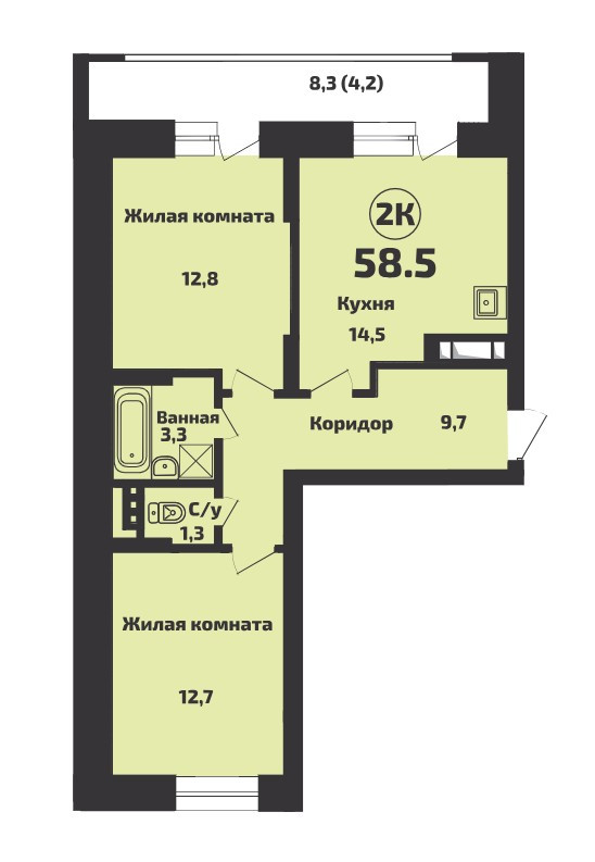 Общая площадь 58.5 м2