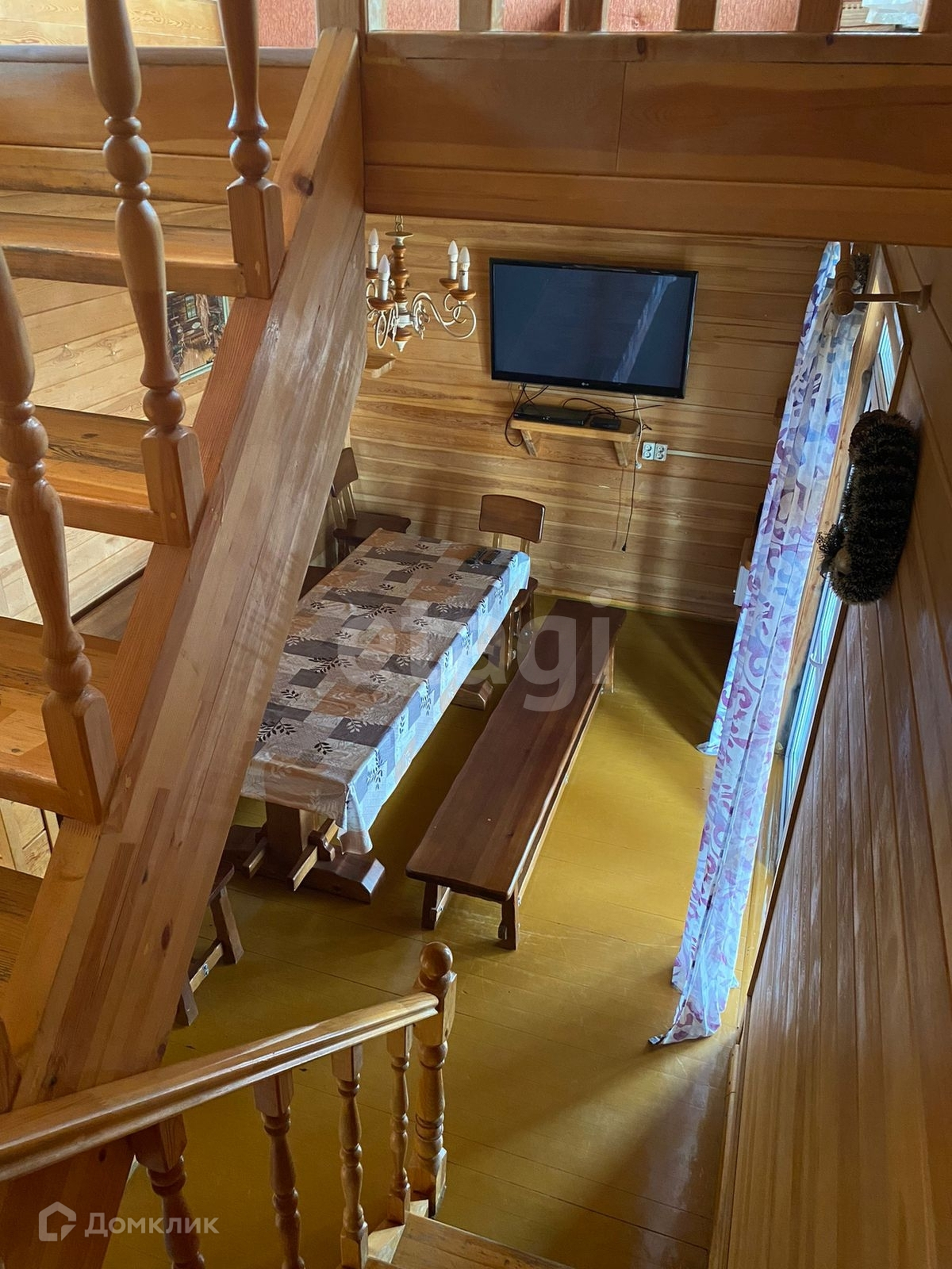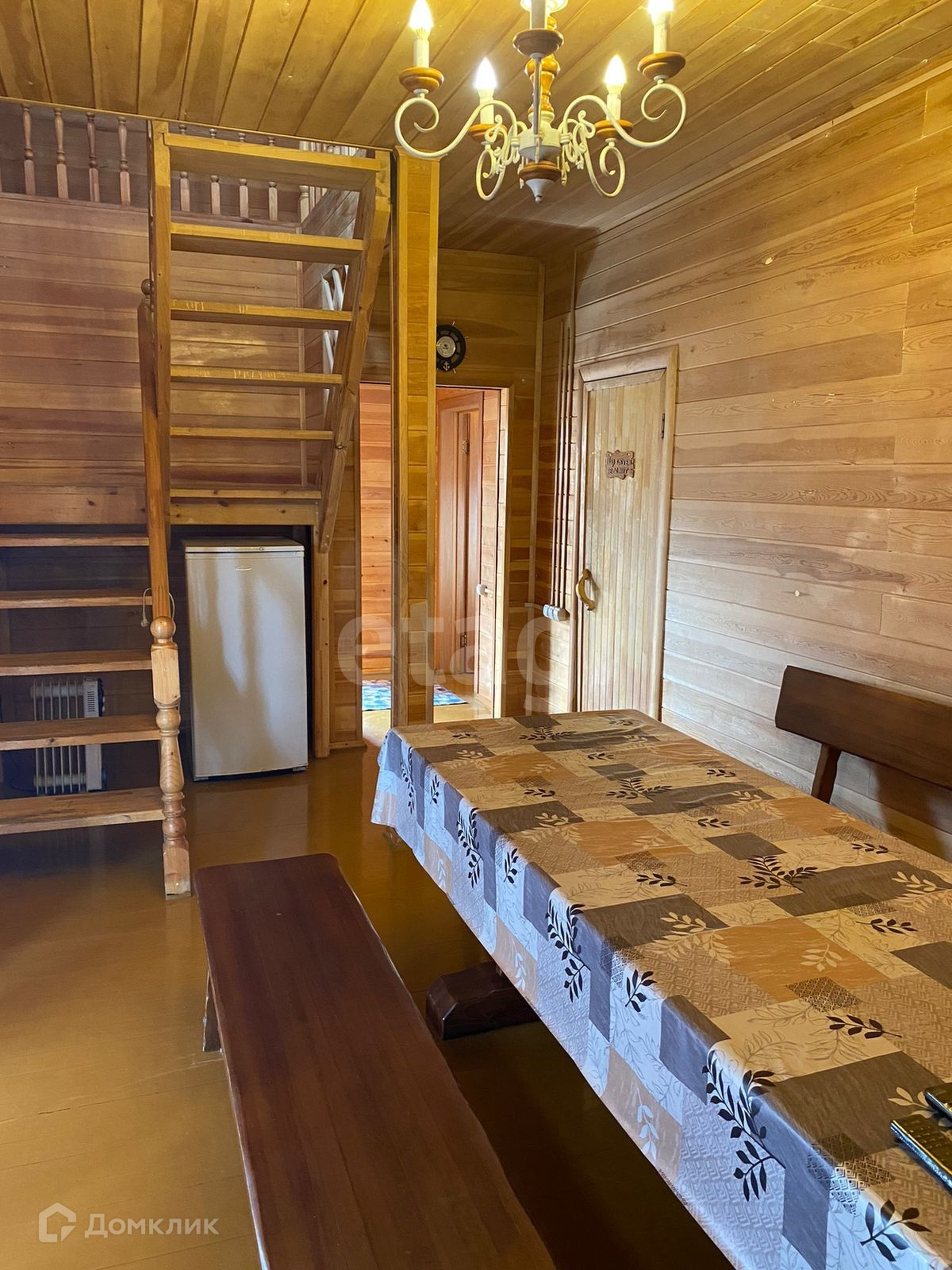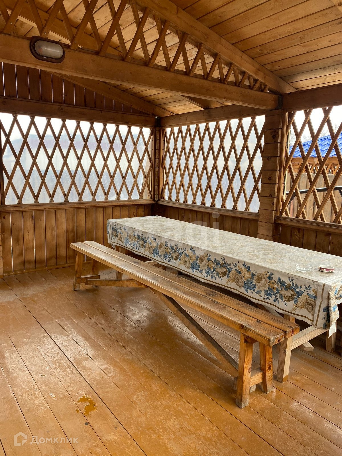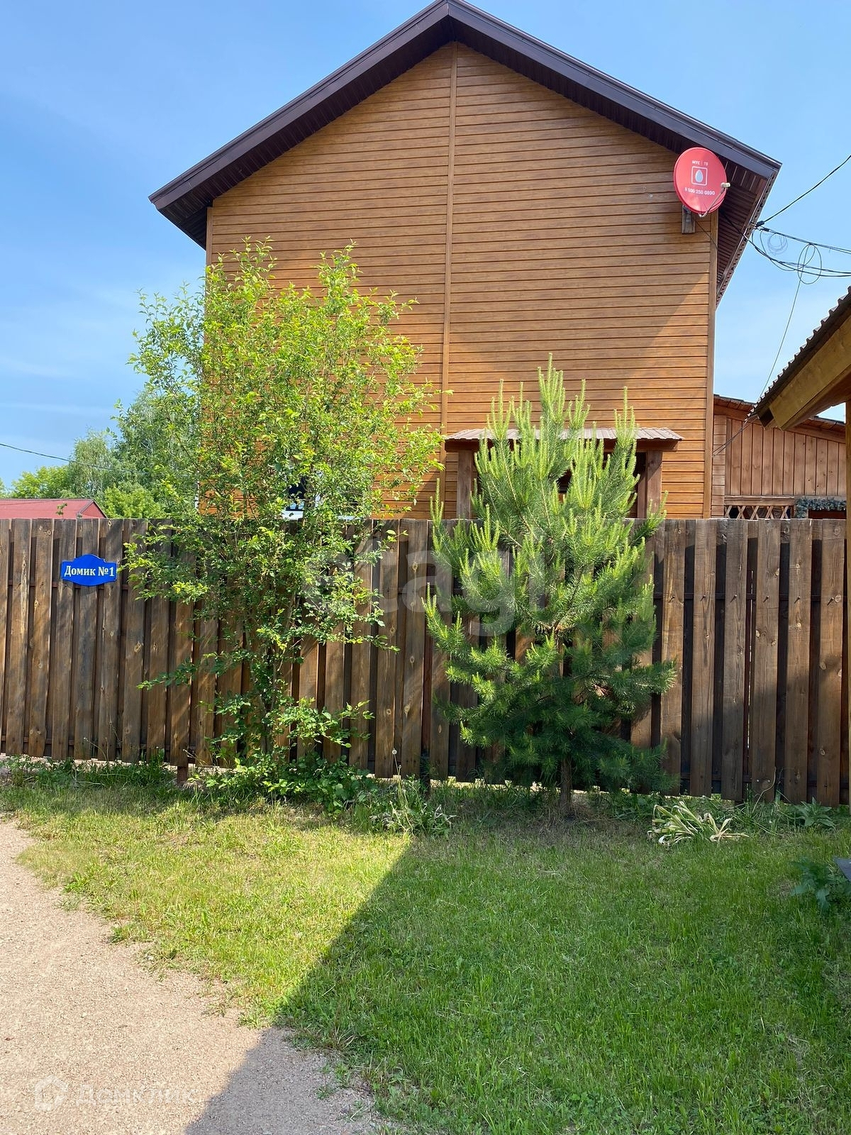 На первом этаже гостиная, санузел, душевая и баня; на втором этаже две спальни и холл с большим диваном. Есть небольшой дворик с беседкой и зоной для мангала.